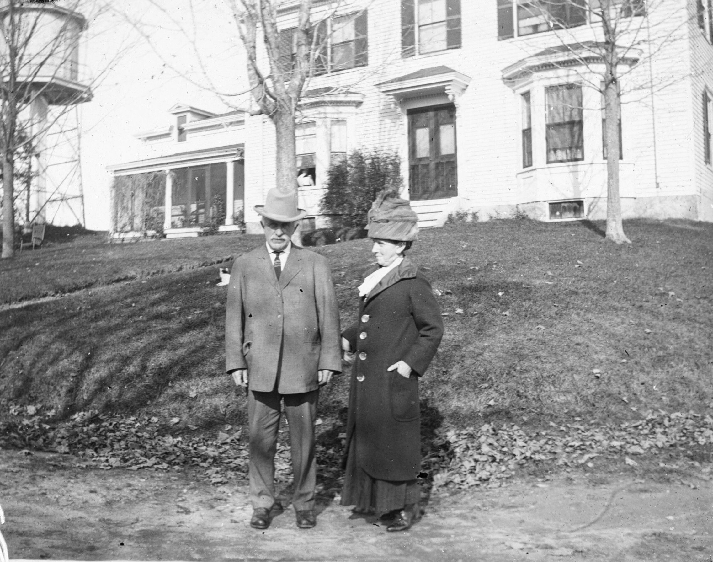 Glass lantern slide photo of an elderly couple in front of a house with a water tower. It is possible this house is the Cole house on Louden Rd. in North Saco and the elderly couple is Vivian Cole and Ella Winfred Cole Sawyer's parents, Albert W. Cole and Lucy F. Cole.
