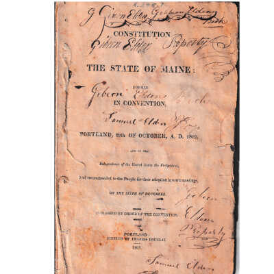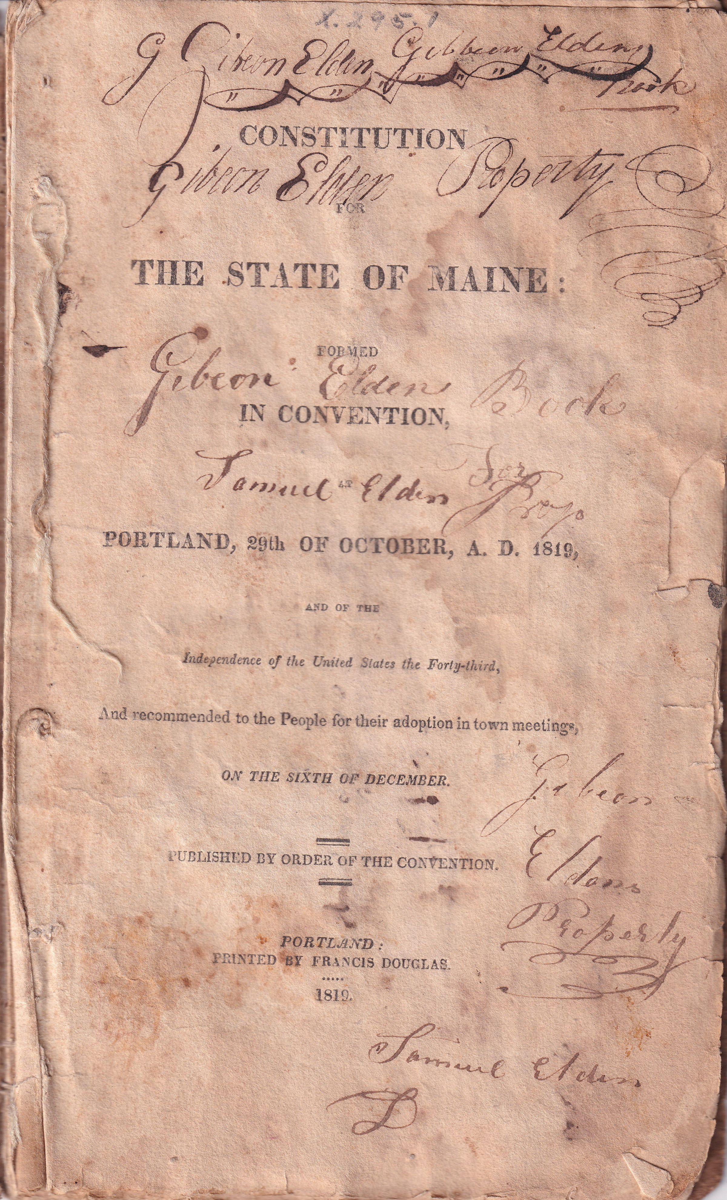 In July 1819, a successful vote for Maine separation was held, with a majority of support in all nine counties. The state constitutional convention met in Portland in October. It was approved by a large majority of the popular vote in January 1820. The new constitution had strong protections for religious freedom, had no property qualifications for voting, and allowed free men of African descent to vote, at a time when many other states were limiting the black franchise. However, like most state constitutions of the time, it denied the franchise to women, Native Americans, and paupers. This copy of the Maine Constitution was owned by Gibeon Elden of Buxton. Many local residents probably owned such copies. Benjamin Simpson wrote in his diary on December 6, 1819, "reading the Constitution of the state of Maine."