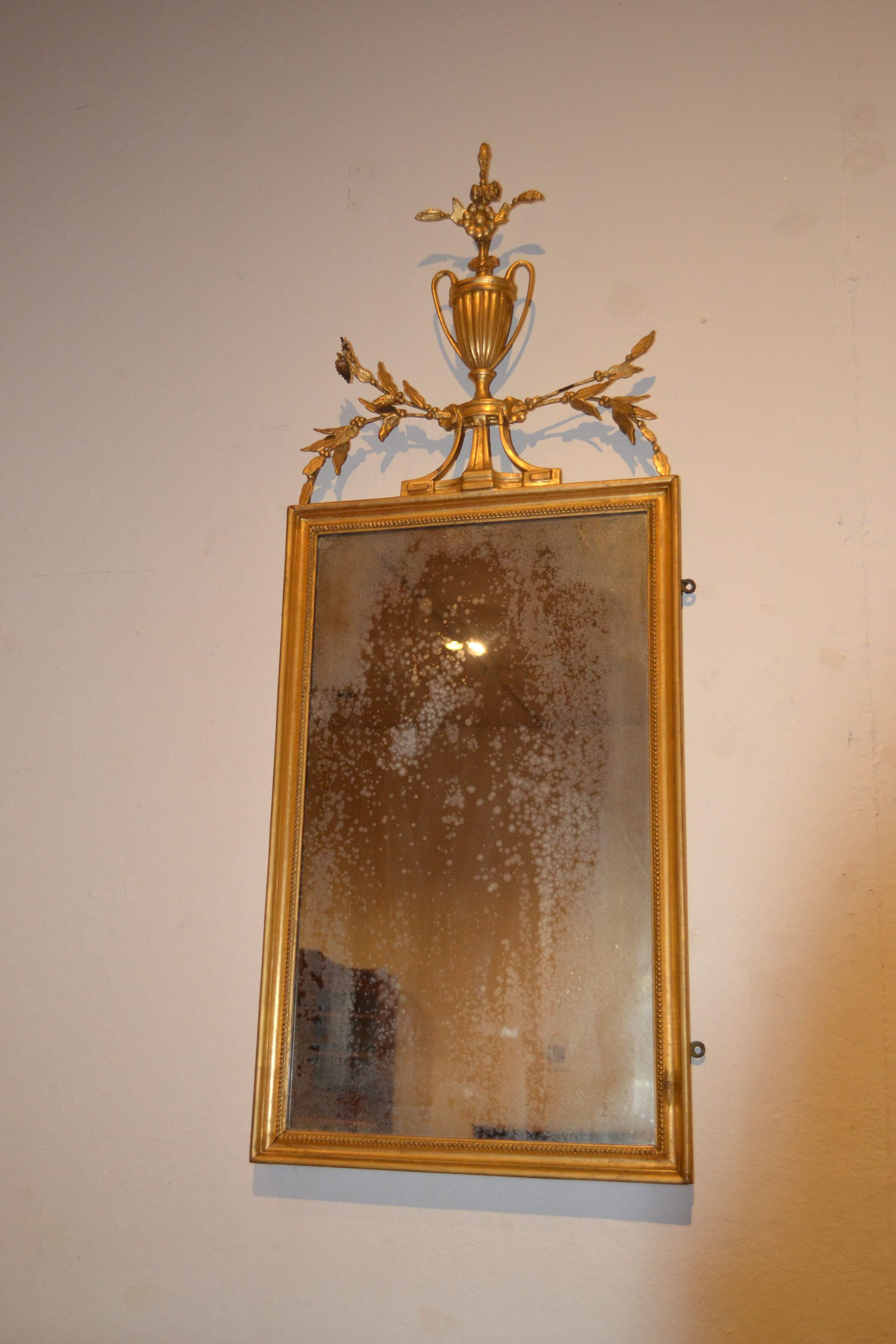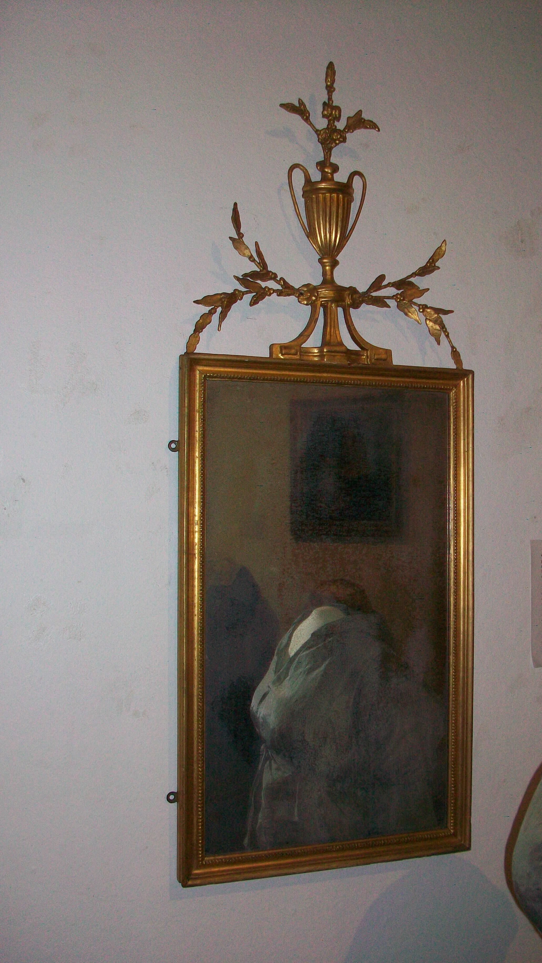 Beyond checking one’s appearance, looking glasses served an important purpose. The mirrored glass reflected available light and brightened dark areas in rooms before the advent of gas and electricity. The gilding on the frames and decorative elements at the top of the looking glasses also gleamed in the lower levels of indoor lighting common in the period. The elements themselves – the urn and branches – were prominent in the neoclassical design vocabulary; the vertical nature and shallow moldings of this pair of looking glasses correspond to the design aesthetic of neoclassical or early Federal period decorative arts.