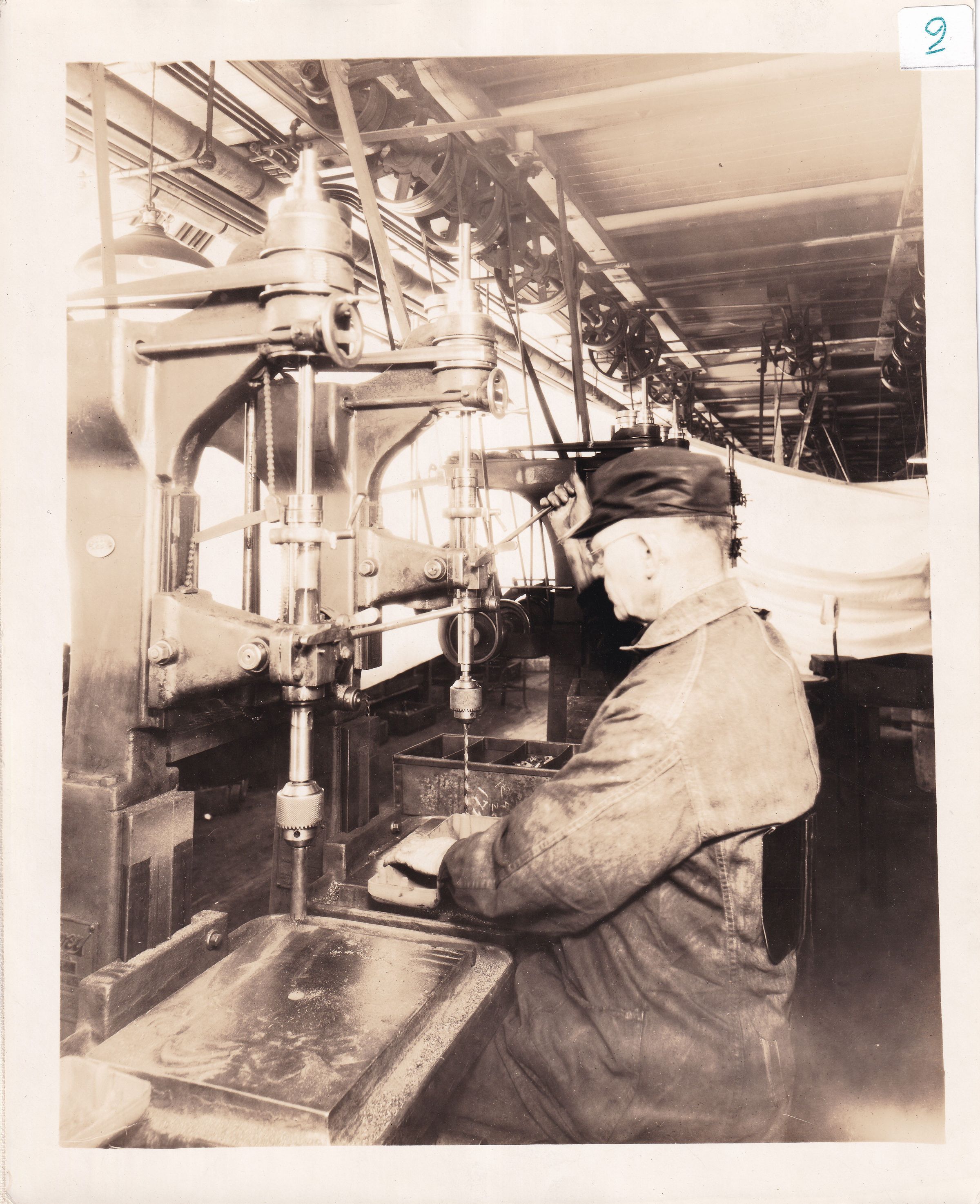 A man working at a drill press in the Saco-Lowell Shops, which were usually lined up in a series so that multiple functions could be easily performed at nearby stations to speed up production and minimize handling of parts.Made/Created