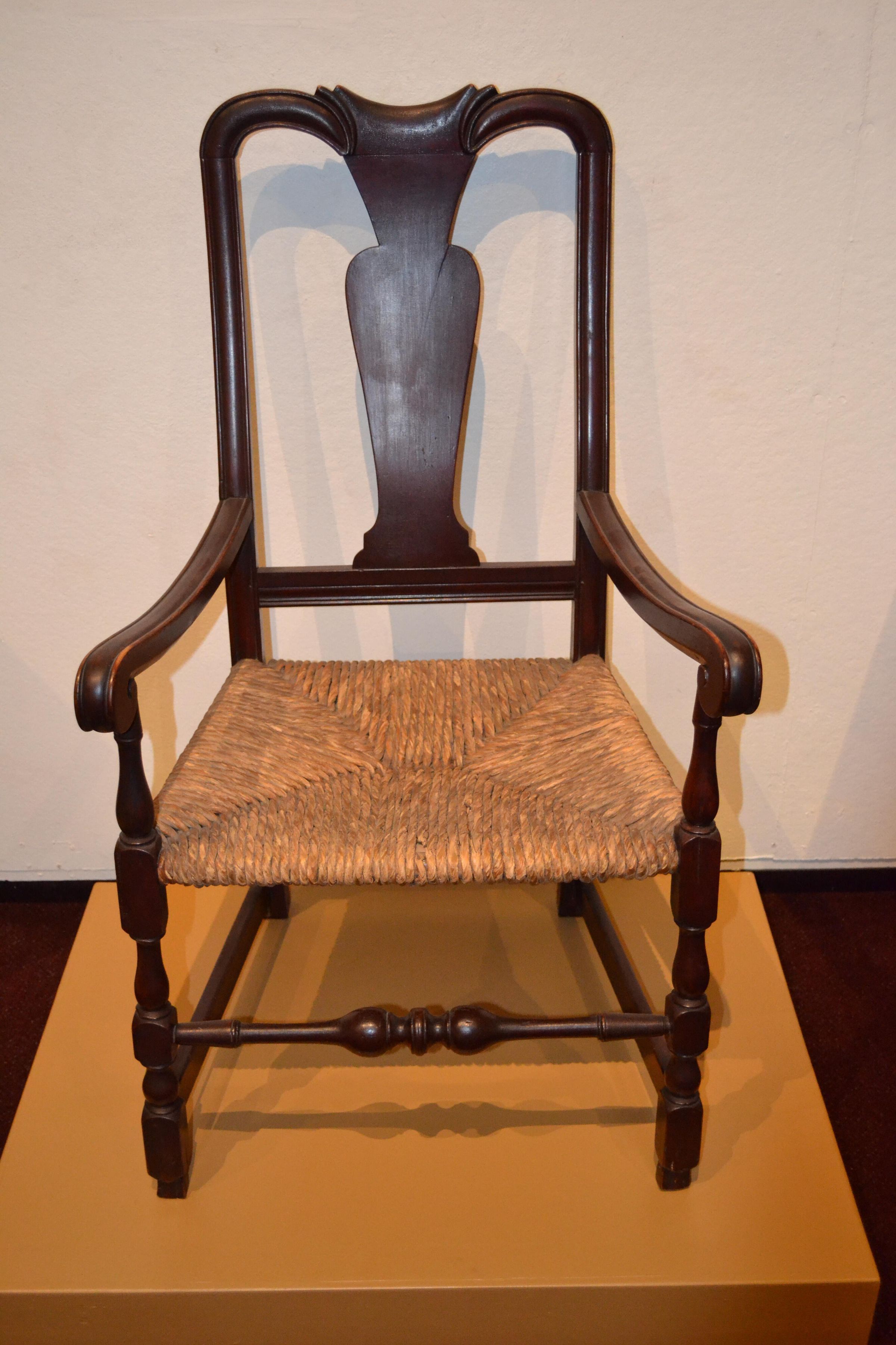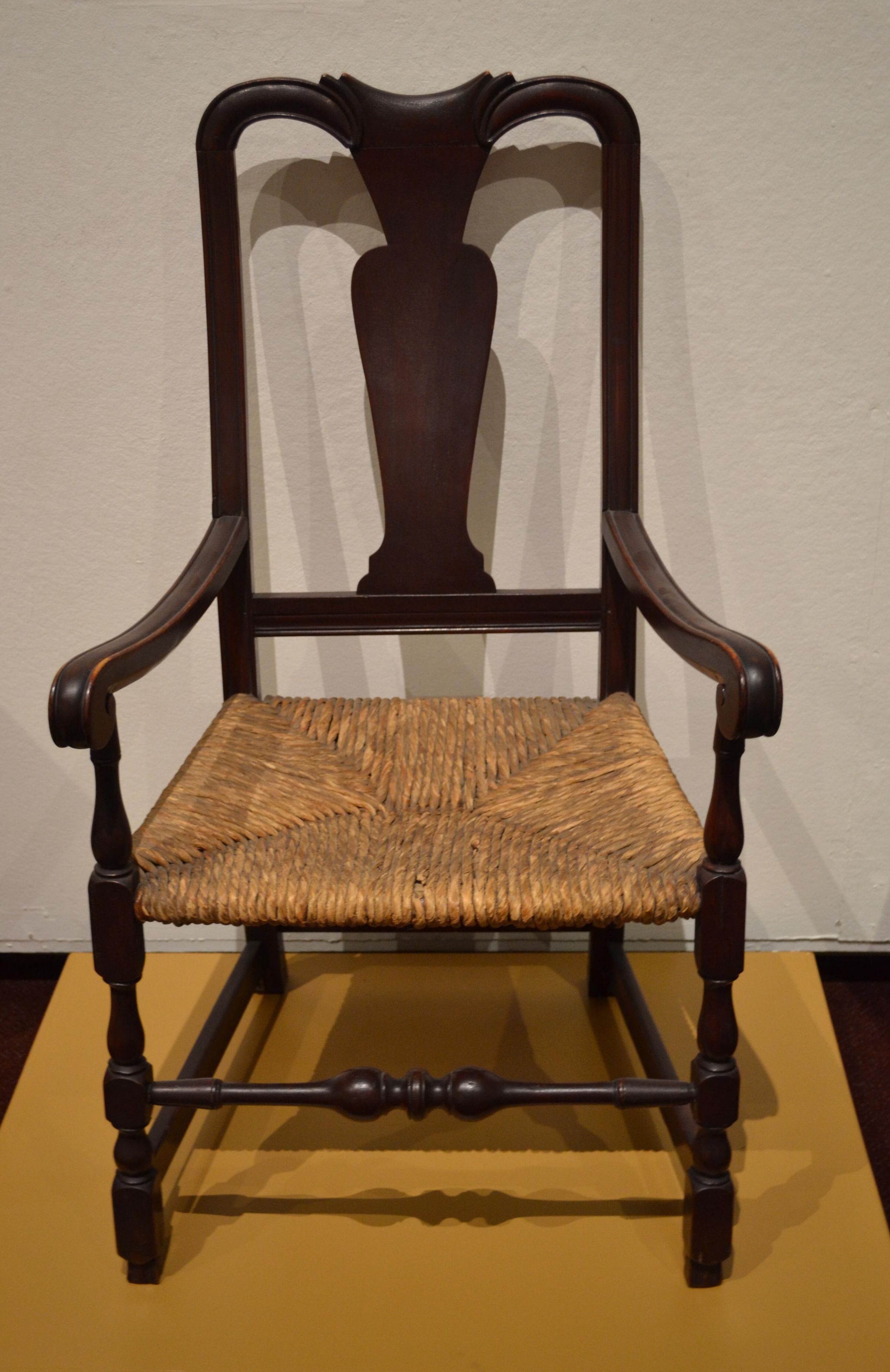 It is difficult to pin down precisely where this chair was made as the form and features are common. The shaped back of the chair, referred to in the 18th century as a “crooked” back was drawn from Chinese fashion brought to London along with porcelain and the introduction of tea and tea-drinking. The yoked crest rail and the vase-shaped splat are also elements of the Queen Anne style but the turned legs and the carved “Spanish” front feet are remnants of an earlier fashion. The rush seat was an alternative to upholstery; it could have been fabricated in a town which did not have the services of an upholsterer, or the seat may have been rushed in a larger urban center where several tradesmen practiced and consumers could choose the look and materials that suited their needs and that they could afford.