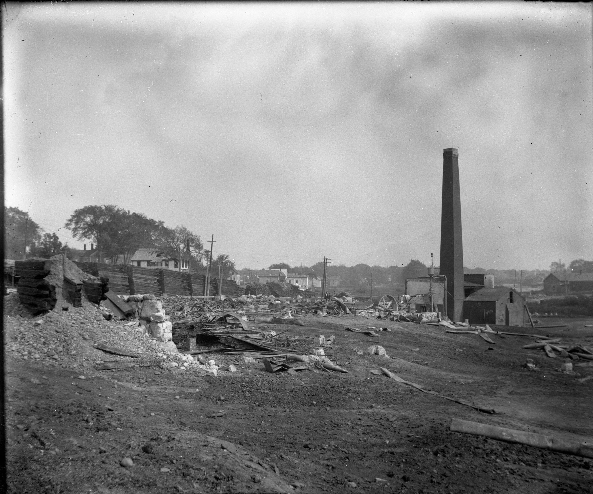Glass plate negative photo of the aftermath of the 1908 Somesville fire in Saco.