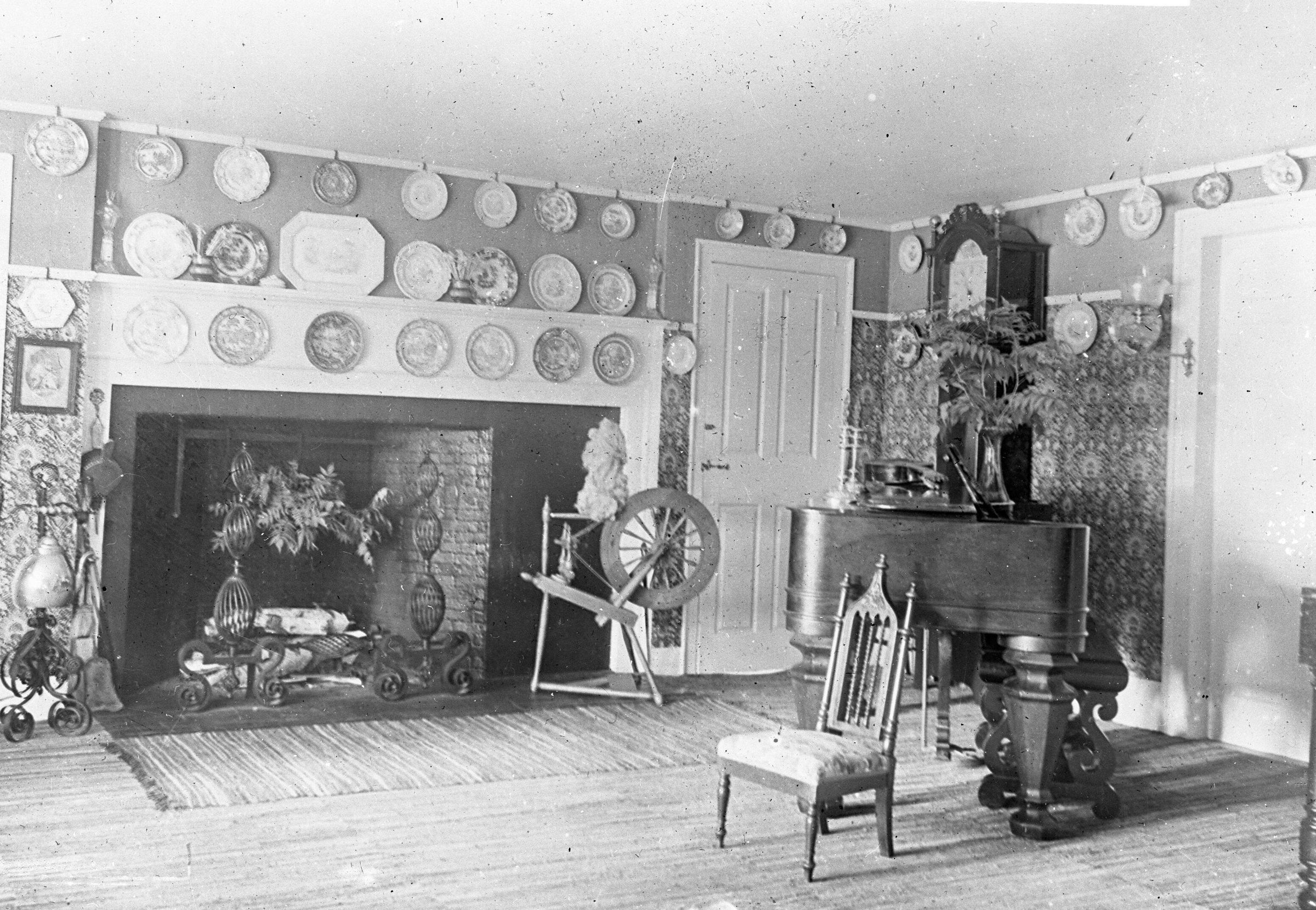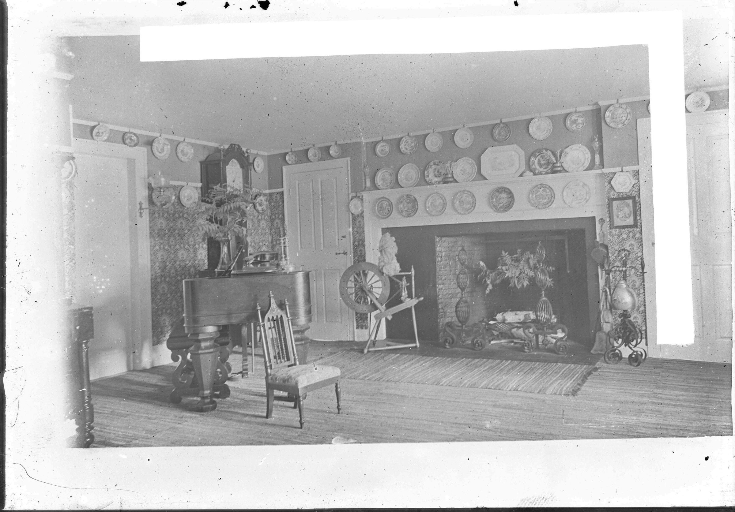 Glass plate negative photo of the interior of the Quillcote house, author Kate Douglas Wiggin's residence in Hollis, Maine. The back side of the negative has a section of a postcard pasted on. "Good Neg" is written in pencil on the postcard section. The photographer Bradbury was likely sizing these photos to create postcards. This image of "The Seven Doored Sitting Room" has appeared on postcards. Many of these postcards of Quillcote are still widely available today and sold by antique ephemera dealers.Made/Created