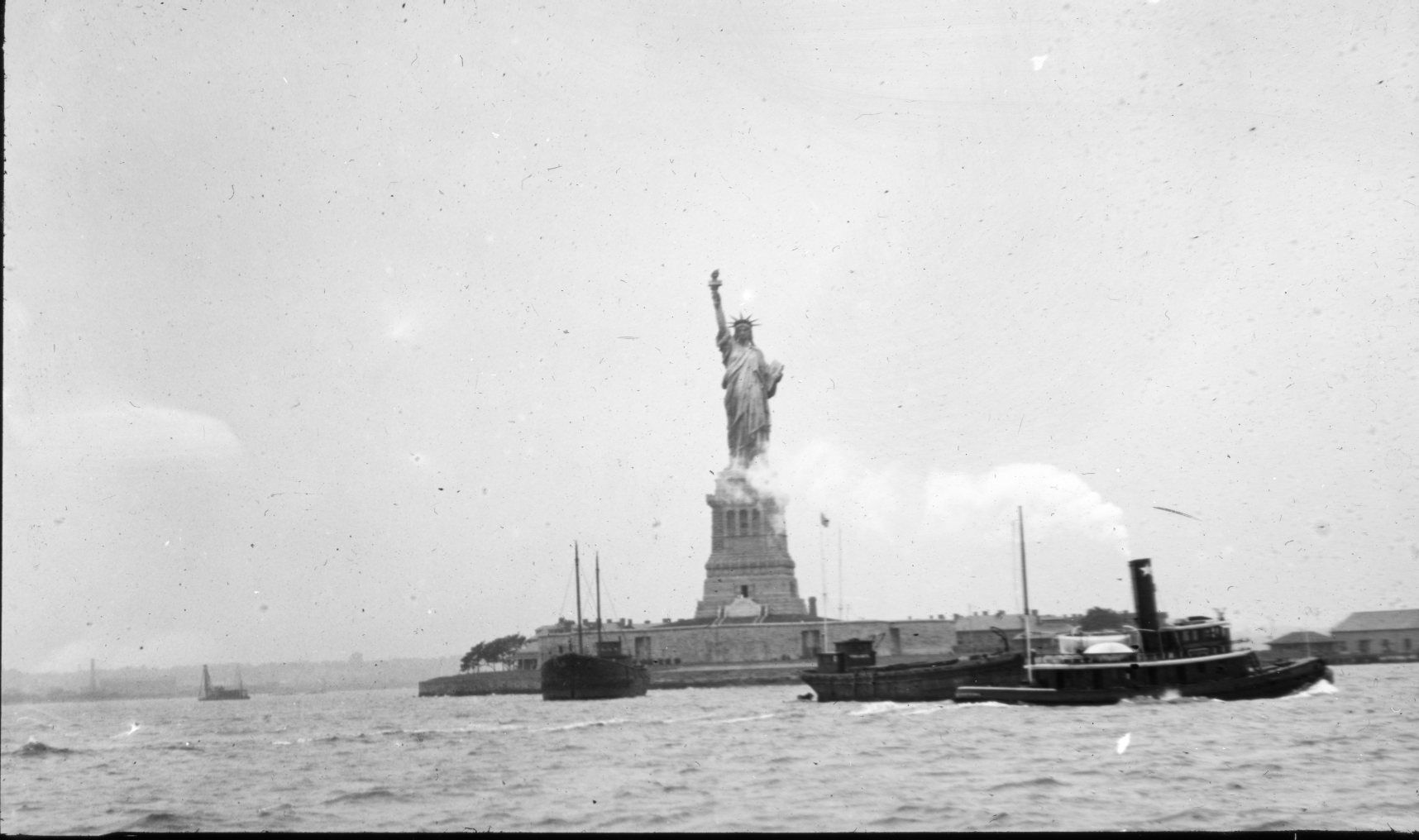 Glass lantern slide photo of the Statue of Liberty in New York, NY. "Liberty" is written on the label on the slide.