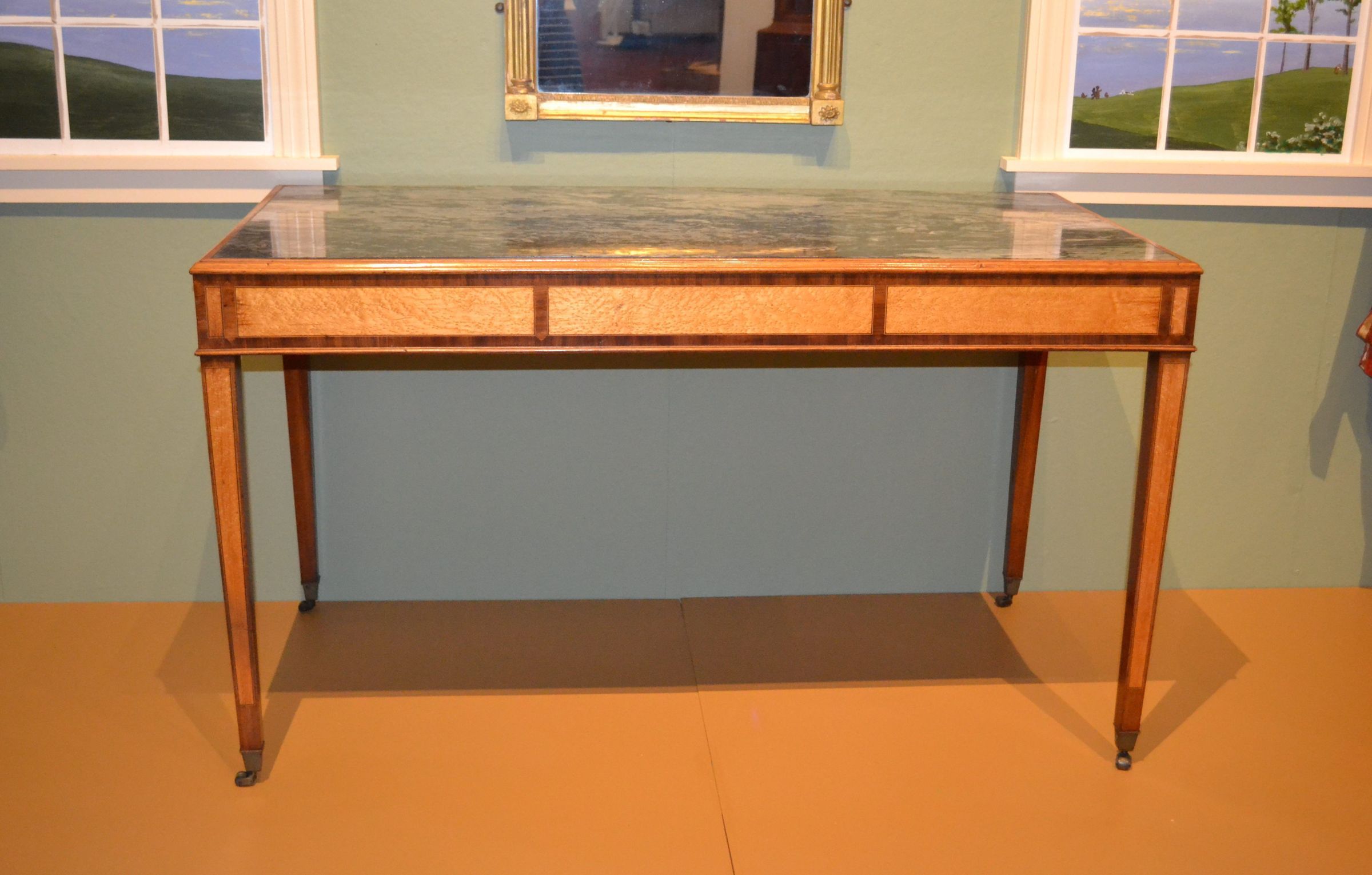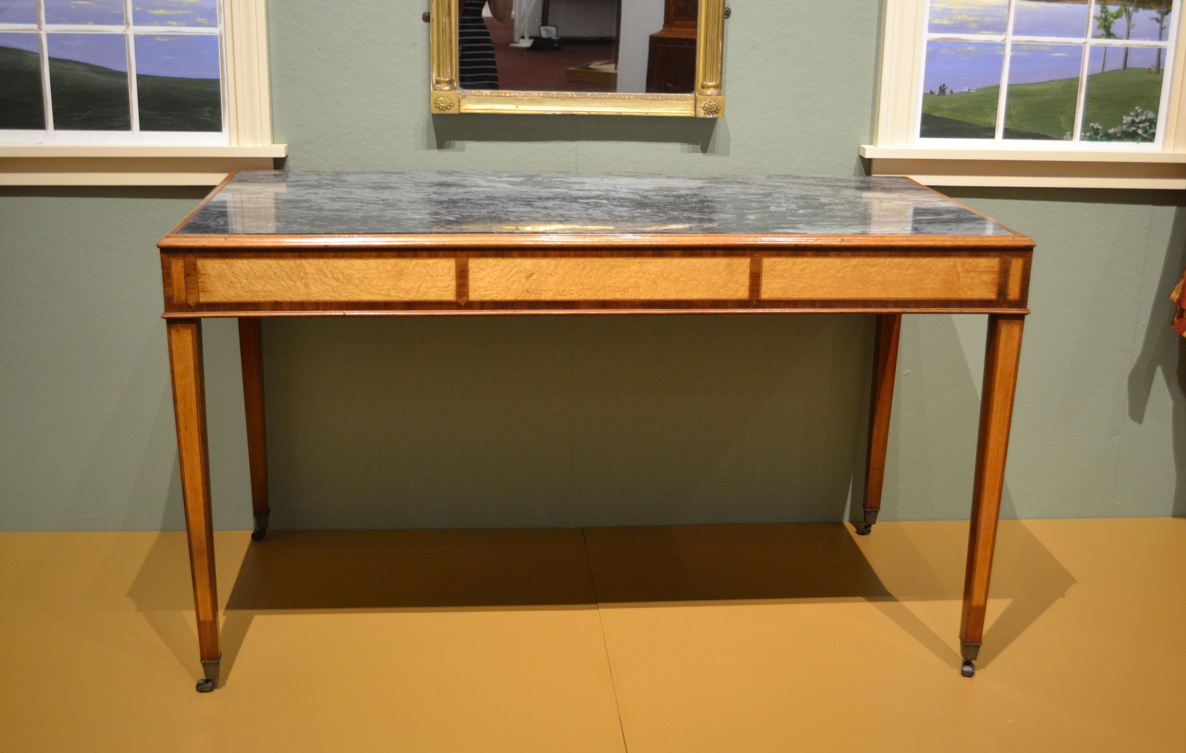 In his Cabinet Dictionary (1803), Thomas Sheraton defined a pier as the "part of a wall which is between the windows." Pier tables were intended for display, much like sideboards, and were located in formal rooms used for entertaining. It was customary to hang a looking glass above a pier table. This table probably belonged originally to Jonathan and Hannah Scamman Tucker of Saco, who married in 1803 and began building a large brick house in town the following year. While we have no specific documentation of the Tucker's purchase of this piece, we do know that they, like other prominent Saco families, acquired fashionable furnishings from both local and Boston craftsmen and retailers. The marble top may have been purchased locally. Imported Italian marble was available in both Boston and Portland, where stonecutter and sculptor Bartlett Adams advertised in 1800 that he was selling "a few Italian marble table slabs." Since marble is impervious to alcohol, it makes an excellent serving surface.