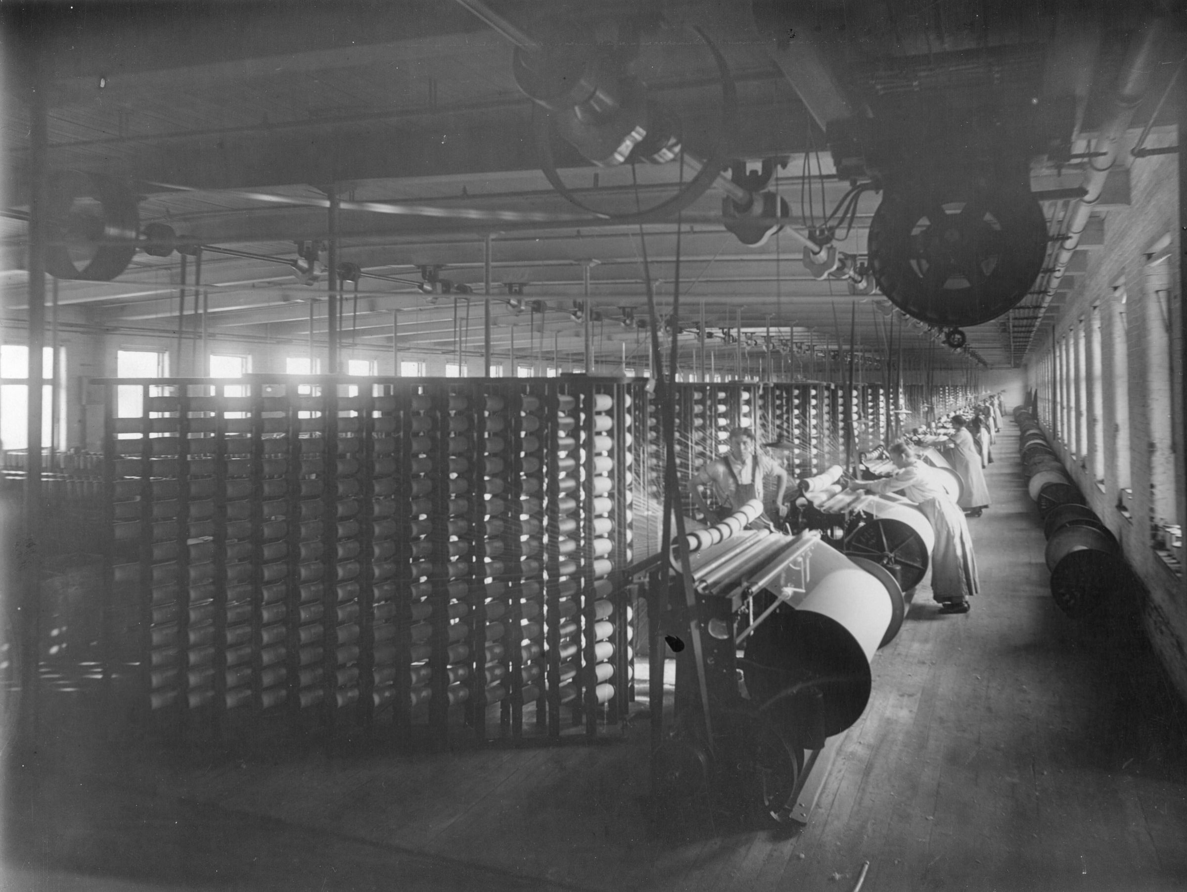 Photograph of workers in the warping room in the Laconia Division of the Pepperell Manufacturing Company. Spools are being unwound in the creel of the warper and the yarn from each is simultaneously being wound onto a beam.
