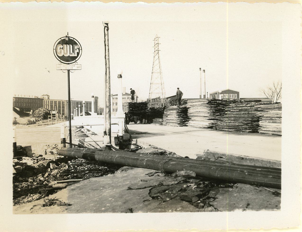 Black and white print photograph of workers stacking wood in front of the Saco-Lowell Shop, after Saco River flooding. From the Sawyer House Collection.Dimensions