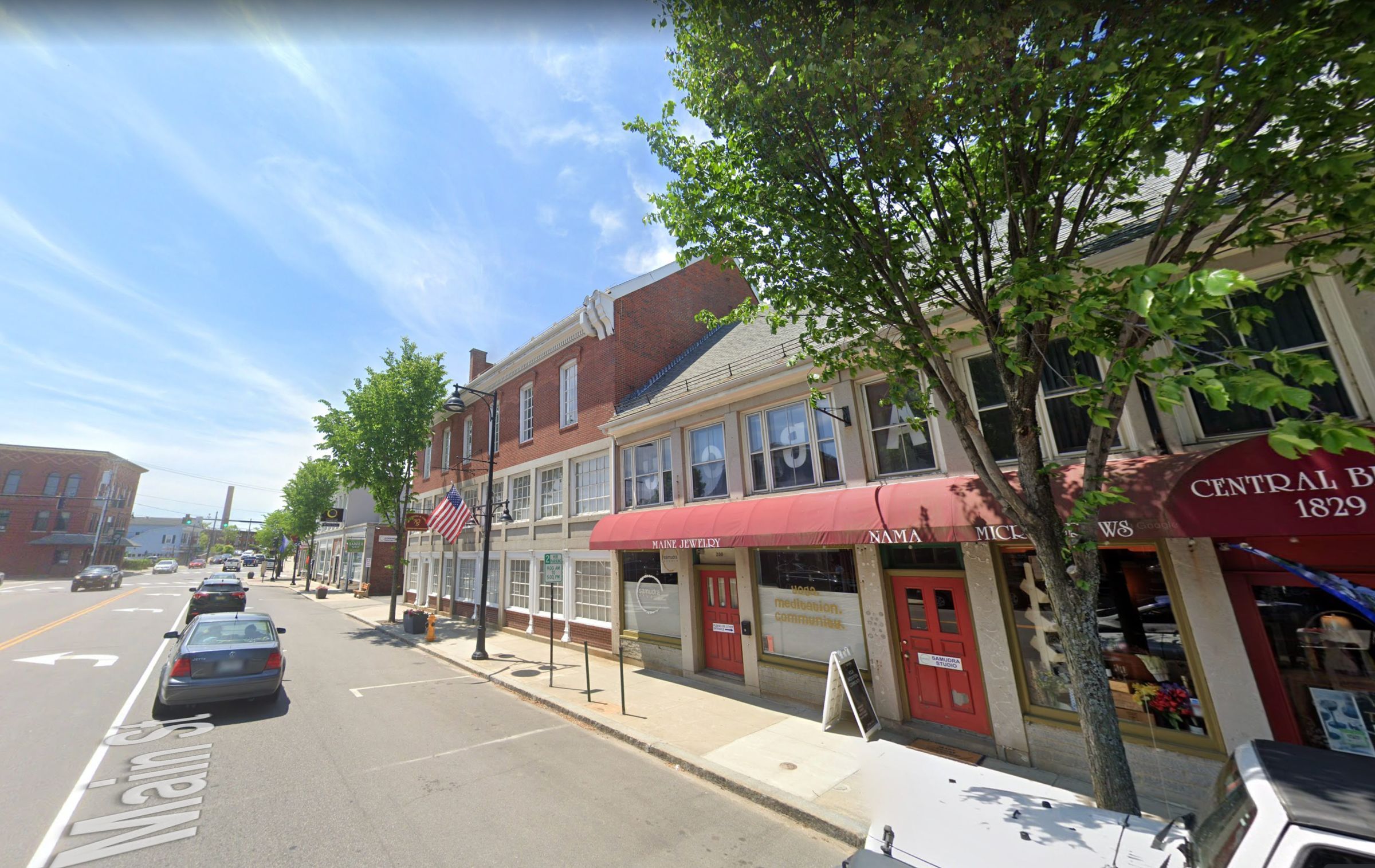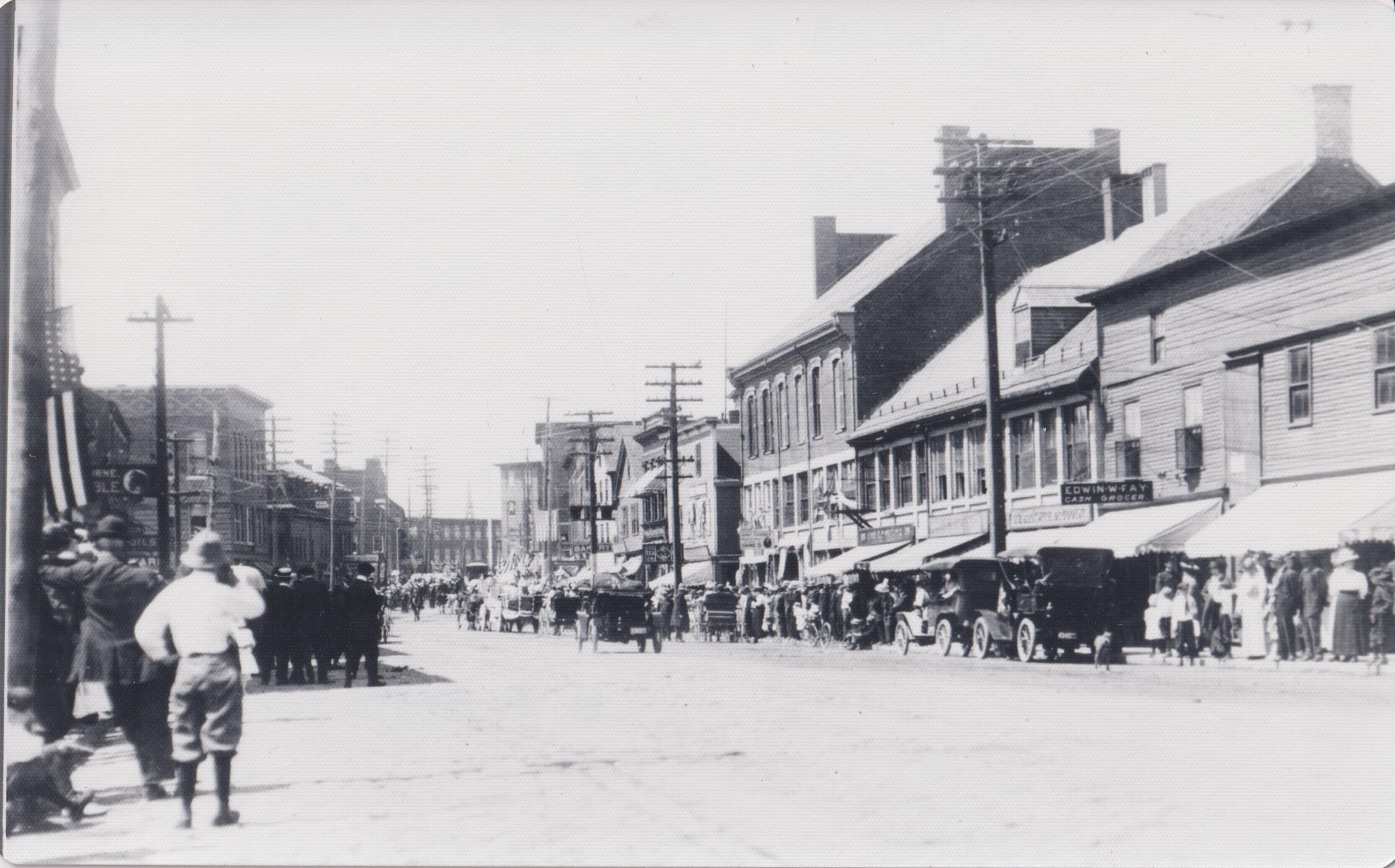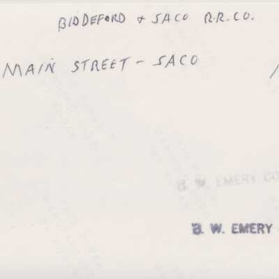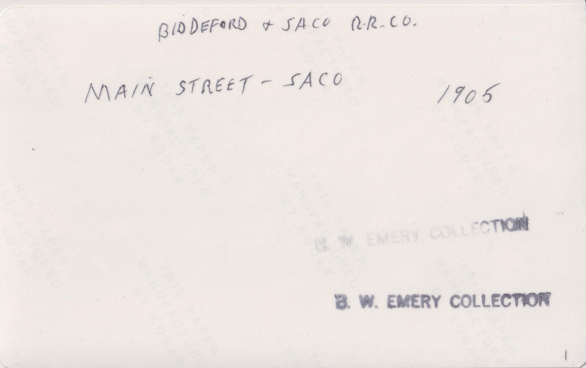 Black and white photo of Main Street, Saco. Although "1905" is written on the back of the photo, this photo was taken circa 1913 by Charles E. Moody. The grocer, Edwin W. Fay appears in the 1913 Biddeford & Saco Directory.