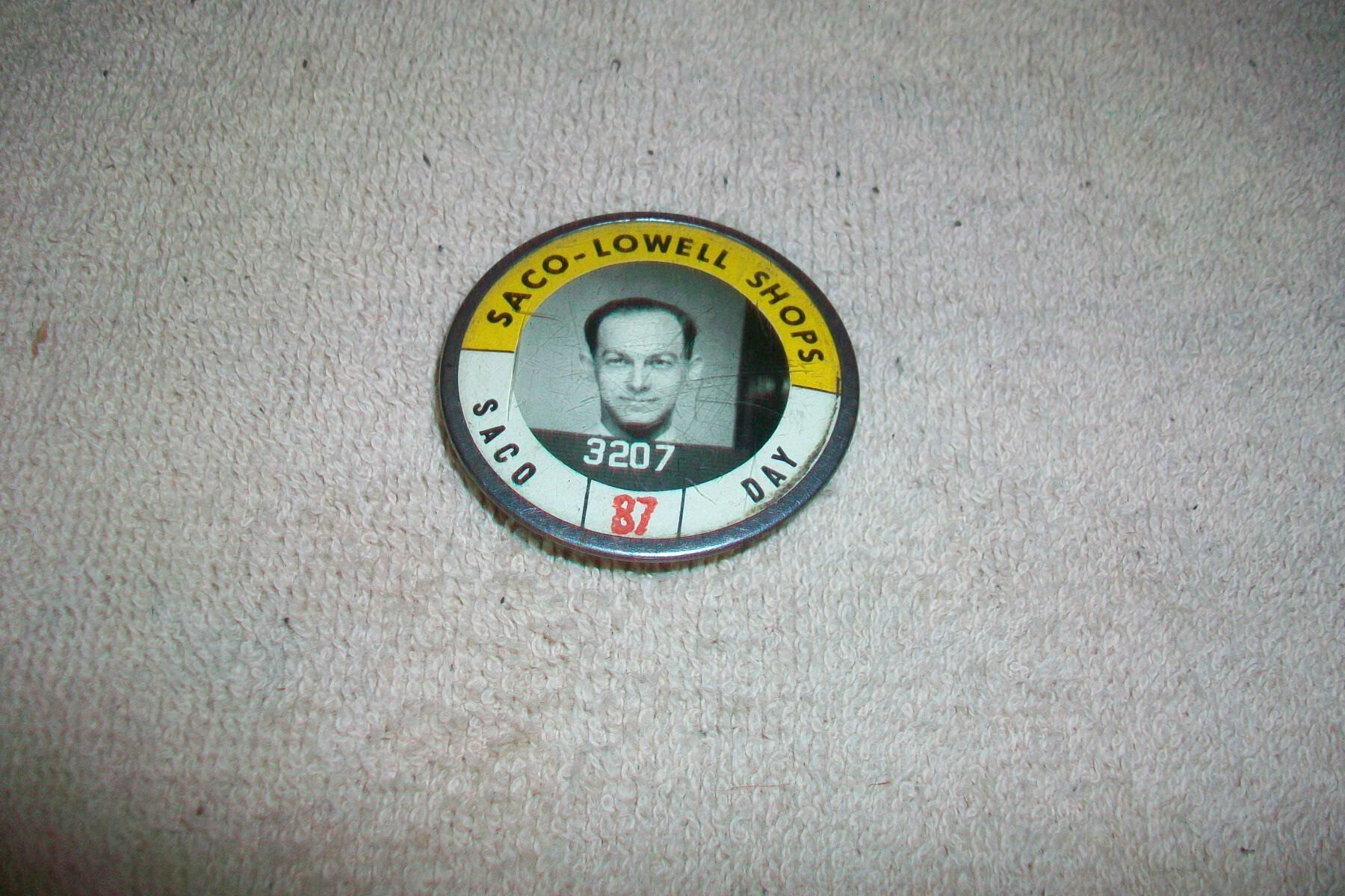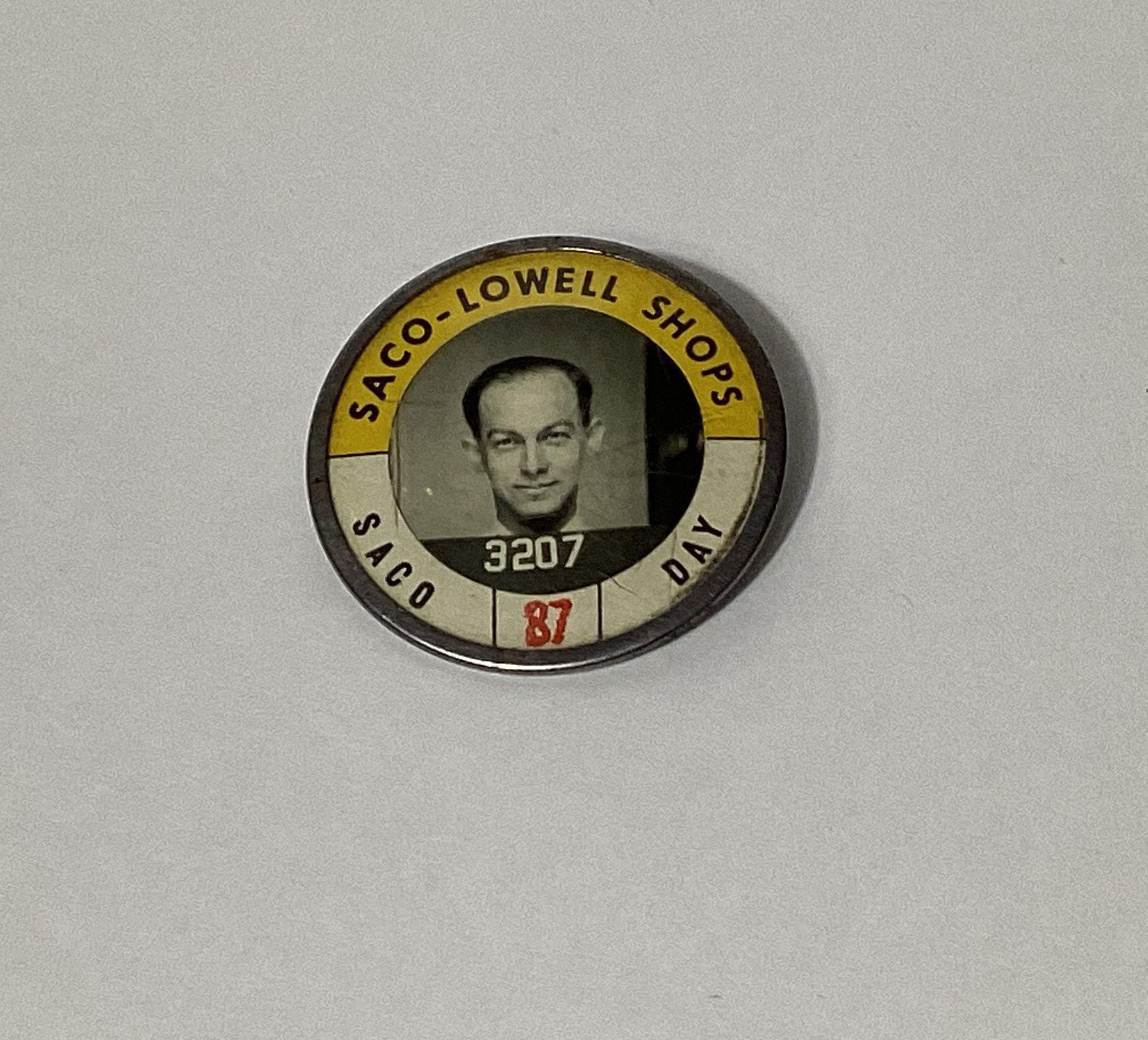 Metal identification pin with a paper insert and plastic cover. The photograph is of Virgin Burnham, an engineer for the Saco-Lowell Shops for many years.Material