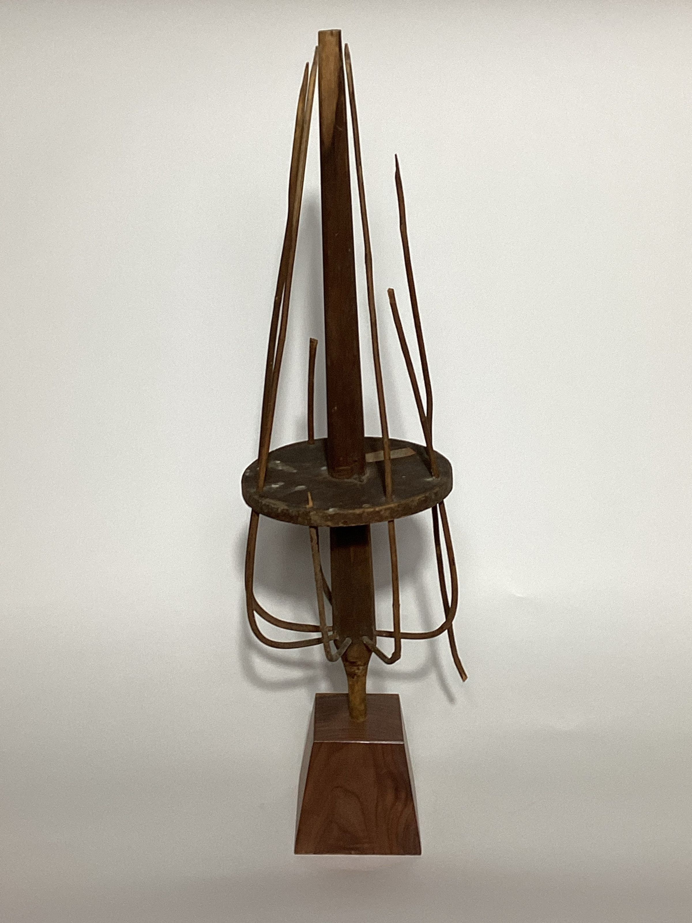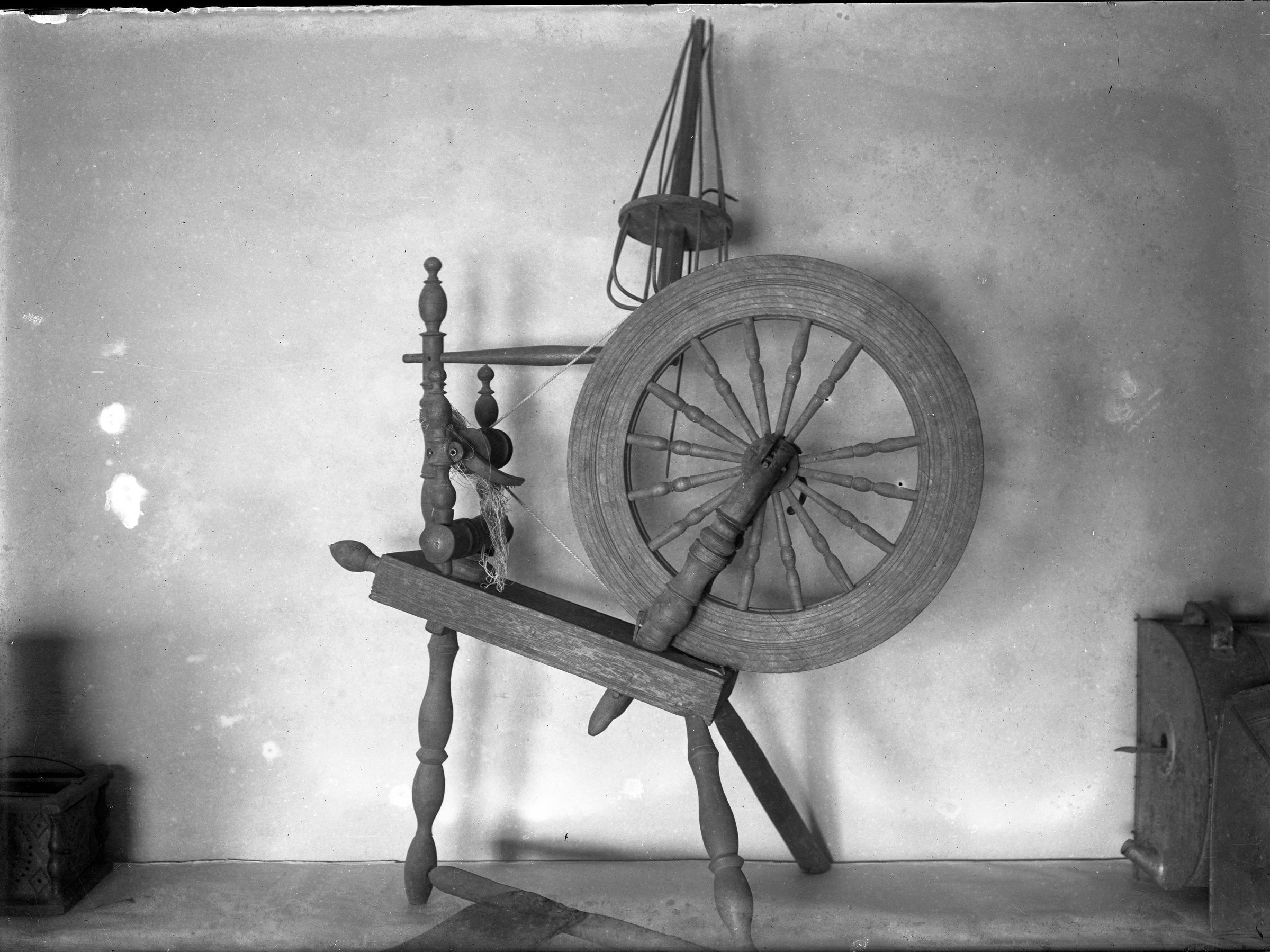 Distaffs were designed to hold unspun fibers. Processed flax was dressed onto the distaff in a fine web, which allowed the spinner to draw the strands into a continuous, uniform yarn. This distaff appears on the flax wheel in Charles E. Moody’s c. 1900 photograph.