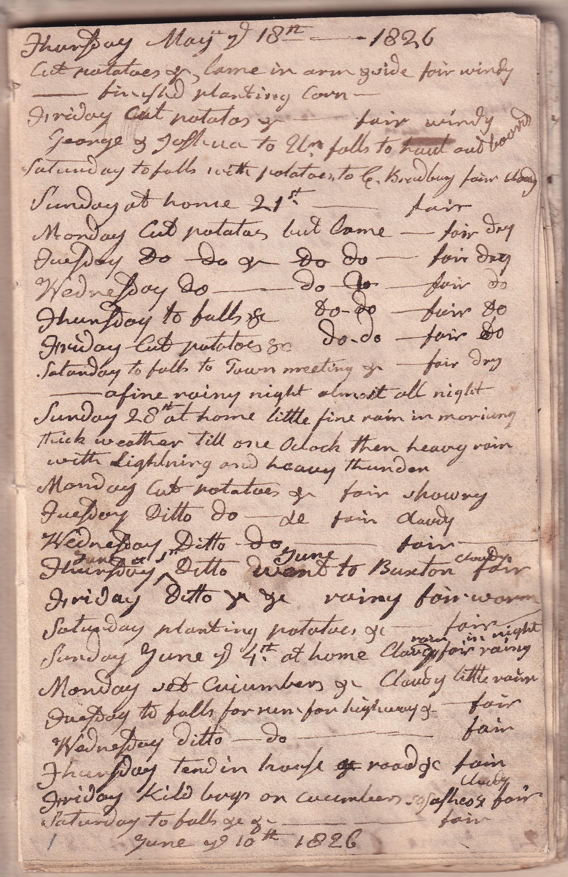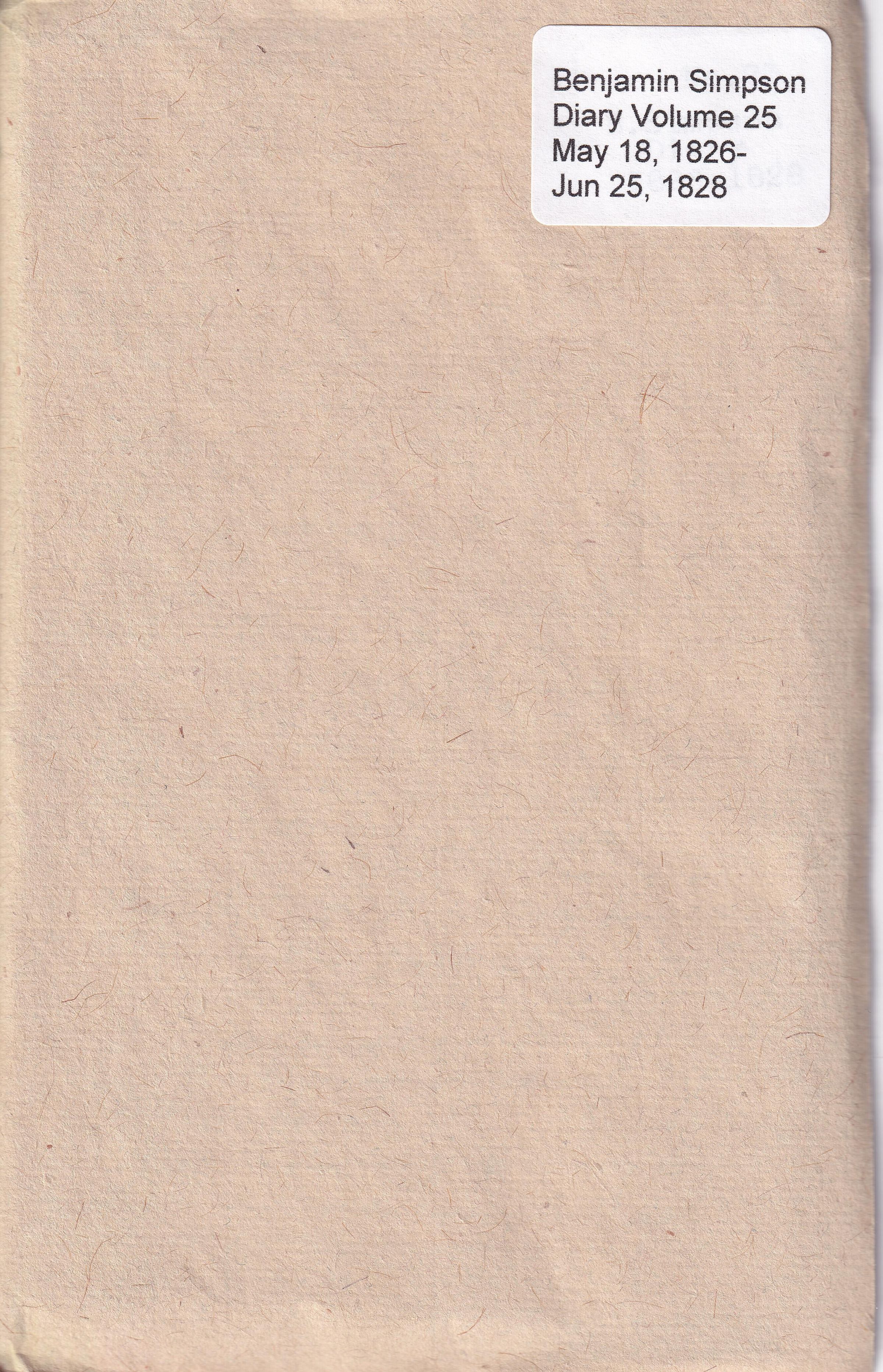 Twenty-fifth volume of the diary of Benjamin Simpson of Saco, 1781-1849. This volume covers the period May 18, 1826 through June 25, 1828. It is handwritten in ink on rag paper with a handsewn binding; it is now housed in a modern paper cover. Most of the entries are a single line. The date is listed at the top of each page, with individual entries (without dates) listed below. Simpson noted his major task of the day and the weather.