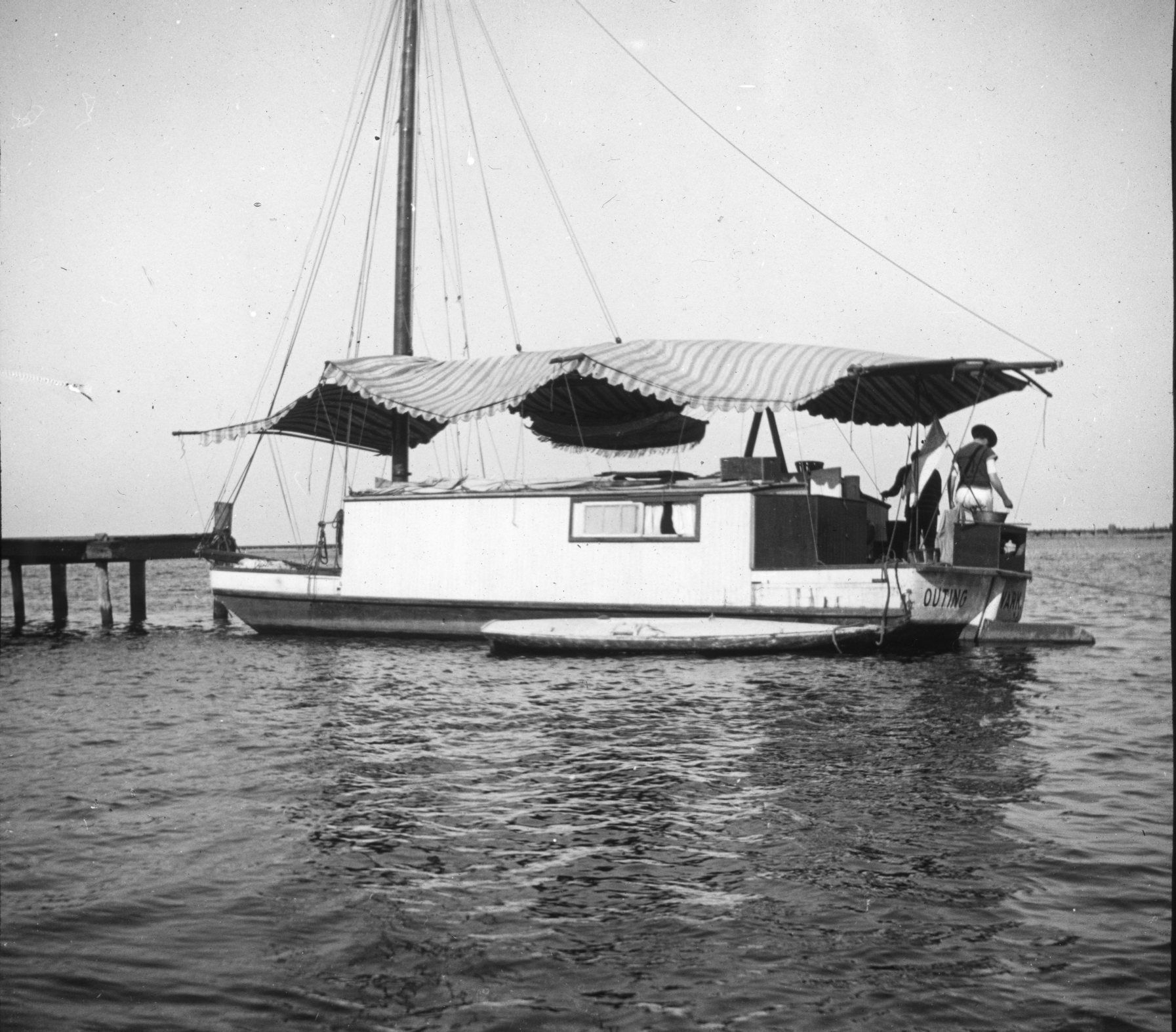 Glass lantern slide of the boat "The Outing" at a dock. "The Outing, Highlands Beach" is written on the label on the slide. Highlands Beach is part of the Jersey Shore near Sandy Hook, NJ.