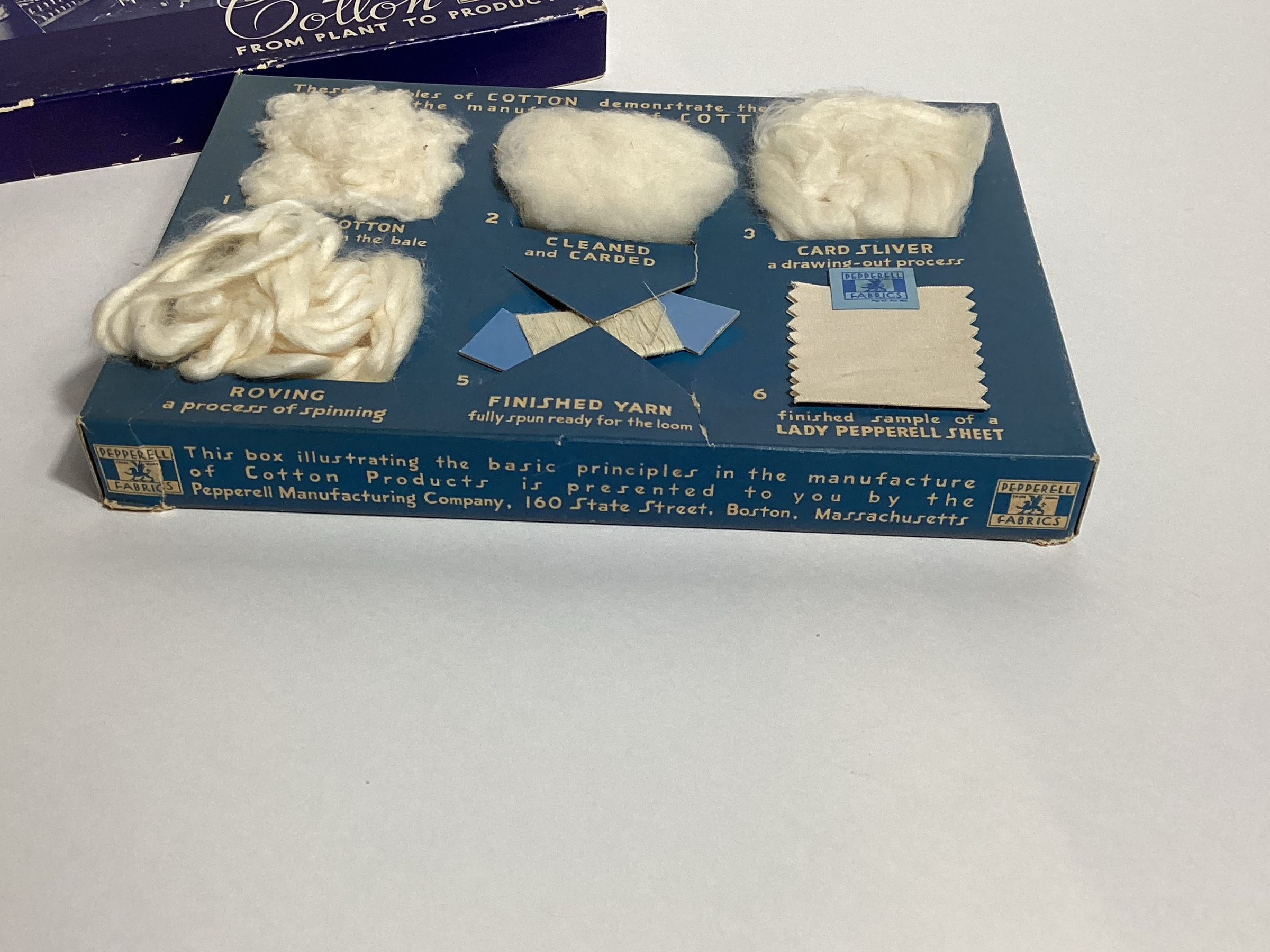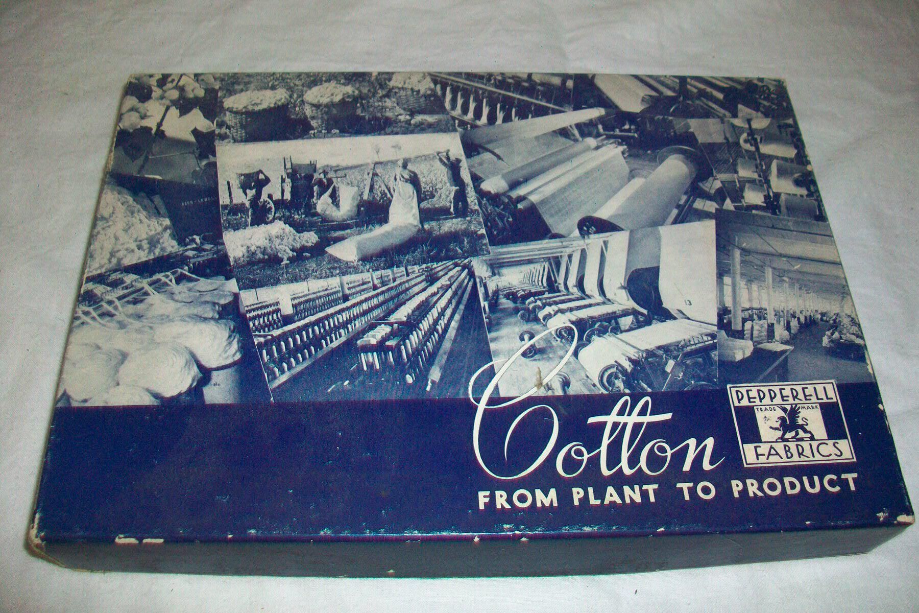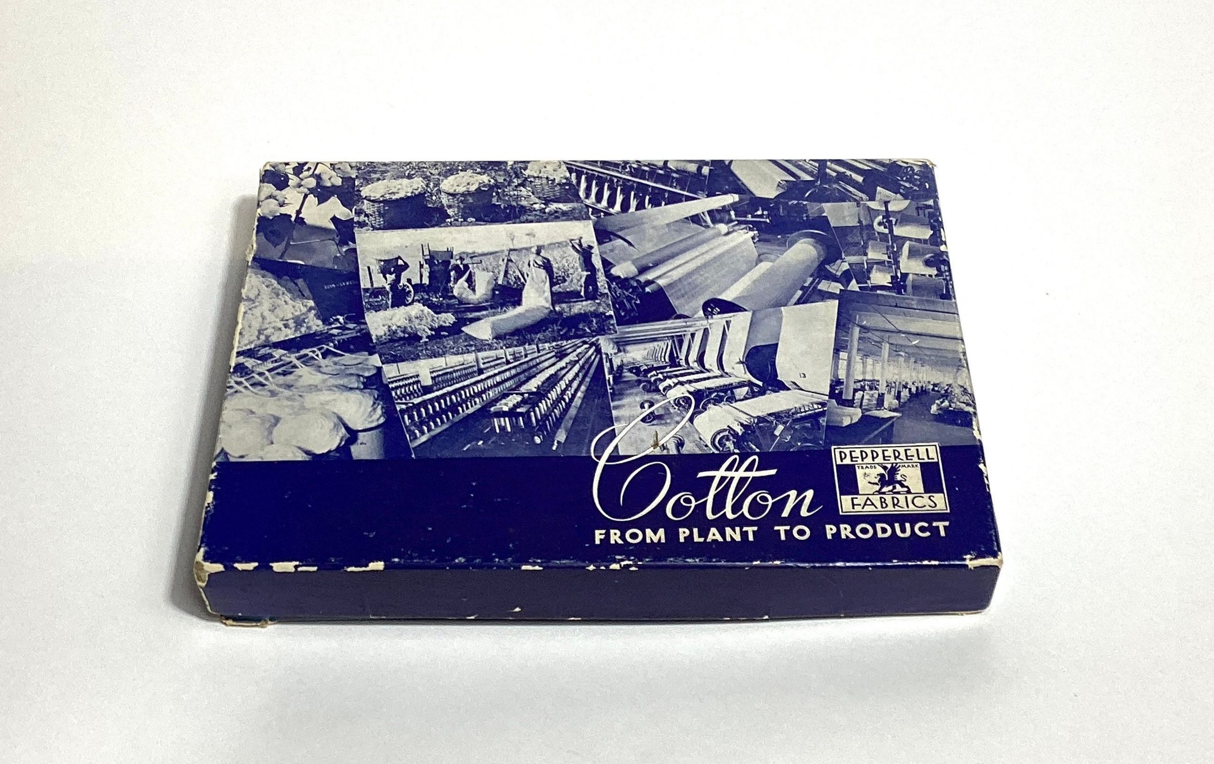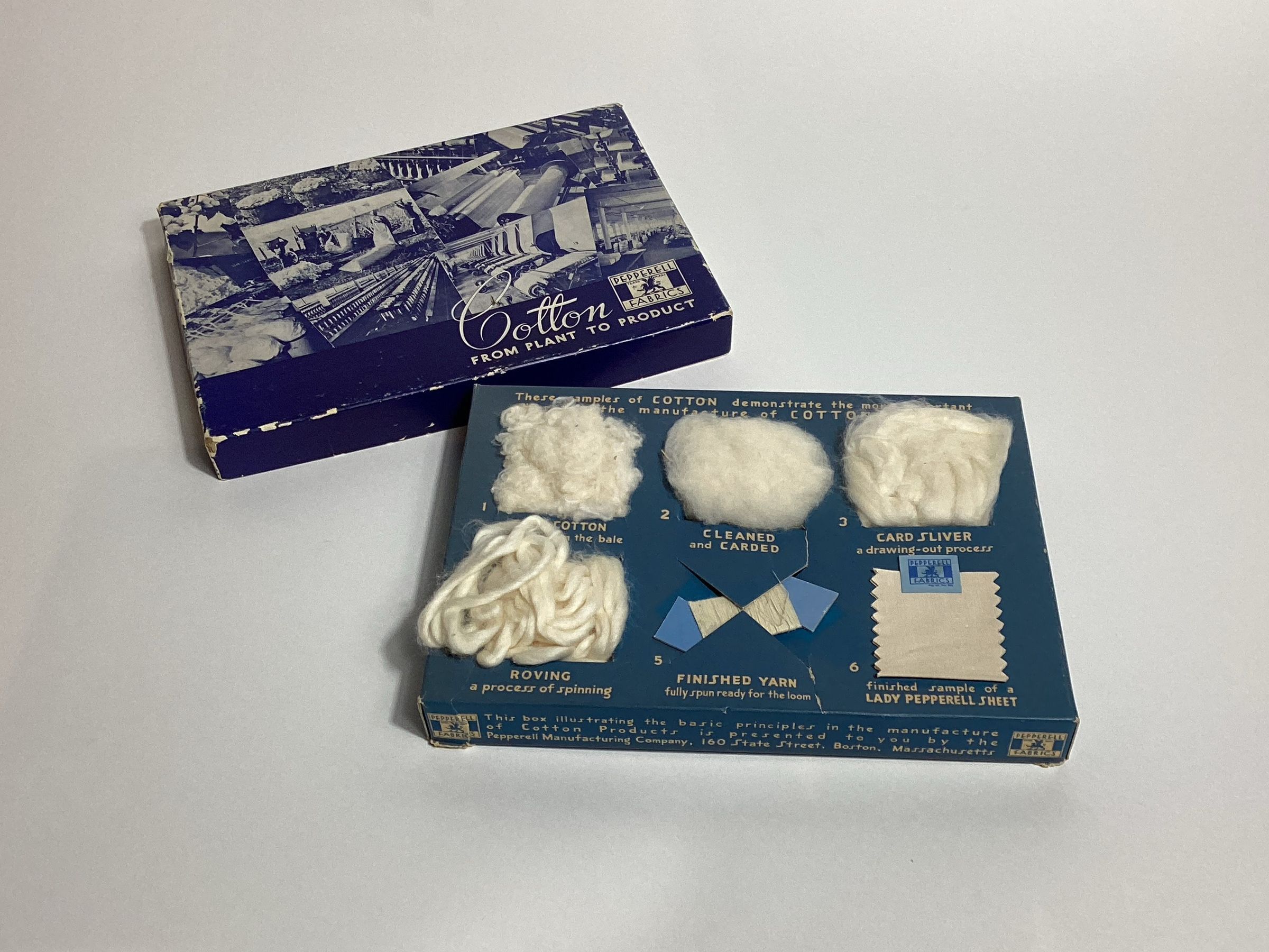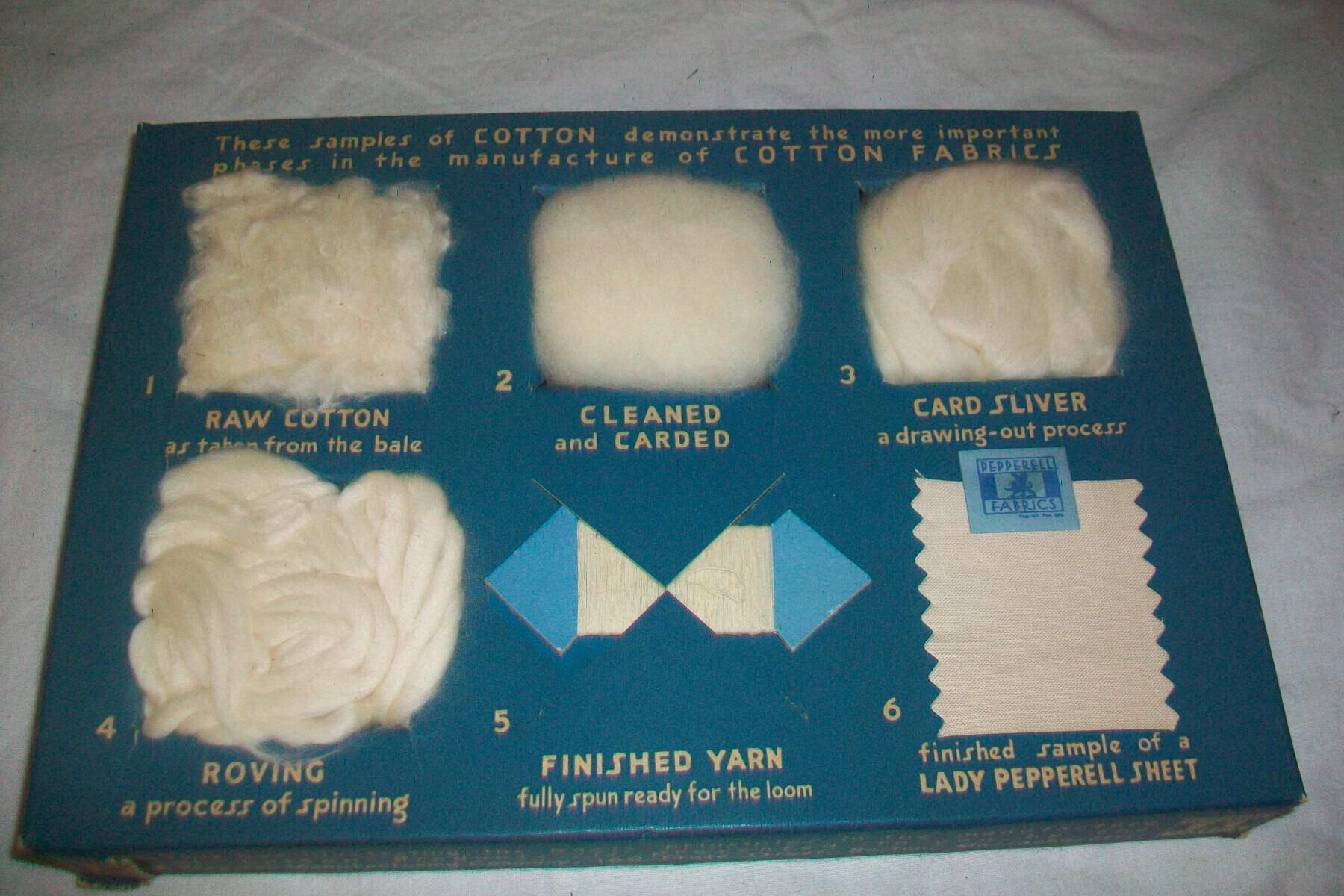 Sample box from the Pepperell Manufacturing Company, with samples of the various stages in the manufacture of cotton fabric. The samples include raw cotton, cleaned and carded cotton, card sliver, roving, finished yarn, finished Lady Pepperell Sheet.Dimensions