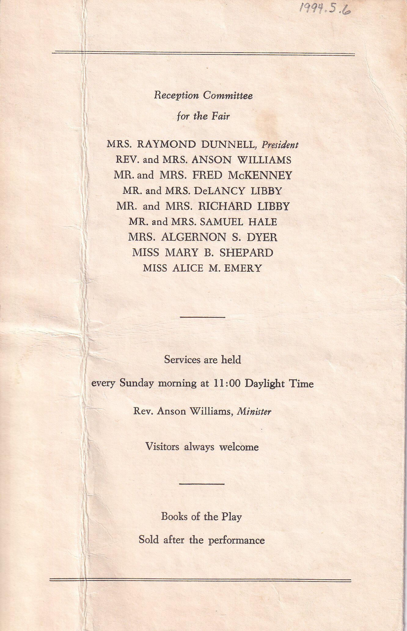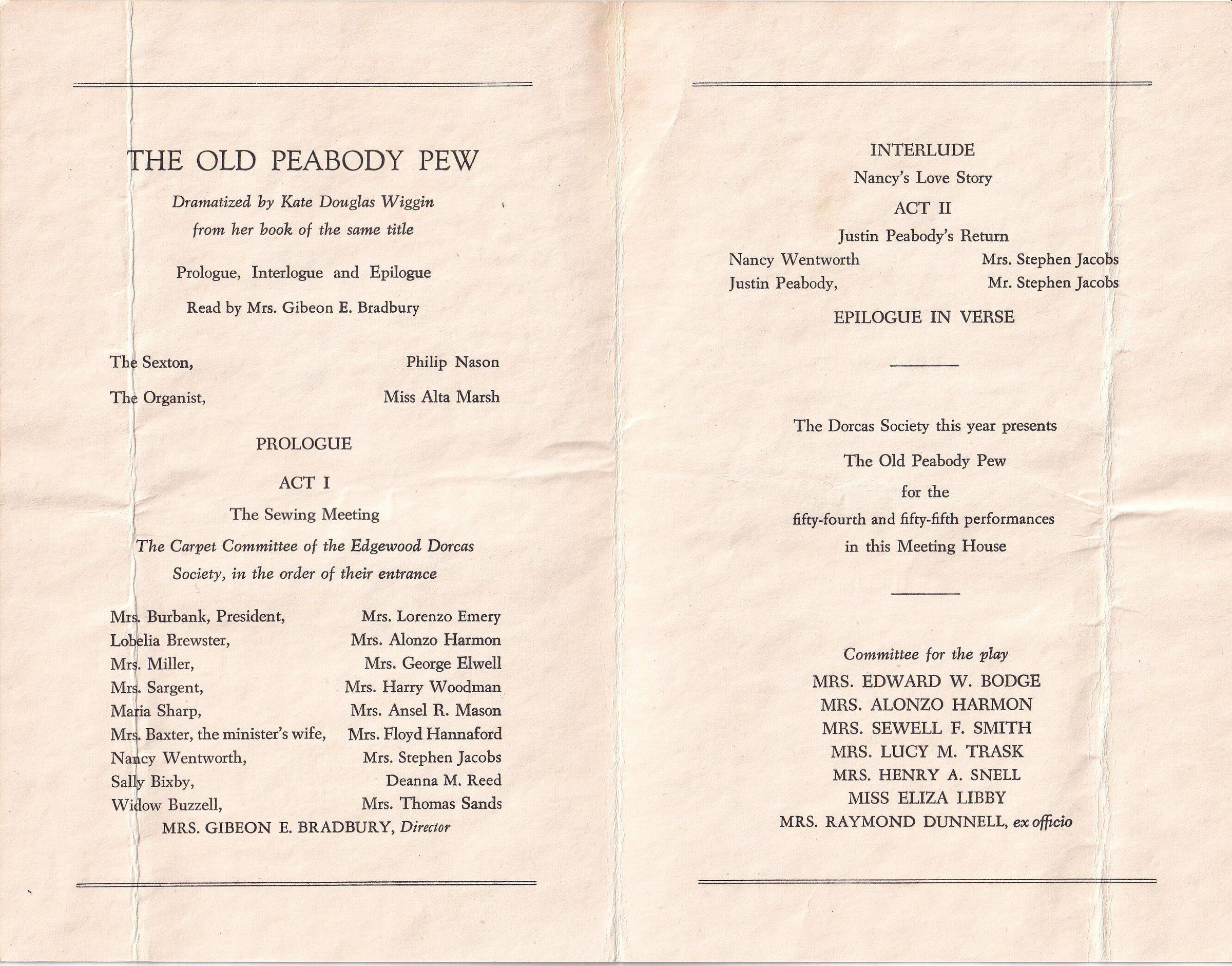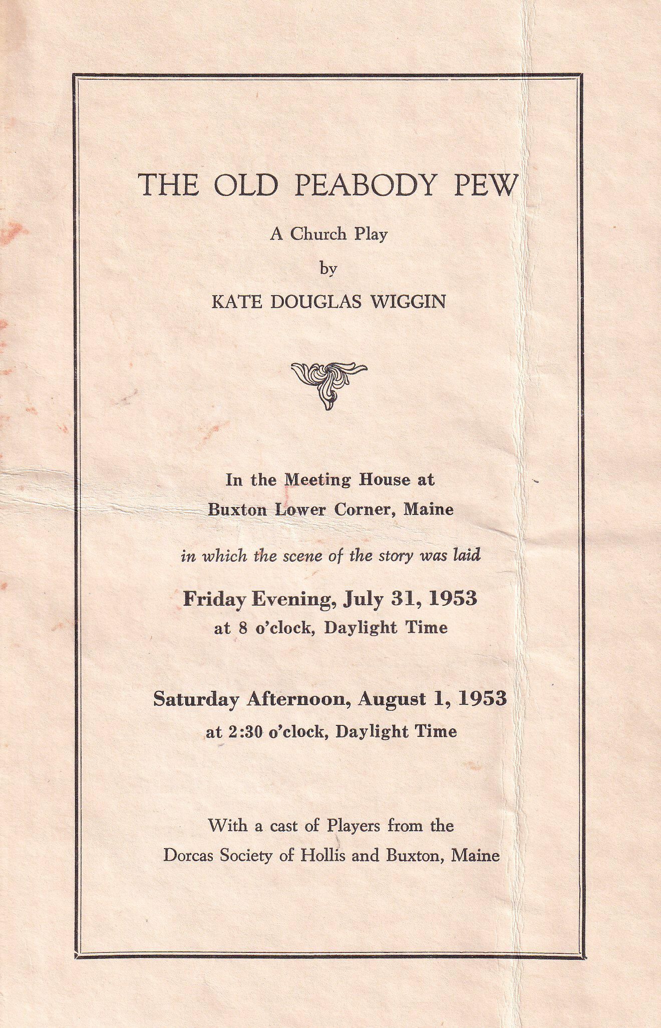 Program for "The Old Peabody Pew," a church play by Kate Douglas Wiggin. The play was to be prsented at the Meeting House at Buxton Lower Corner on Friday, July 31 and Saturday, August 1, 1953. The cast was drawn from the Dorcas Society of Hollis and Buxton; they are listed in the interior of the program. Maud Bradbury is listed as the play's director.