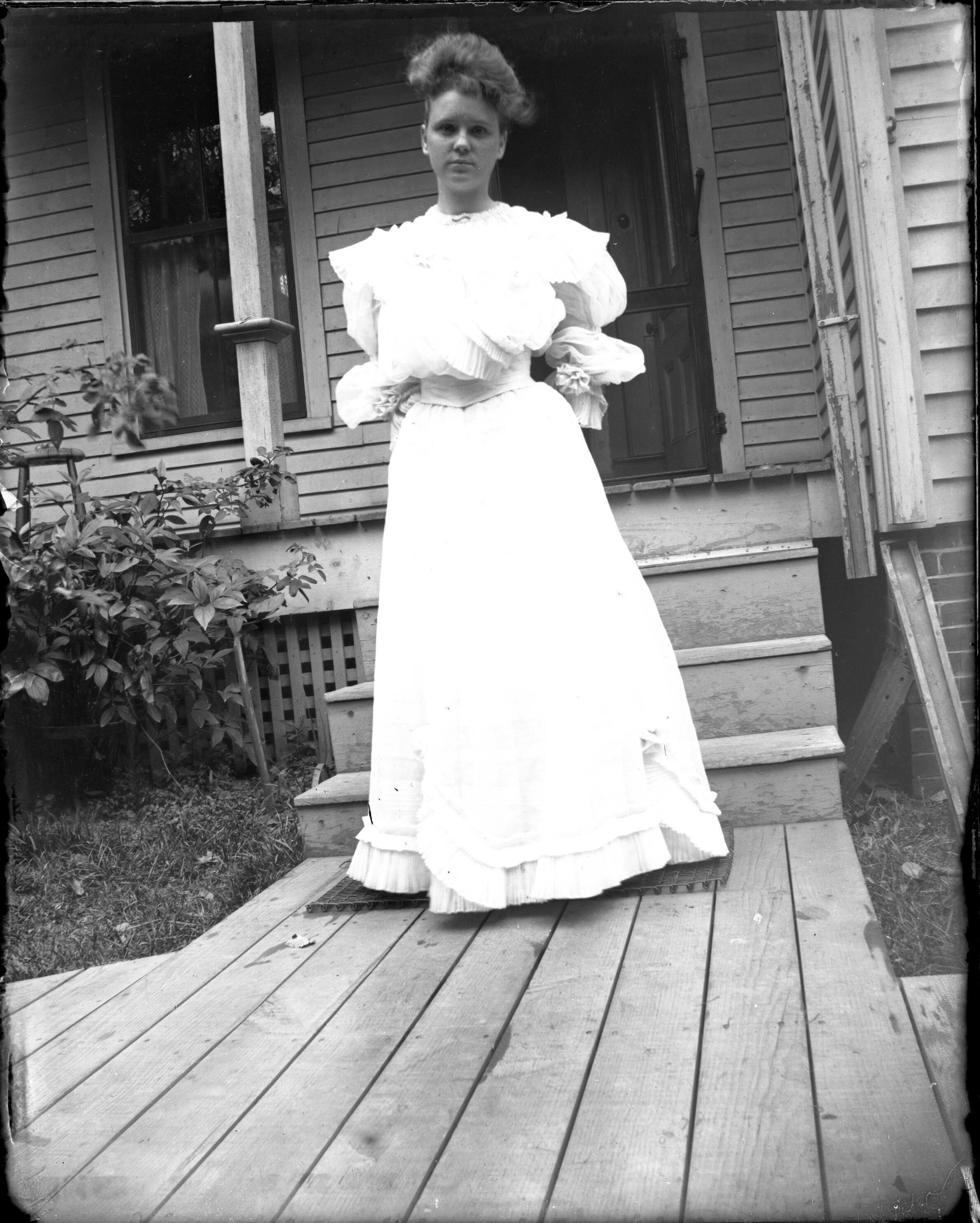 Glass plate negative photo of Mildred "Millie" Etta Young (1886-1961), daughter of Clarence L. and Ida E. Hallet Young. Circa 1903.