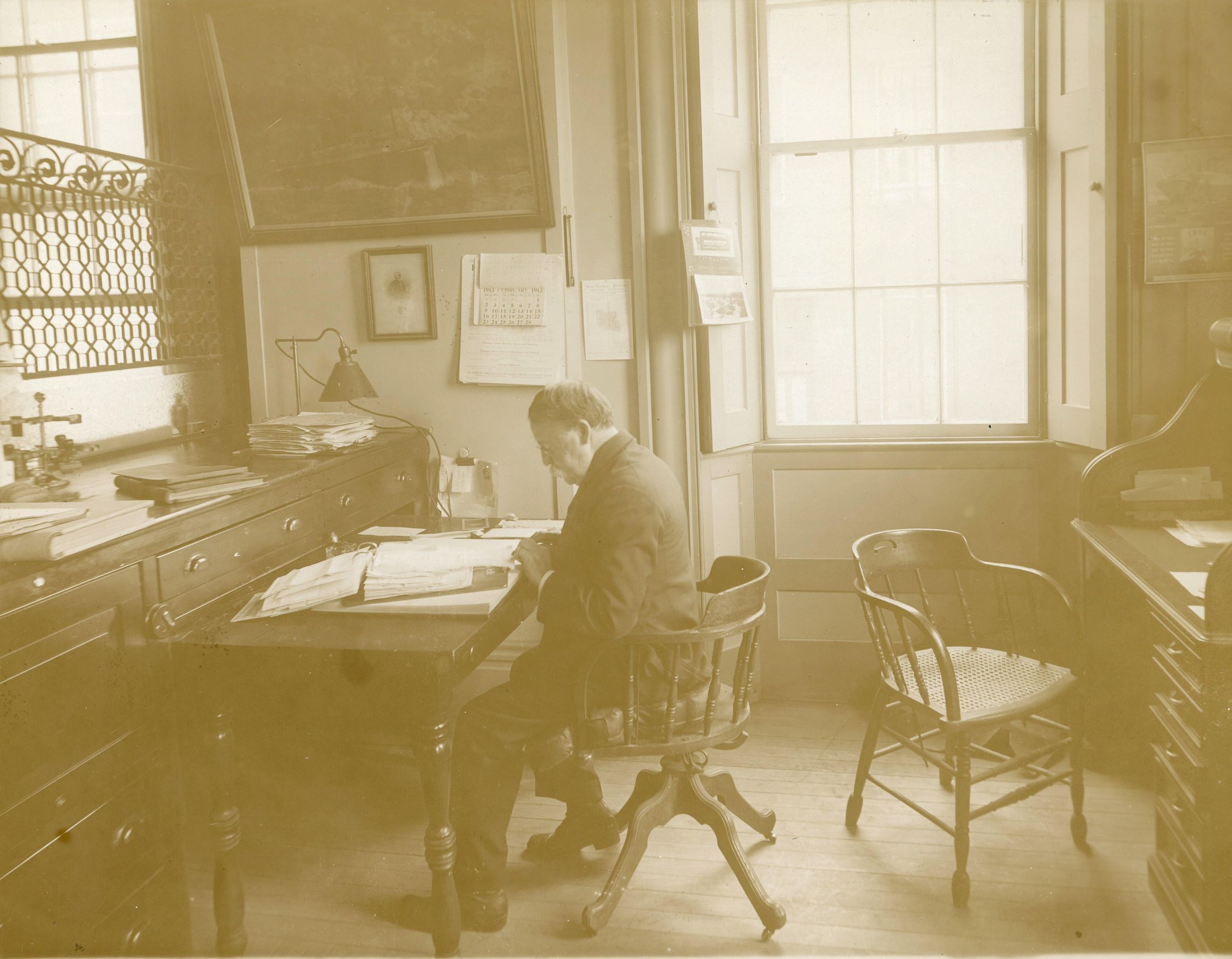 Photograph of an unidentified man working at a desk in an office in the Laconia Mills Division of the Pepperell Manufacturing Company.
