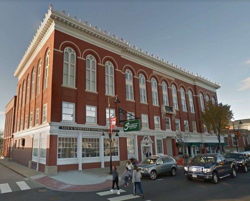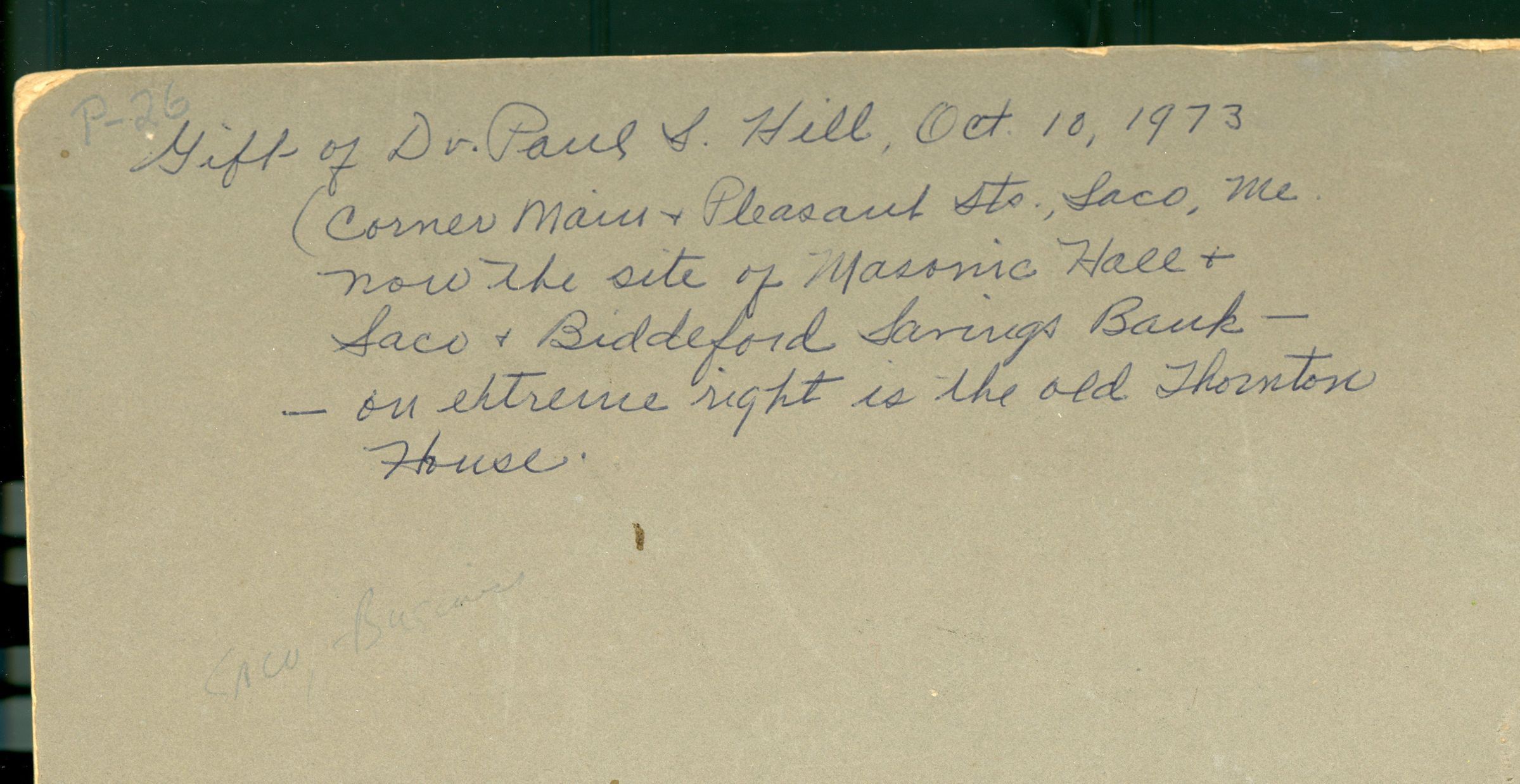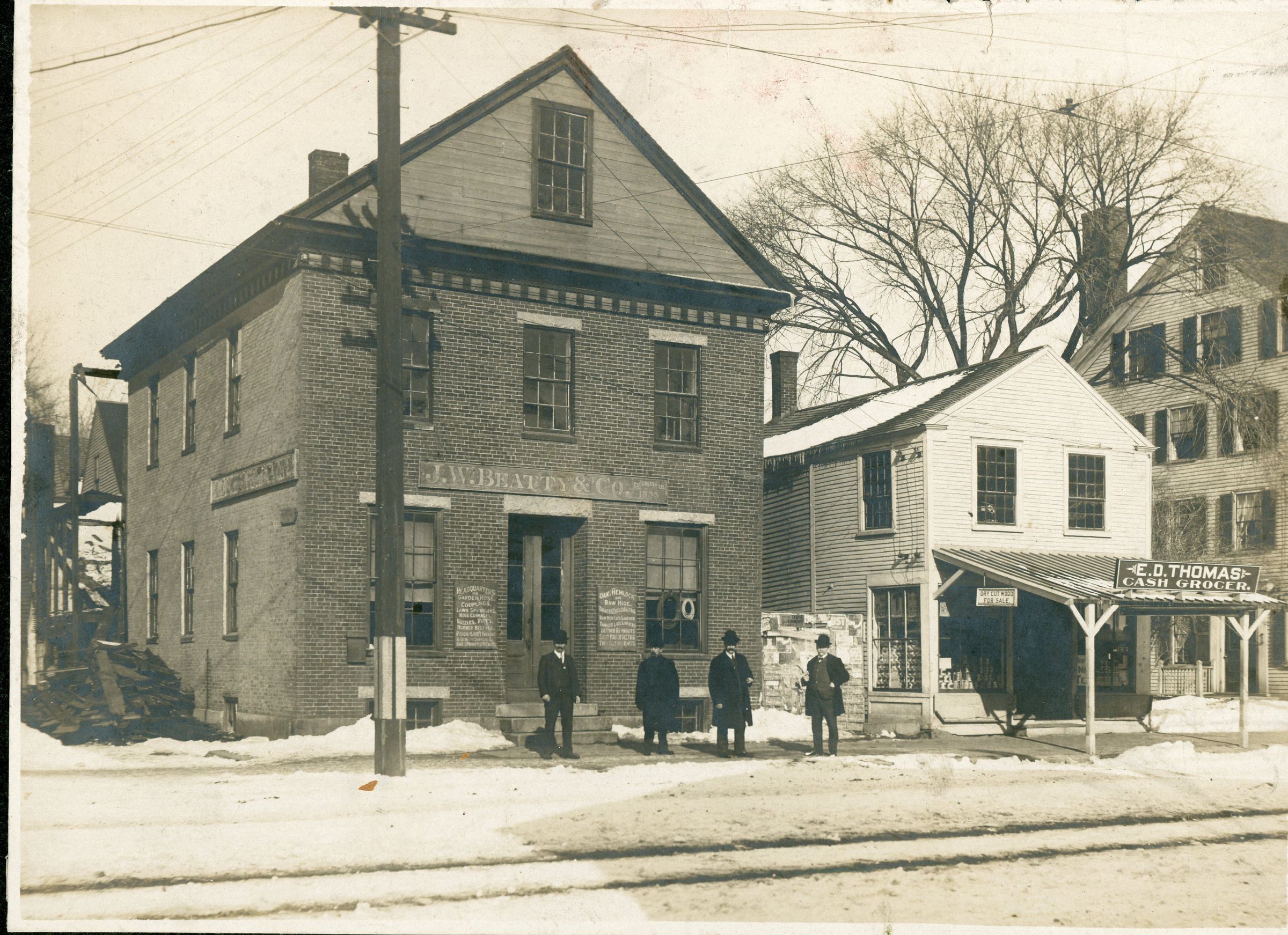 A print photograph of "Joker's Corner" on the corner of Main Street and Pleasant Street in Saco, ME. This is the same corner where Saco & Biddeford Savings in the Masonic Hall Block stands today. The J.W. Beatty & Co. mill supplies and leather belting store and the Edwin D. Thomas grocery store can be seen. the old Thornton House can be seen on the far right. The owners and patrons of the two stores often gathered and socialized at the corner, giving it its nickname, "Joker's Corner."
