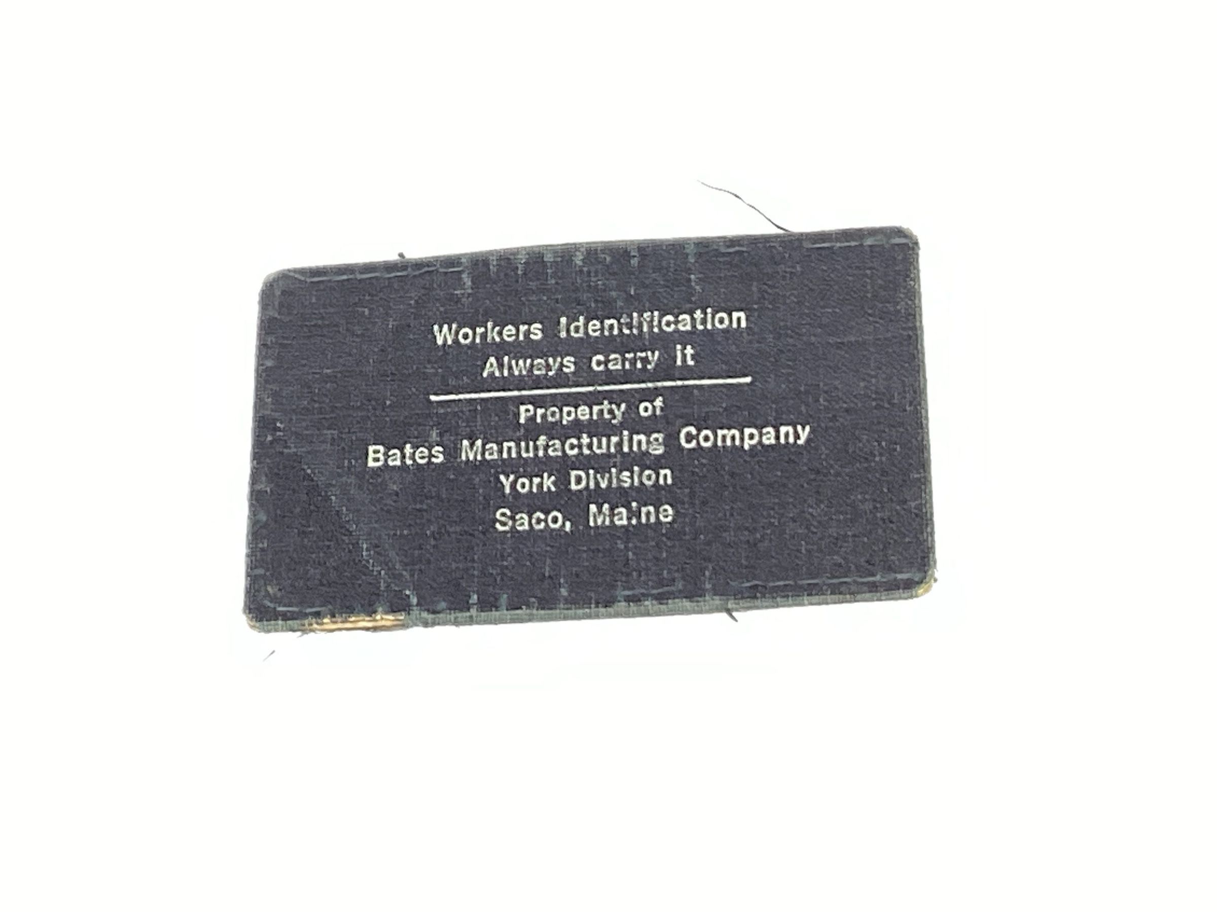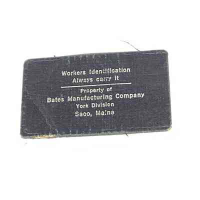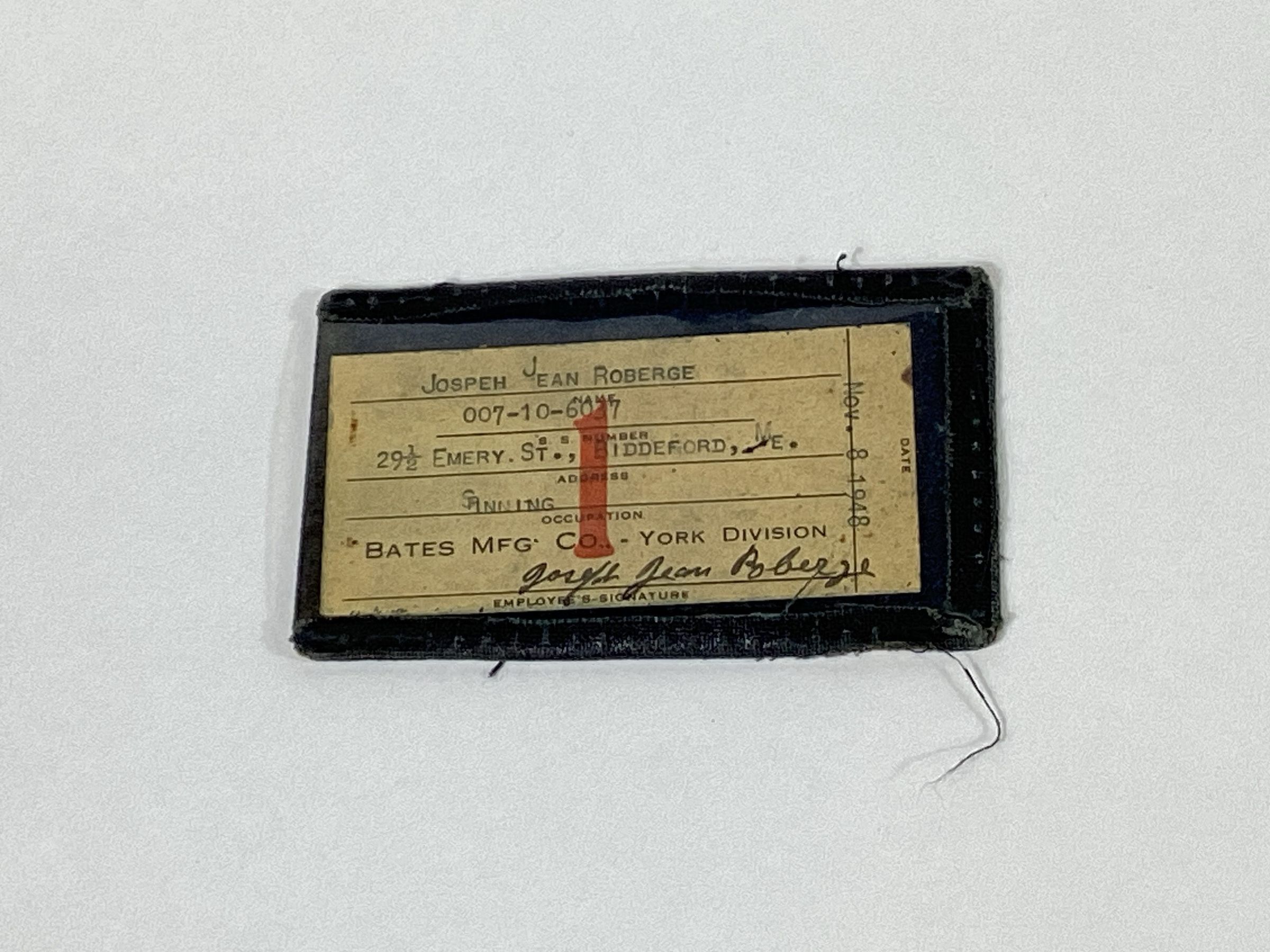 Worker identification card of Joseph Jean Roberge of Biddeford, an employee of the Bates Manufacturing Company, York Division. His occupation is listed as spinner and he worked in the spinning room as a bobbin boy.