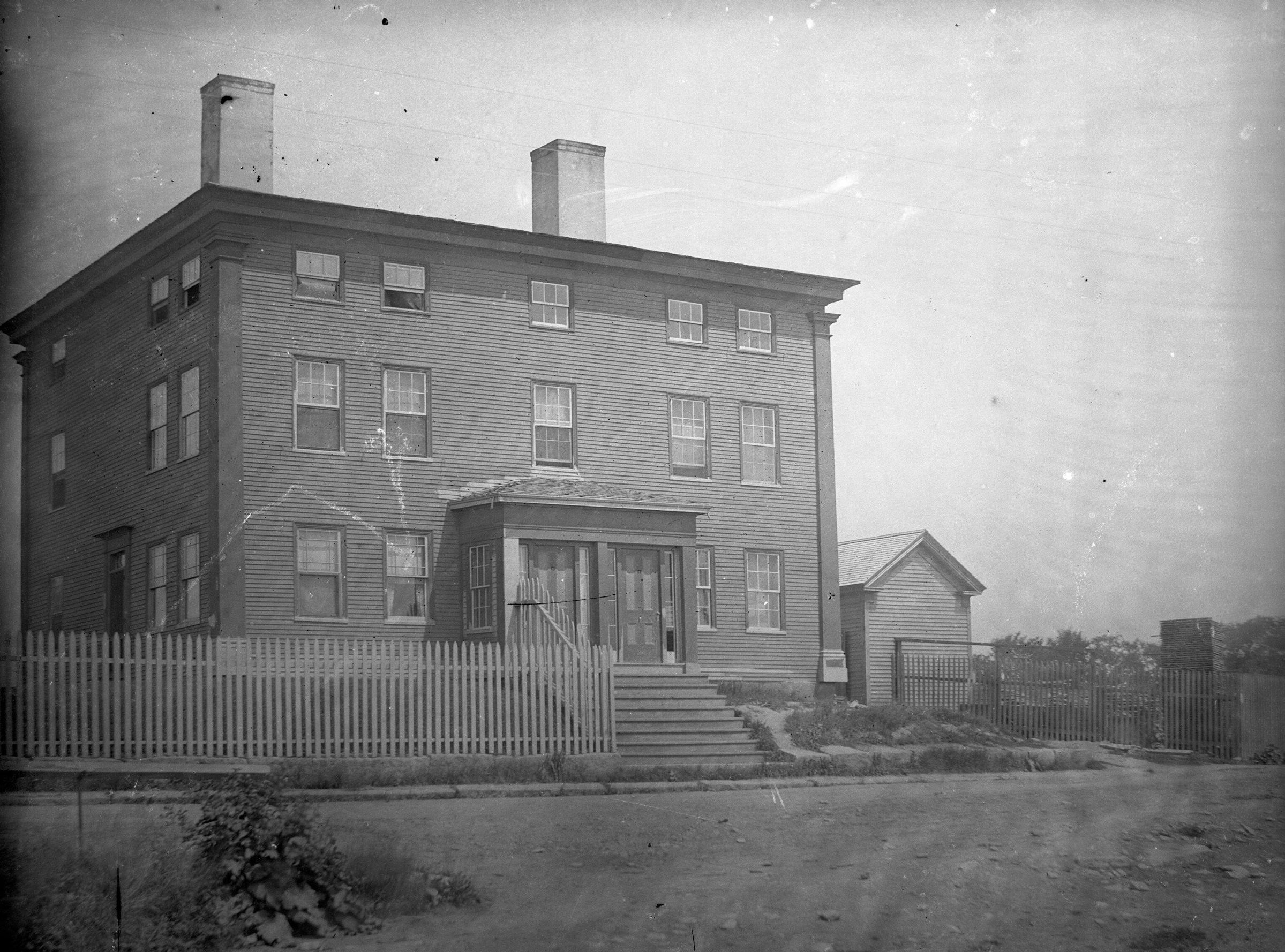 Glass plate negative photo of Captain Seth Spring's Tavern (also known as Lafayette House) at 14 Elm Street. Towards the end of the 19th century, the building was converted into a tenement (as shown here). It was later restored into the colonial style for the offices of Deering Lumber Co.Made/Created