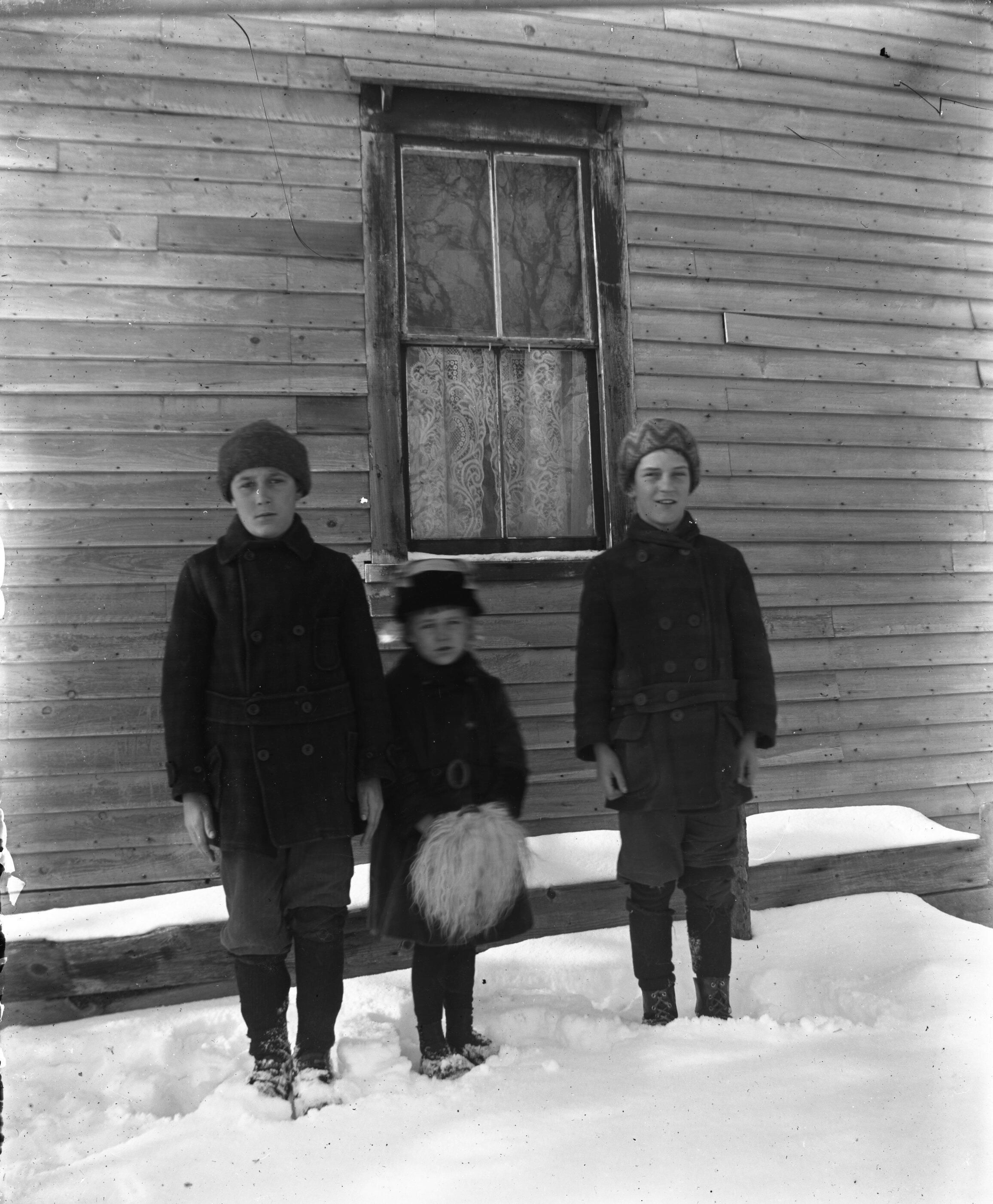 Glass plate negative photo of three Hobbs children. From left to right: L-R Elmer Lesco Hobbs, Gladys Arlene Hobbs, Raymond Milton Hobbs at 79 Watson Mill Road, Saco. Circa 1920.