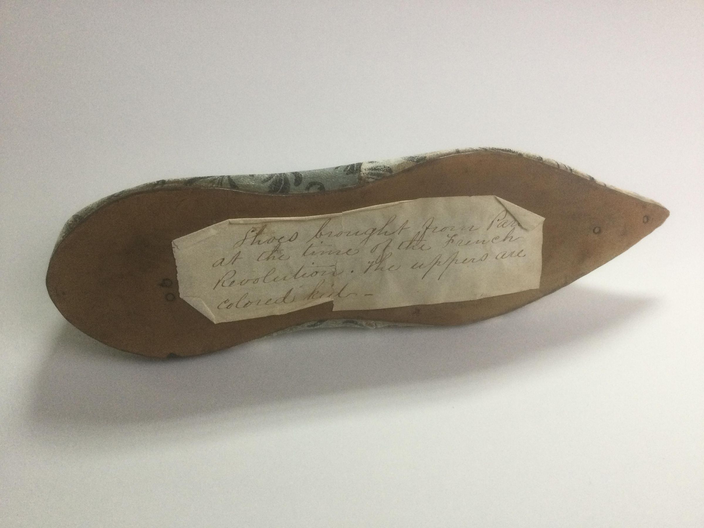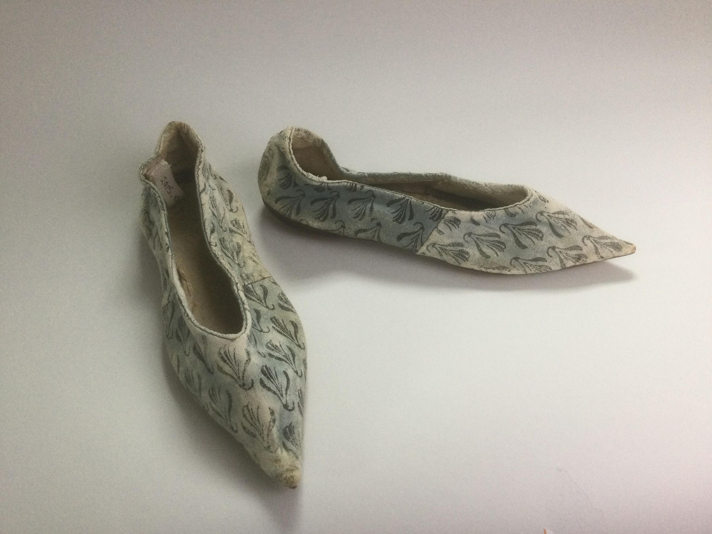 Pair of women's shoes, kidskin uppers with leather soles, lined with linen. Pointed toes that curl slightly upward; low wedge heel. The vamps are one piece and seamed to the back about halfway down the foot. There is a seam at the back of the heel. The uppers are colored blue with a black printed stylized floral motif that was printed on the leather before it was cut for assembly. The uppers are lined with a coarse cream-colored linen; the insole is a separate piece of the same linen. The upper edge on the inside is bound with cream-colored leather fastened down with hand overcast stitches. The outsoles are marked with several small circles. Interestingly, the pattern on the vamps is not aligned in the same direction on the shoes.Dimensions