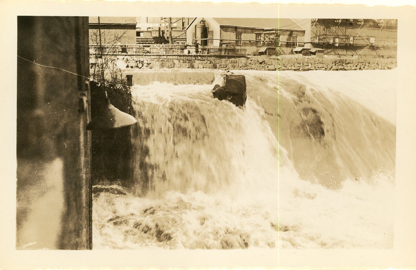 Black and white print photograph of Saco River flooding in Saco, Maine. From the Sawyer House Collection.