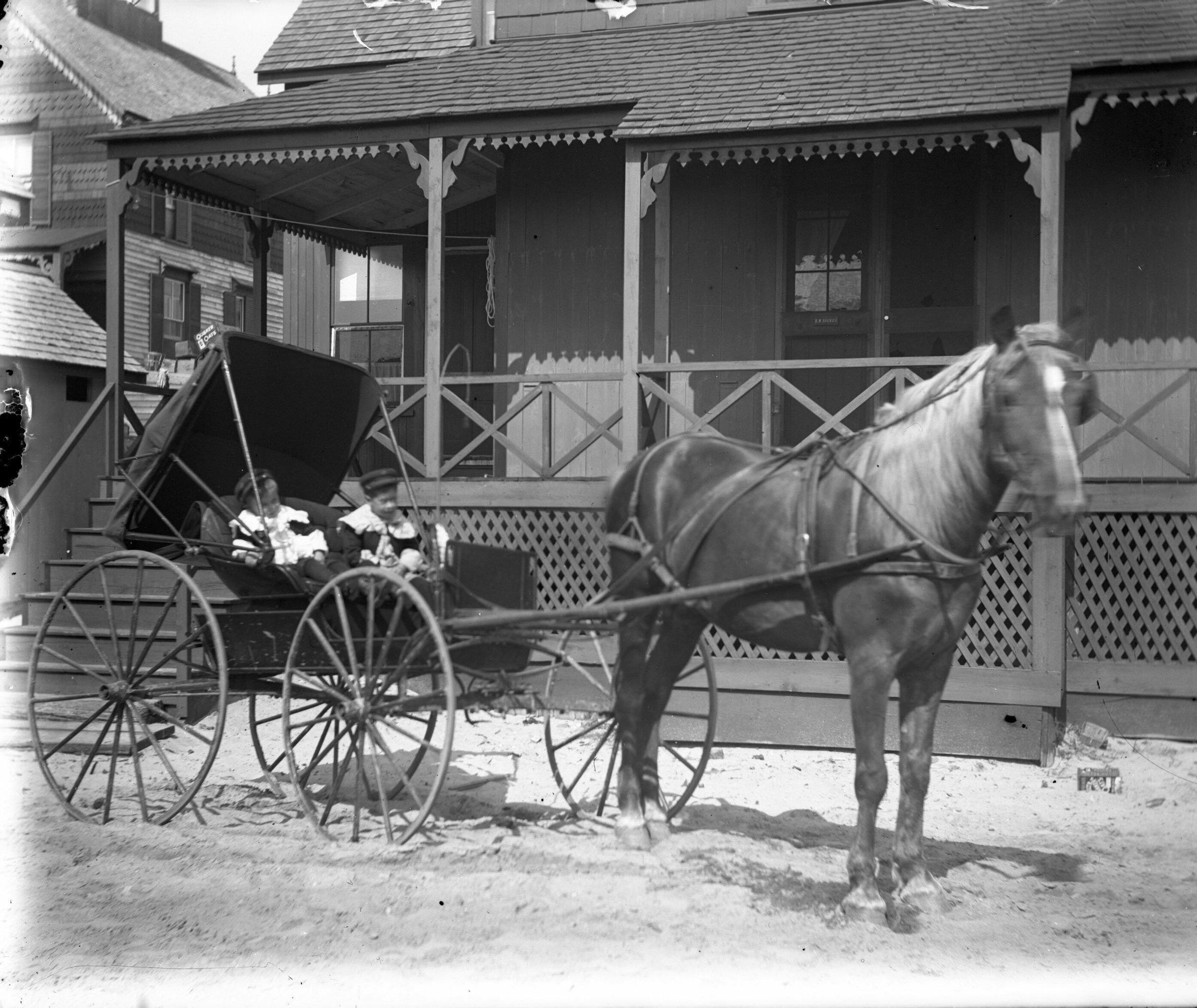 Glass plate negative photo of two toddlers in a horse wagon and horse. "Charles and Everett with Grandpa's Horse Ned, Ocean Park, ME" is written on the plate sleeve. The name on the door reads "E. W. Ricker."Made/Created