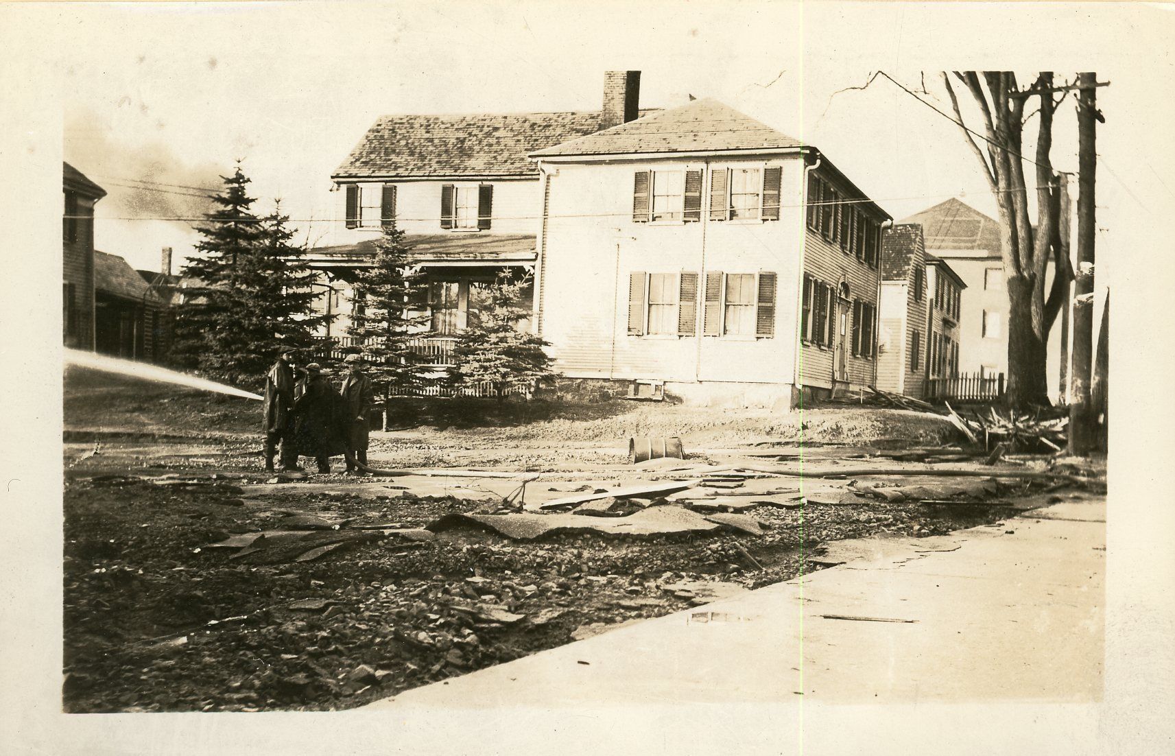 Black and white print photograph of Saco River flooding in Saco, Maine depicting firefighters cleaning debris. From the Sawyer House Collection.Dimensions