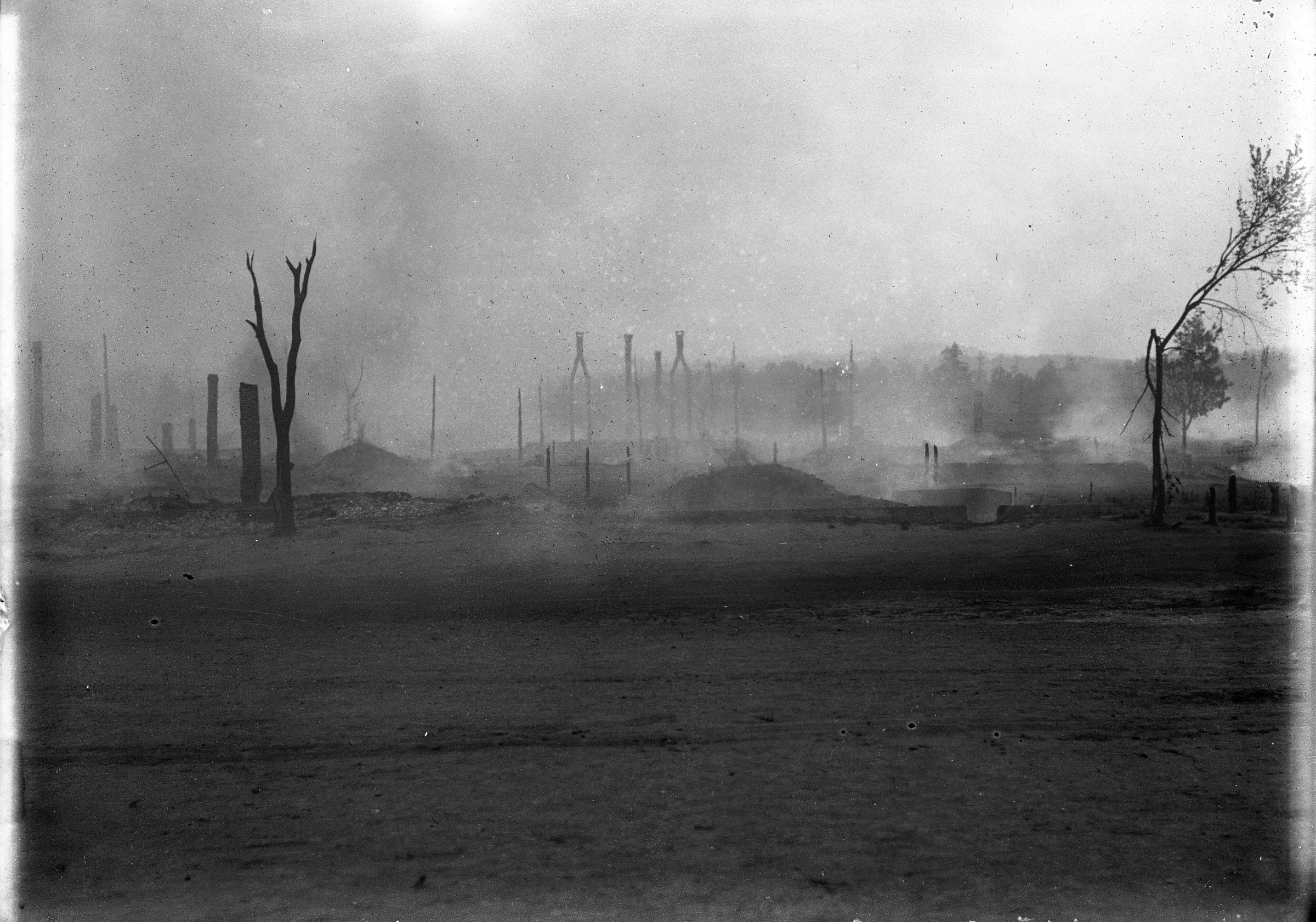 Glass plate negative photo of the desolate aftermath of the Harmon's Corner (Main and Elm Street) fire in Biddeford. The Harmon's Corner fire in Biddeford occurred on July 8, 1911.