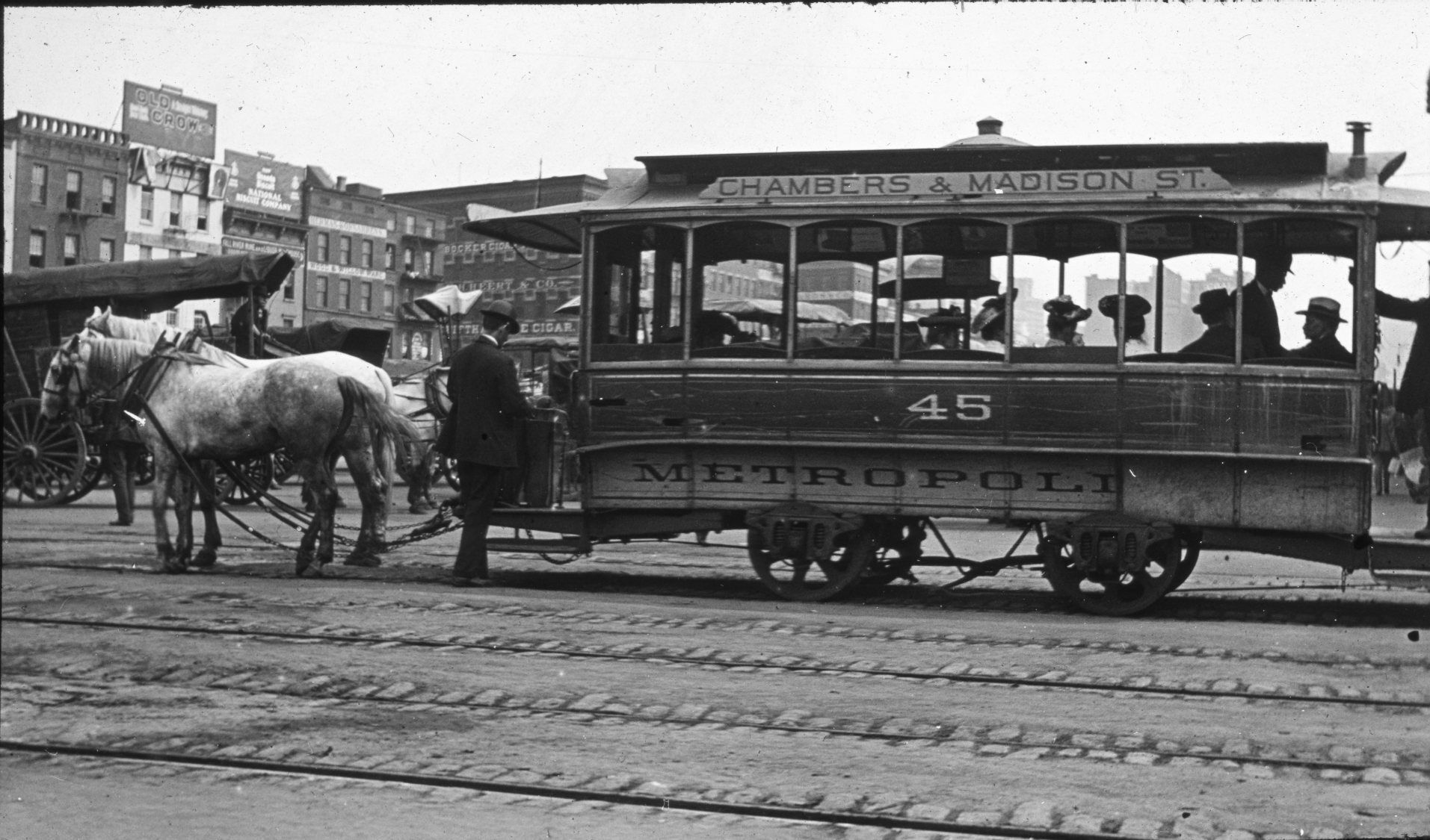 Glass lantern slide of a horse-drawn trolley on a street in Newark, NJ. A sign for "Chambers & Madison St." is on the trolley. Duplicate of 2022.61.276. "West St., NY" is written on the slide on the plate.