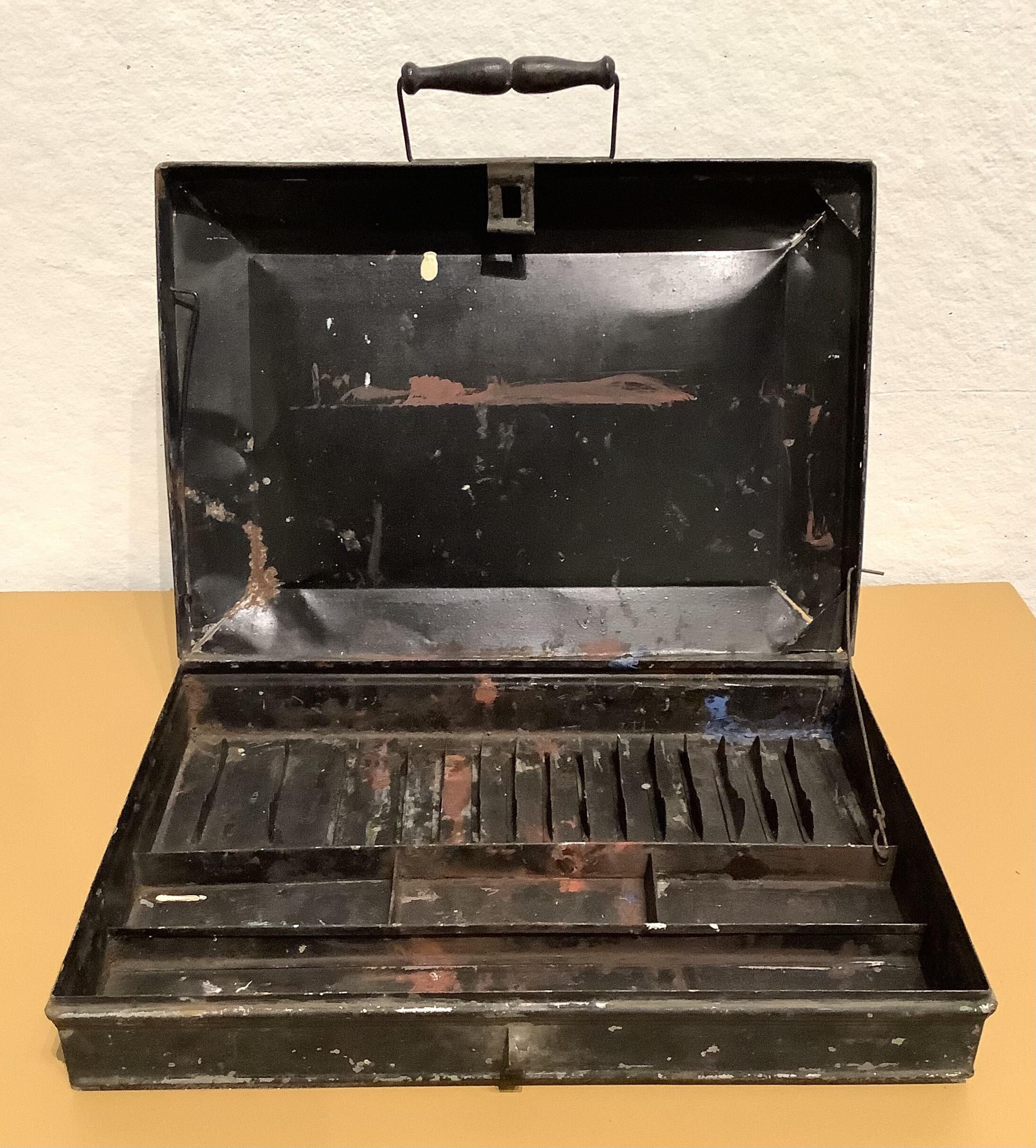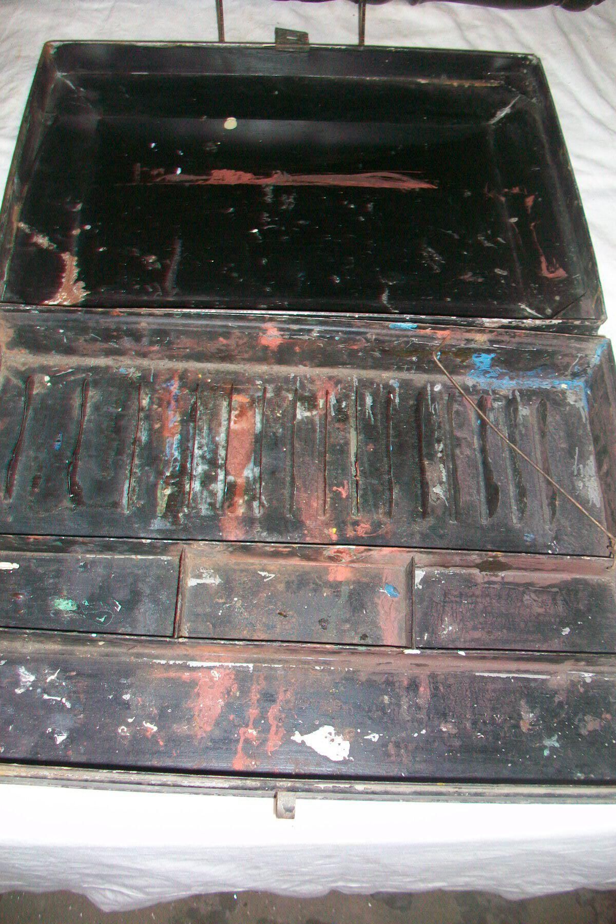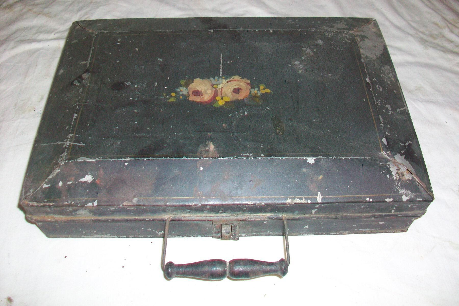 Black painted sheet metal painting box. The top has decorative painting of a pair of roses. Turned wooden handle. The interior is fitted with a section to hold brushes and smaller compartments for other painting supplies. The lid can be propped open with a wire support attached one side of the box that fits into an assortment of holes pierced in the side of the lid.Material