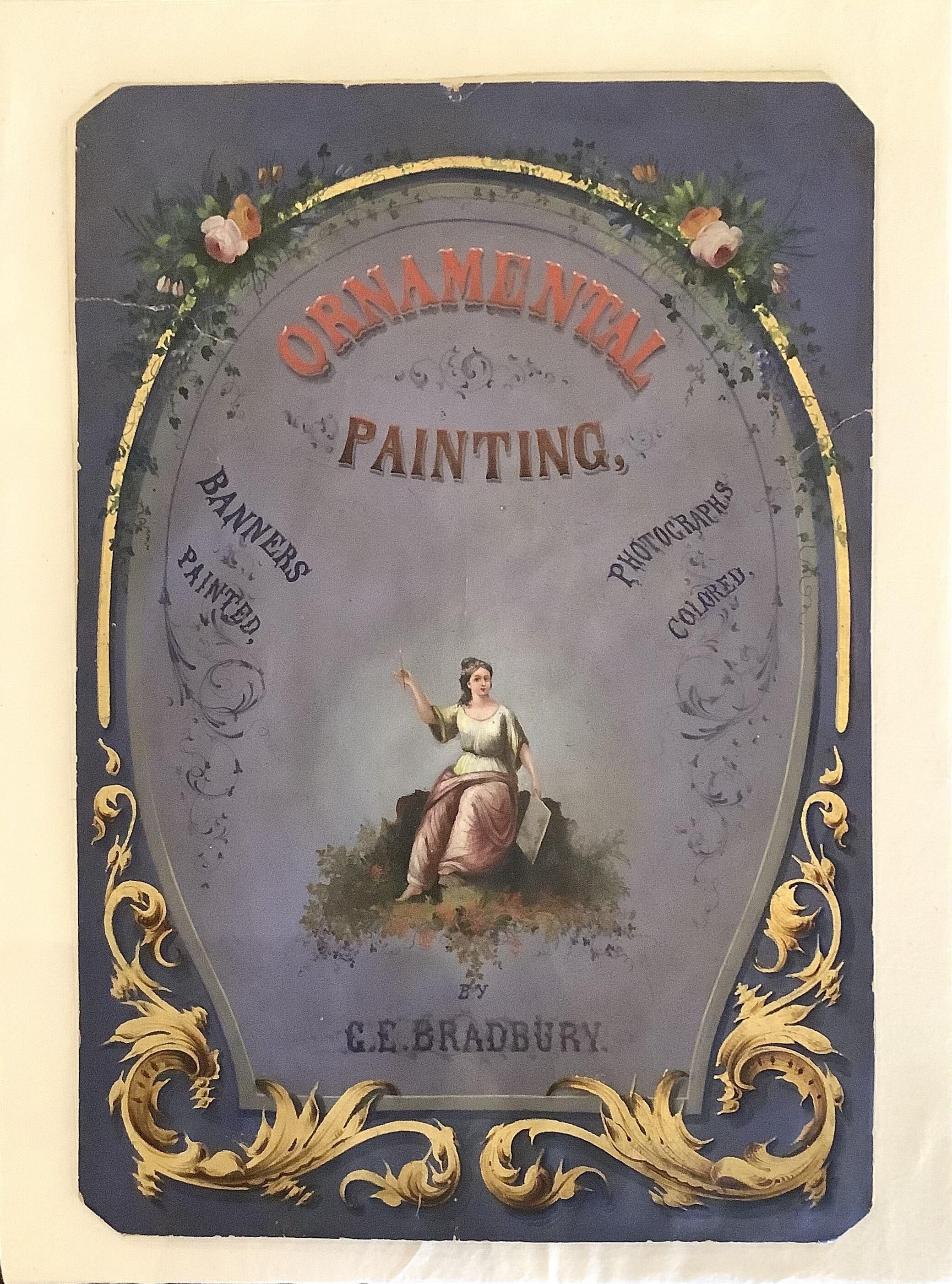 Copy of a trade sign on paper painted by Gibeon E. Bradbury, "Ornamental Painting." According to the inscription by Bradbury on the back, this is a copy of the sign that he used in 1860-1861 when he worked in Portland. The sign consists of a large blue gray horseshoe shaped cartouche with a gold foliate and floral border on a navy blue background. At the center of the cartouche is a young woman--an allegorial representation of art. Bradbury advertised "Banners painted" and "photographs colored" on his sign.Made/Created