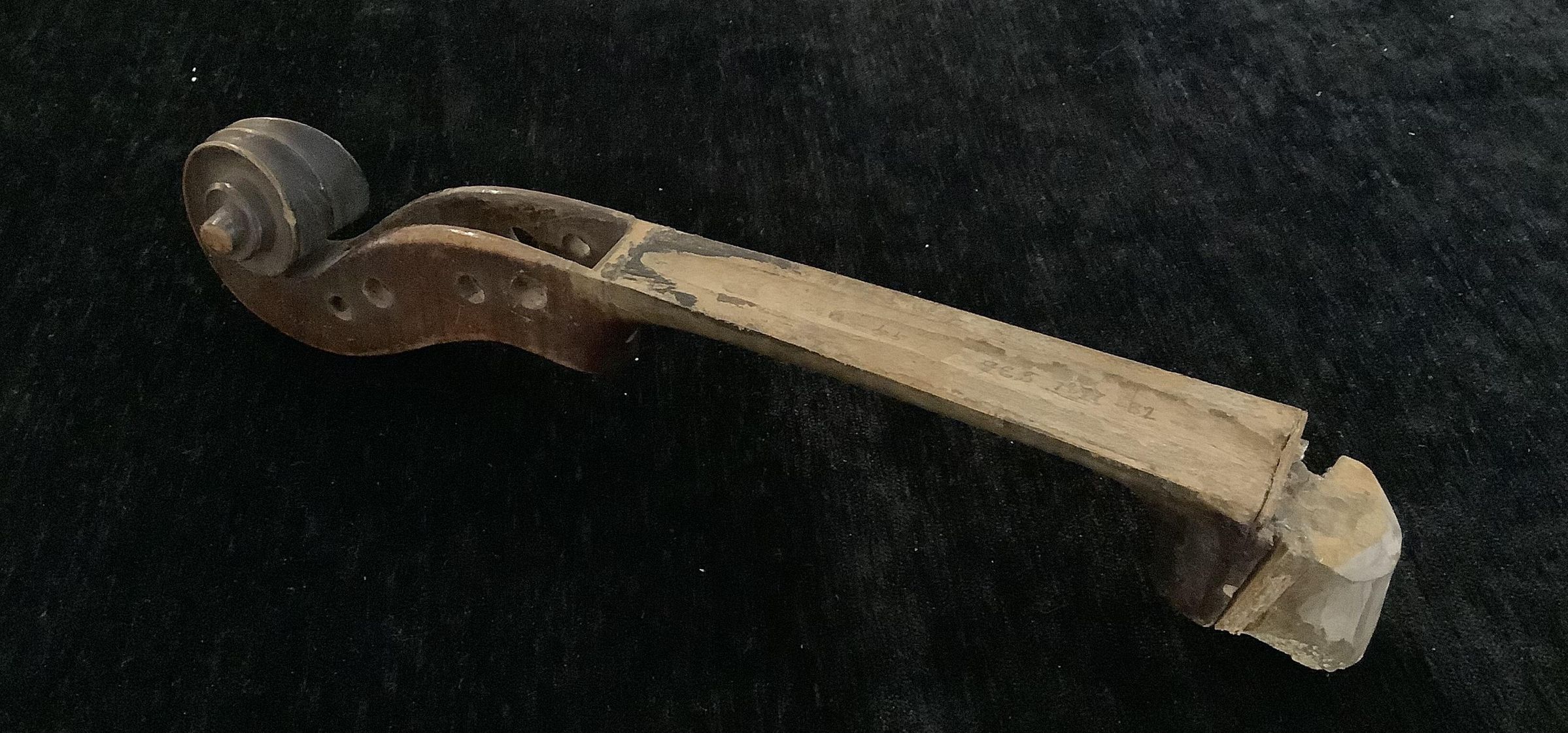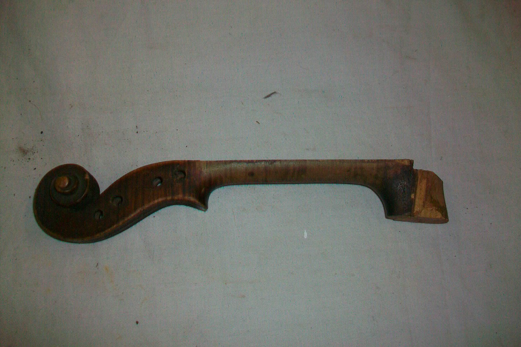 Carved fiddle neck without fingerboard or bridge or pegs. Written in pencil where the fingerboard woul have been located is: "GEB SS GEB1877 82" .