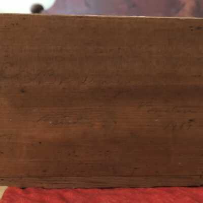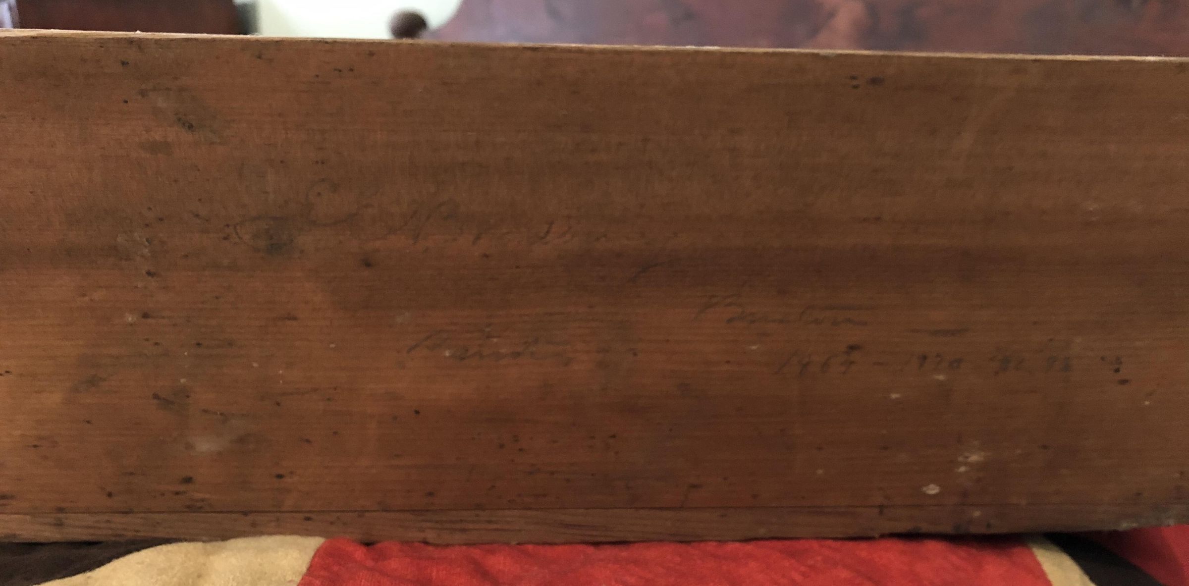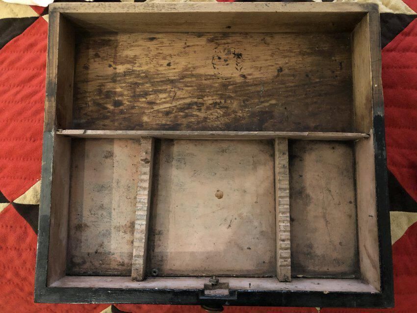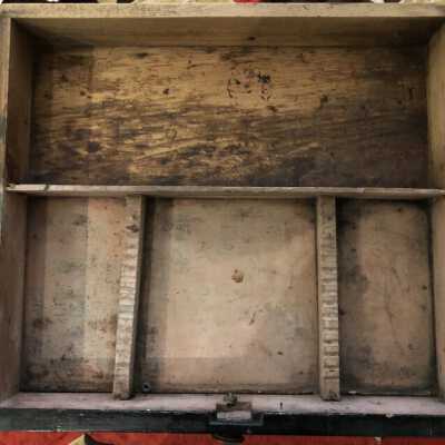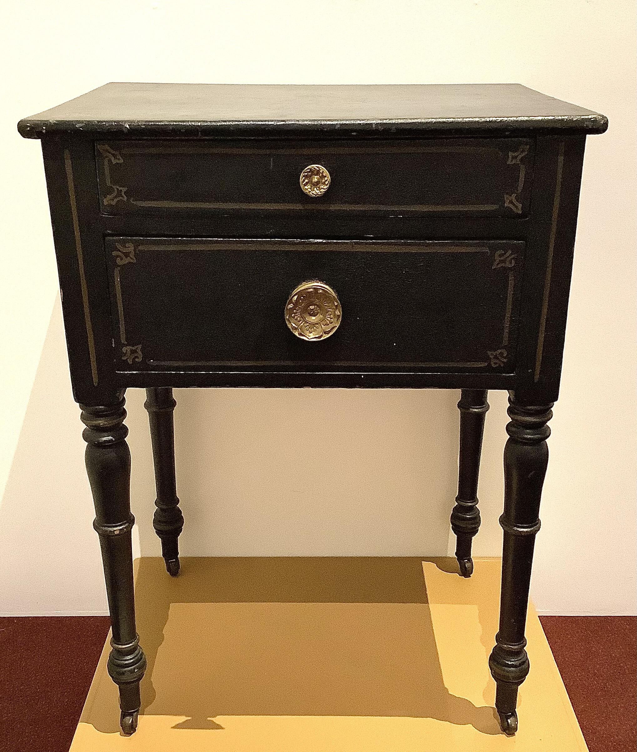 Tw drawer table, drawers fitted for painting supplies. Painted black with gold highlighting. iTurned legs with brass casters. Round brass drawer pulls. The upper drawer is fitted with a rack to hold paint brushes, the lower drawer has added dividers to hold paints and other supplies.Material