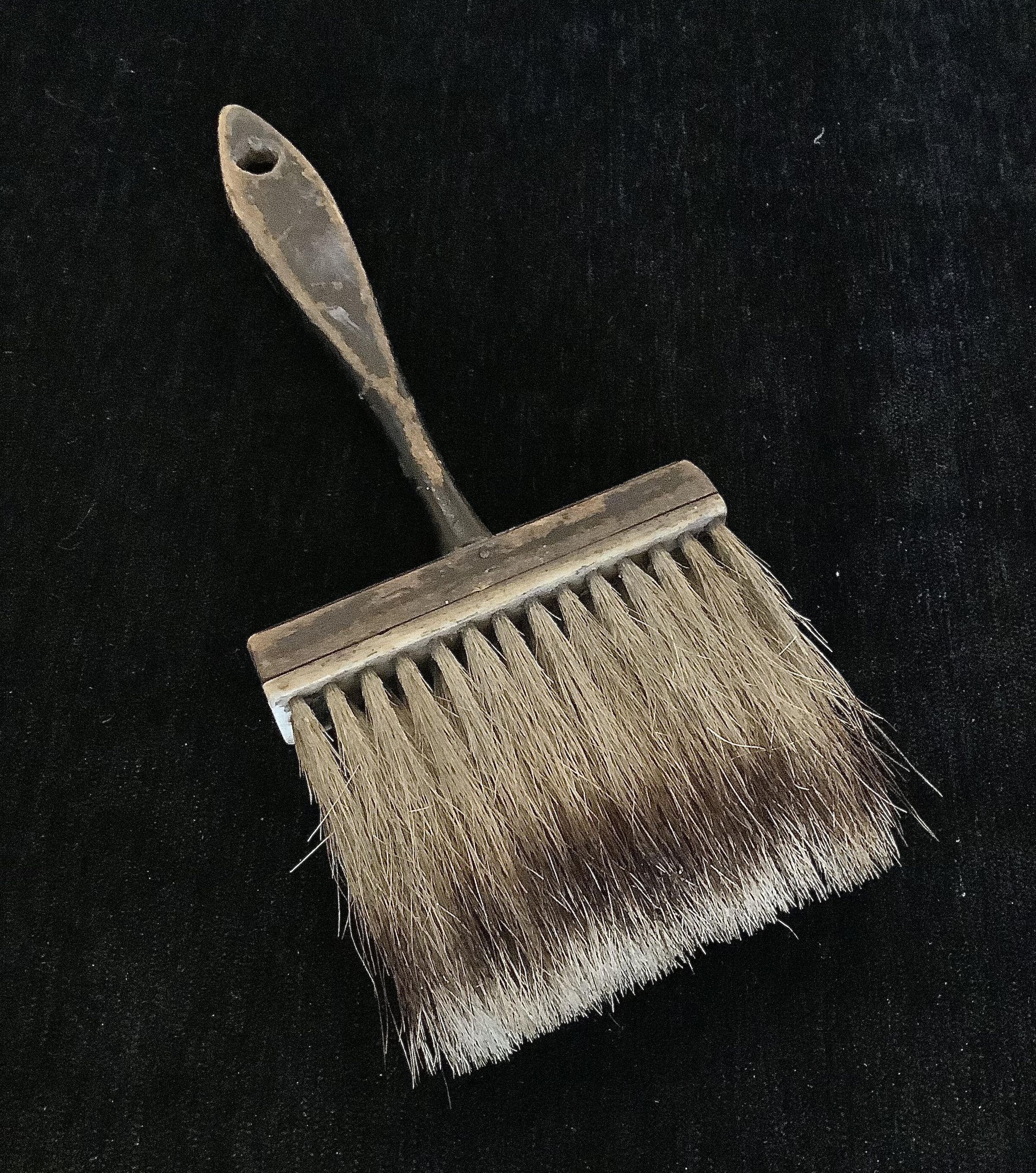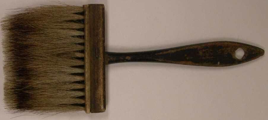 Wide flat gilding brush with badger hair bristles. The handle is painted black and has a hole for hanging.