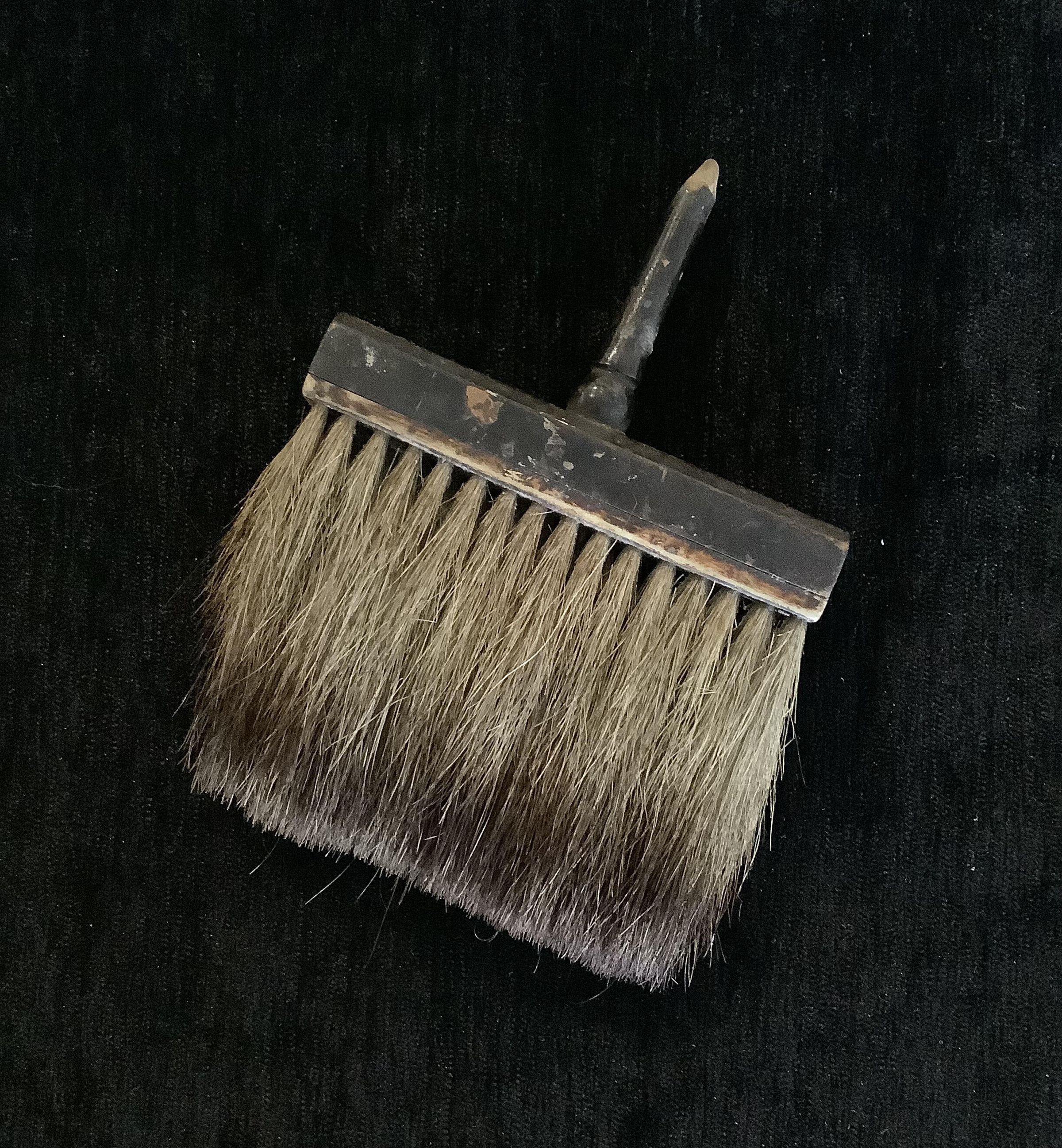 Wide flat gilding brush with badger hair bristles. The handle has been shorted int a sharp point.Dimensions