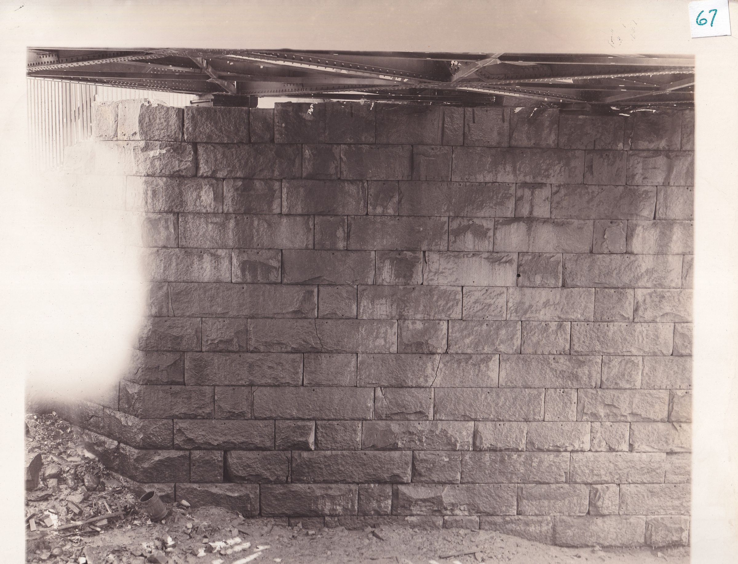 View of the stone construction holding up the Western Division of the railroad, near the intersection of Elm and Smith Streets.Made/Created
