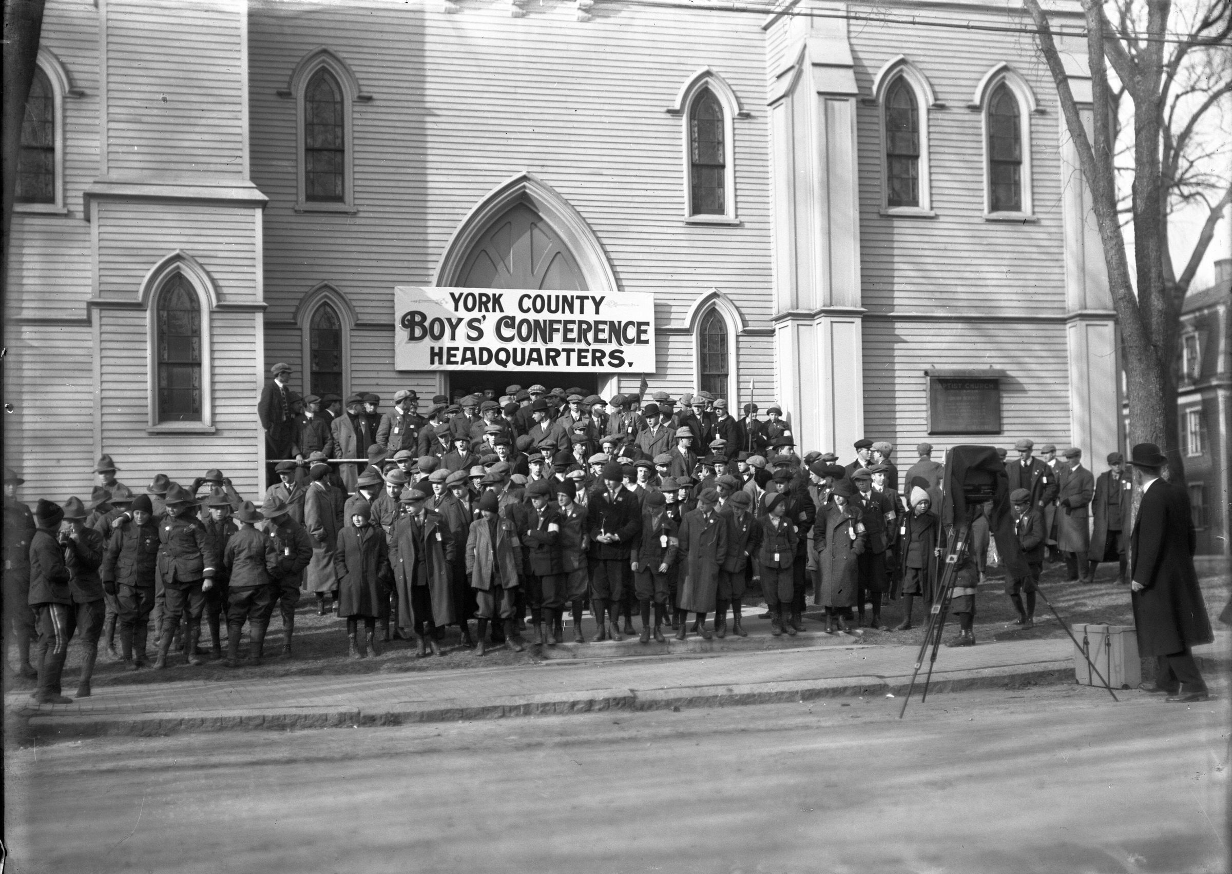 Glass plate negative photo of the "York County Boys' Conference Headquarters" at the United Baptist Church on Main Street, in Saco, Maine. A large group of boys are getting ready to pose for a group photo as a photographer stands by.