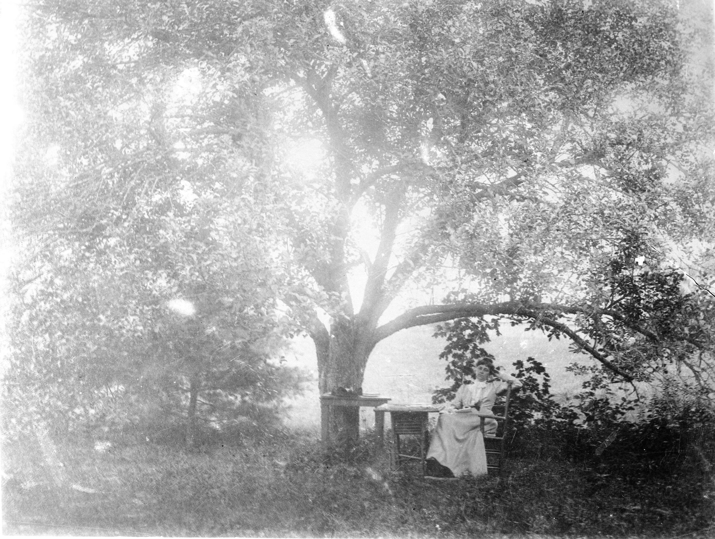 Print negative photo of Kate Douglas Wiggin sitting under a tree at her backyard at her Quillcote house.