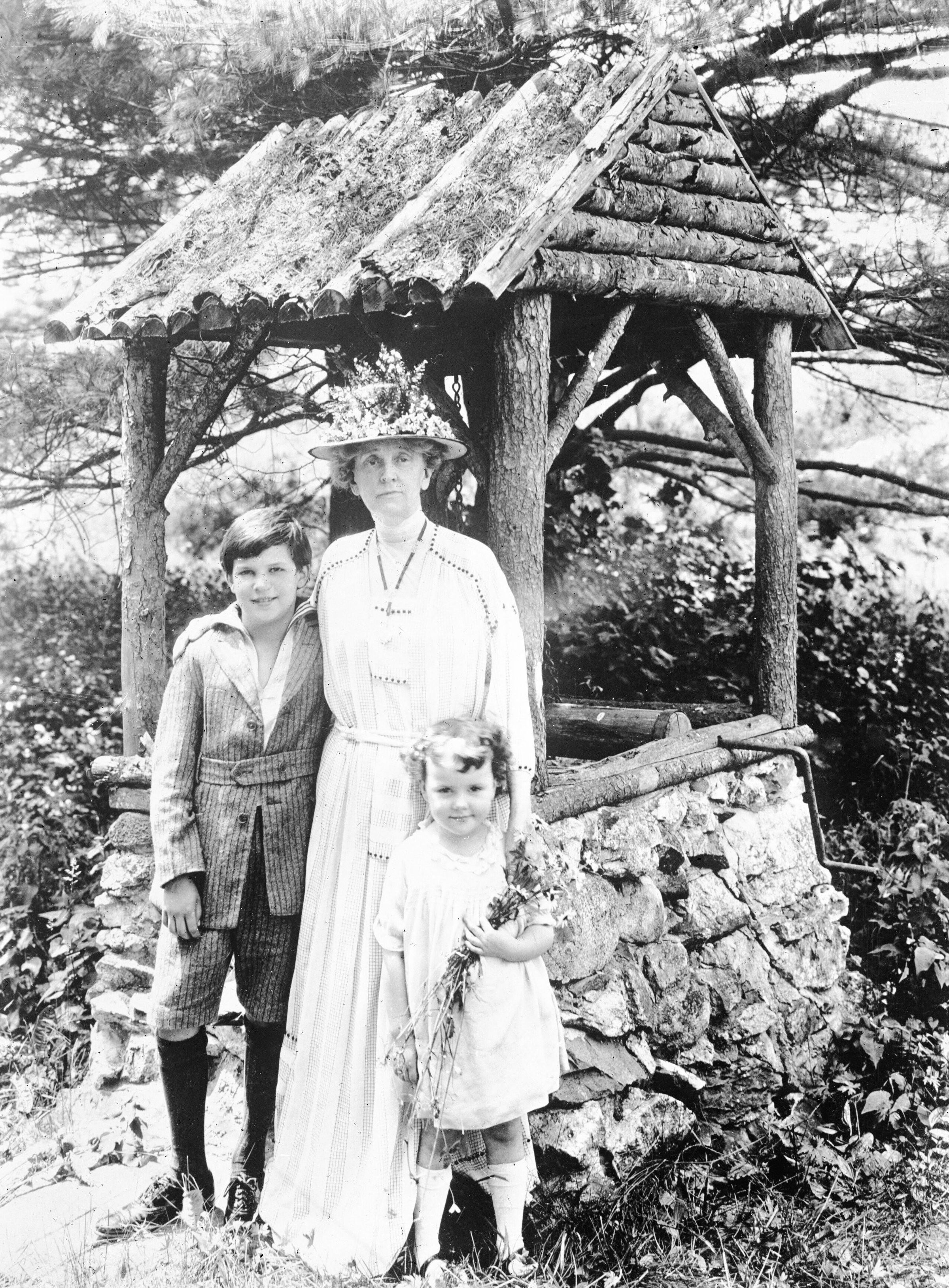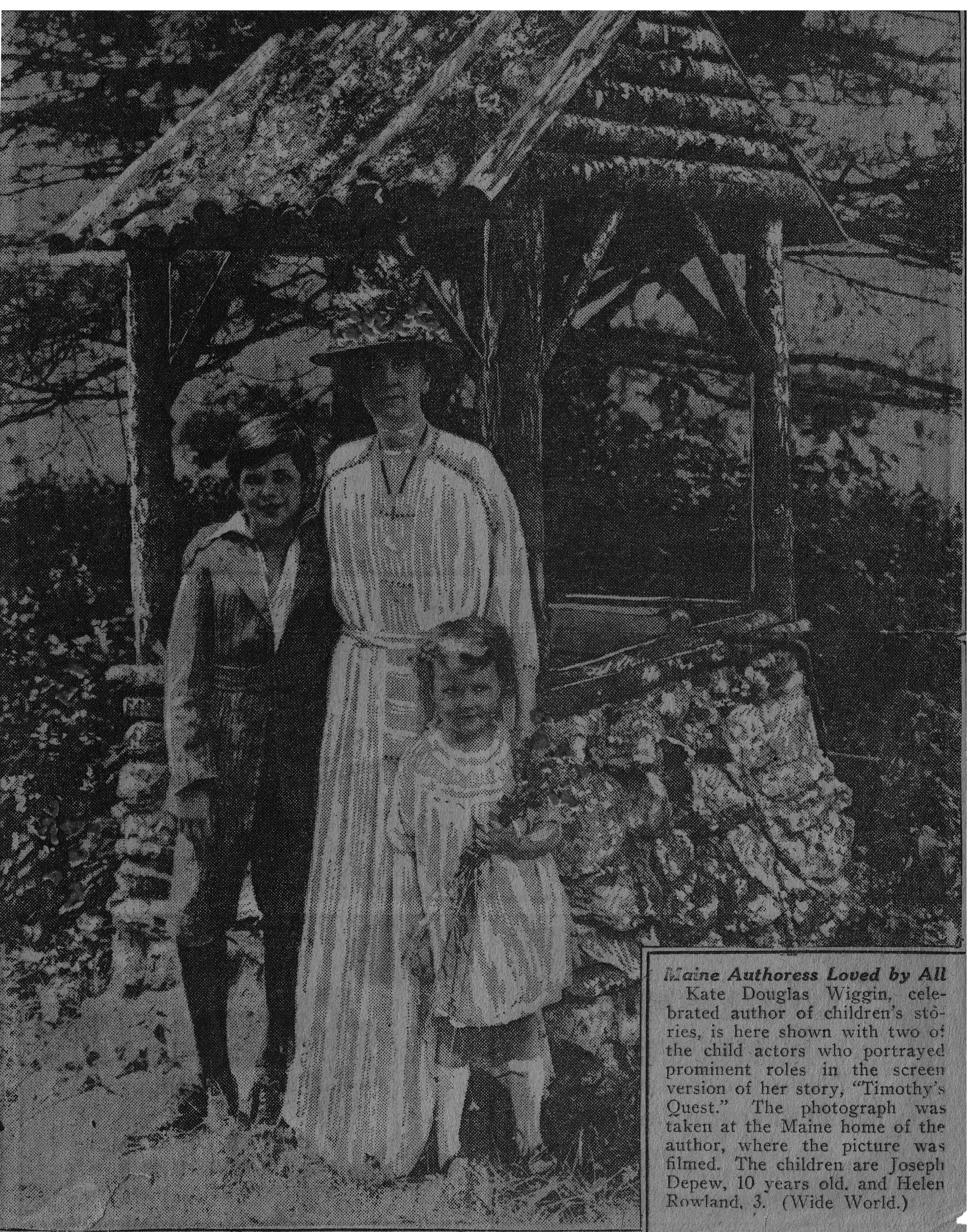 Glass plate negative photo of Kate Douglas Wiggin and two child actors. Joseph Depew and Helen Rowland starred in the big screen silent film version of Wiggin's story, "Timothy's Quest" (Dirigo Films, 1922). Joseph Depew would go on to direct 144 episodes of "The Beverly Hillbillies" from 1963 to 1969.