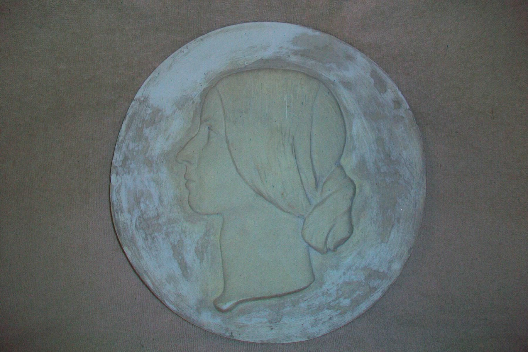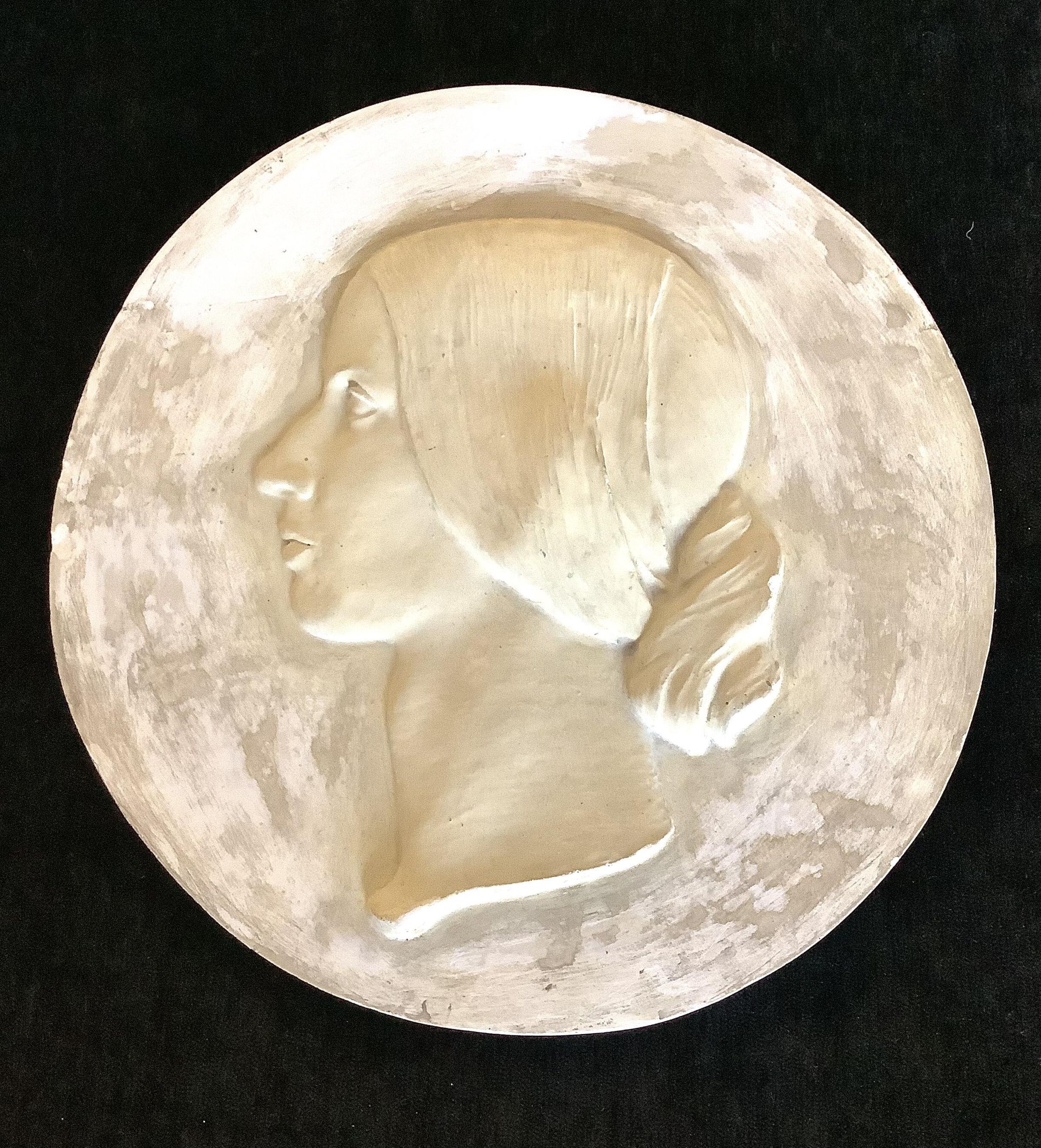 Circular plaster medallion cast bas-relief head of Jenny B. Akers Bradbury in profile facing left. Inscribed on the back: "Jennie B. Bradbury by Charles Akers / G.E.B. Jr. Feb.'07"Made/Created