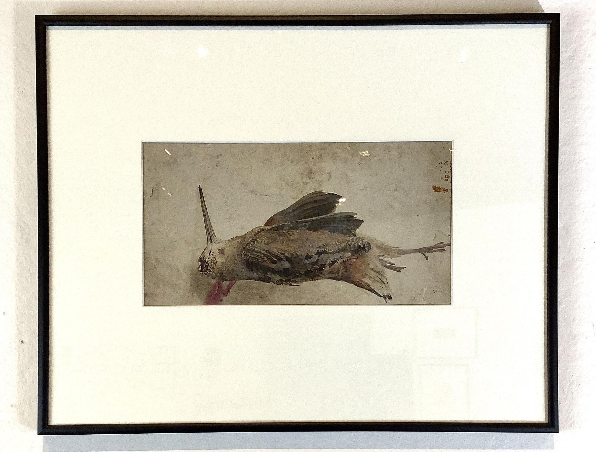 Gouache on paper study of a dead bird lying on its back; it appears to be some type of woodpecker. A wash of red that appears to represent blood is below the bird's head. Handwritten in pencil above the bird's throat: "April 6,68".Made/Created
