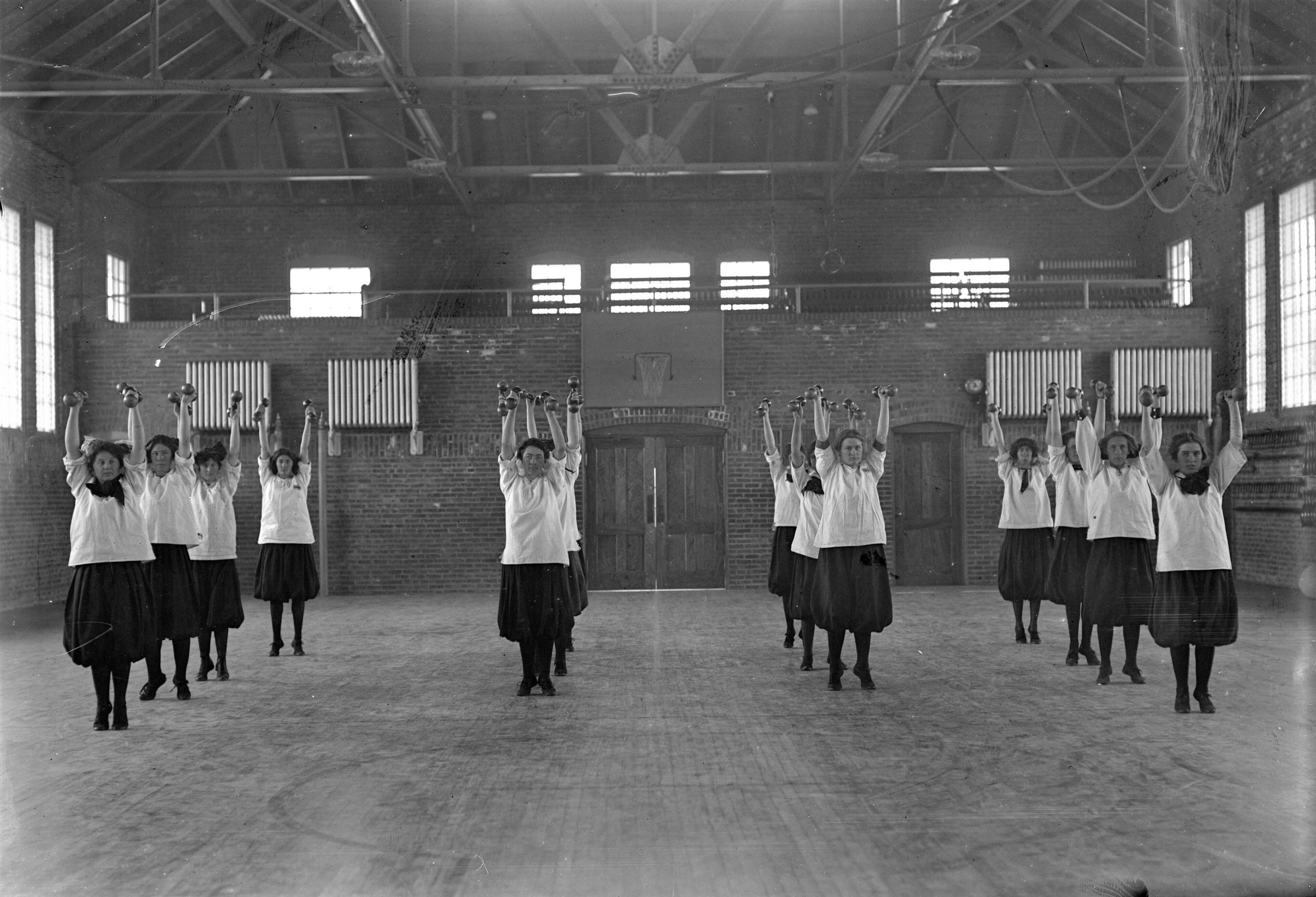 Glass plate negative photo of a group of girls training with weights at gym class at Thornton Academy. This is in the original George Addison Emery Gymnasium which was built in 1913. Today the building houses the school library.