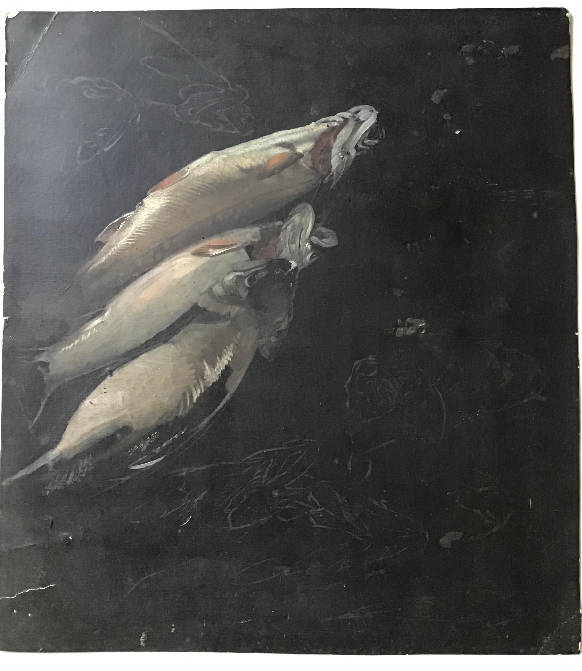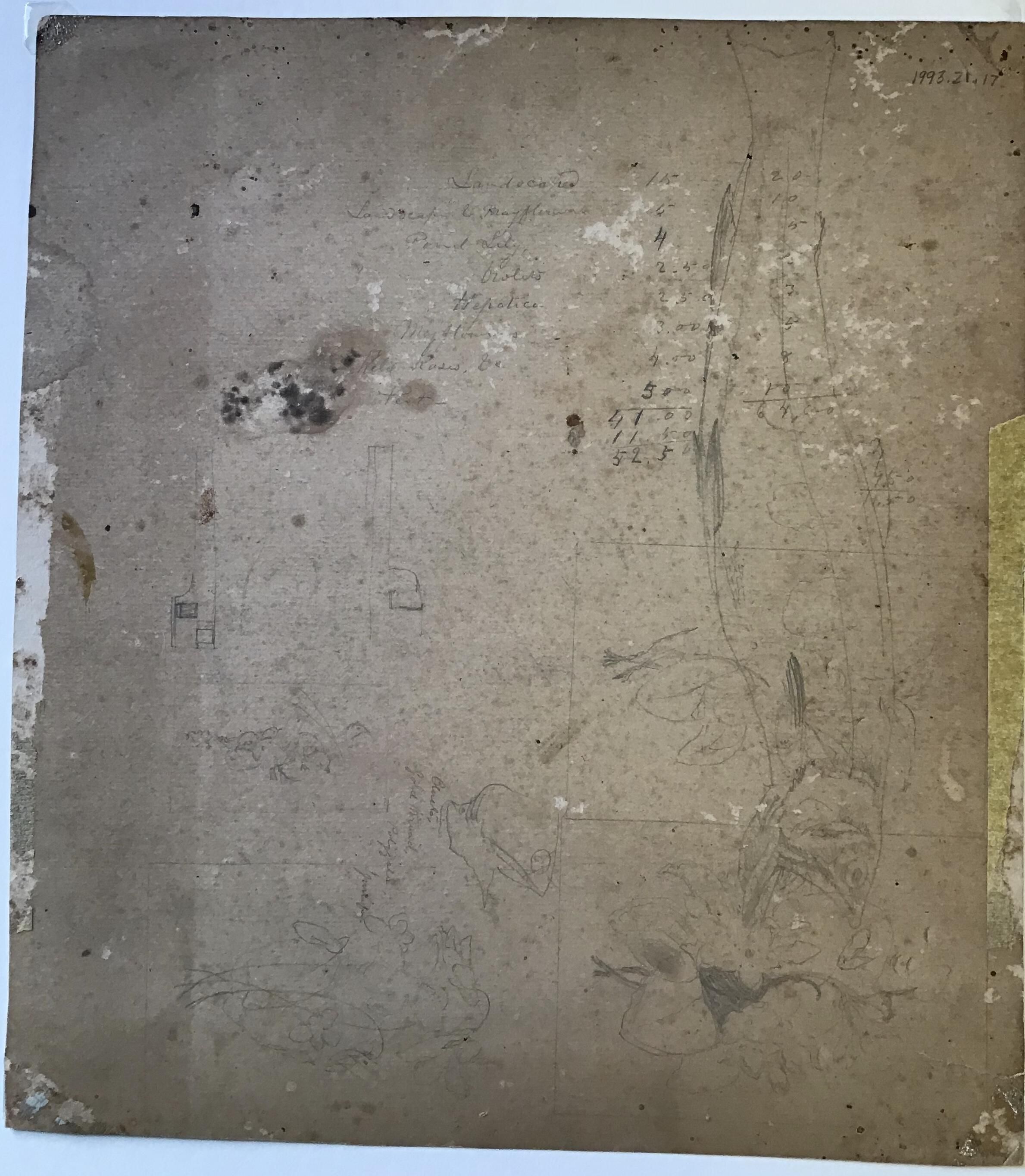 Incomplete gouache on board study of fish. Three of the fist are fully painted in, while the remainder are merely outline sketches. On the reverse are several pencil sketches as well as a short list of prices for various works including landscapes, pond lilies, violets, and mayflowers.Made/Created