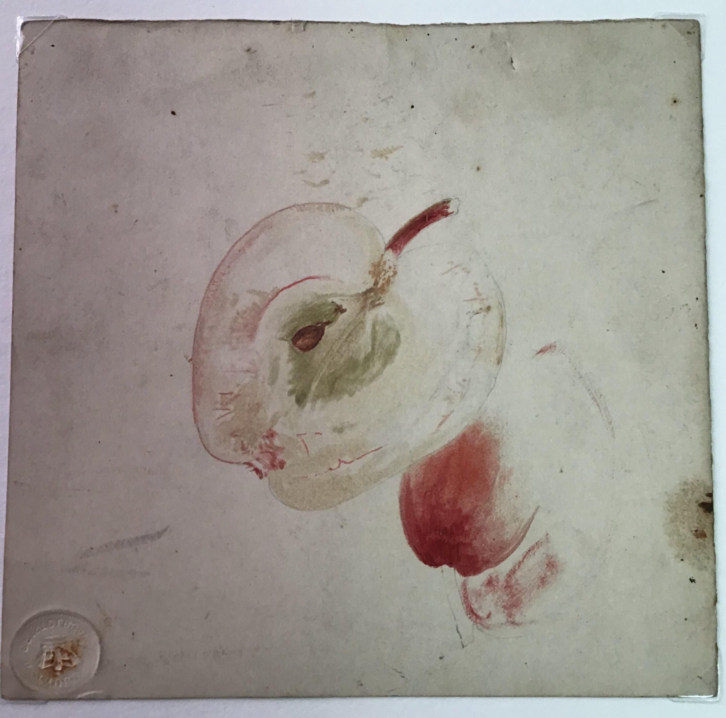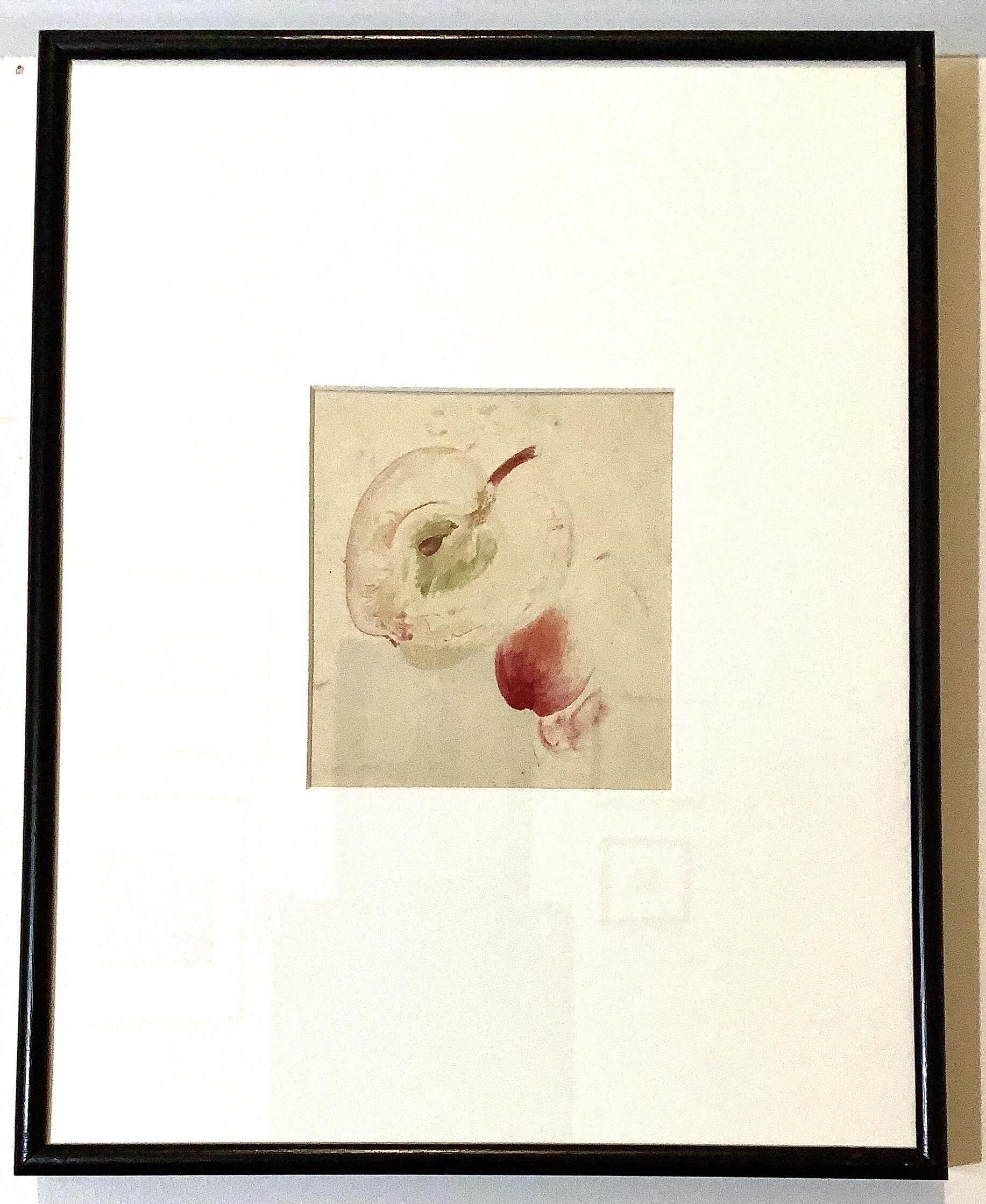 Watercolor on board study of an apple. The apple is sliced in half with the the stem intact and one seed showing. A partially sketched apple is partially obscured by the larger fruit. On the reverse, a study of a maple leaf in yellow, along with some pencil notations of numbers. Embossed mark of the maker in one corner: "REYNOLDS / BRISTOLBOARD" in a circle around a crown.Artwork Details