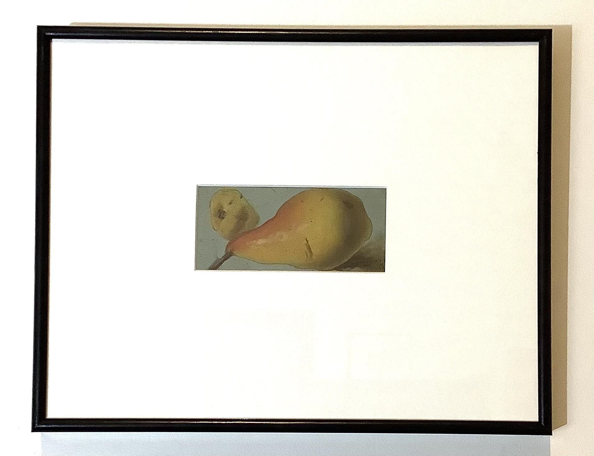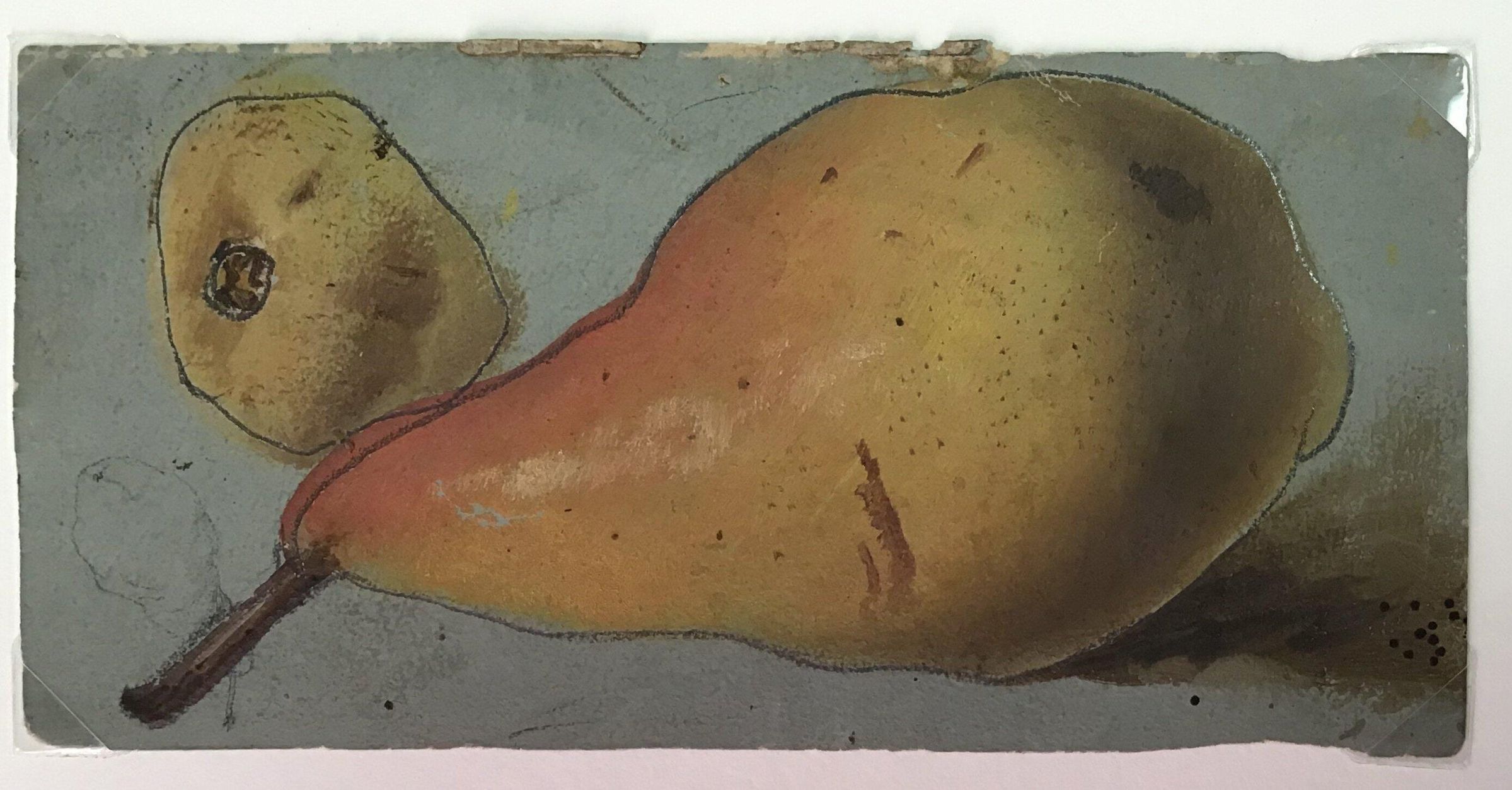 Gouache on paper of two pears. One whole pear with a stem, the other a partial, viewed from the bottom. Both outlined in graphite.Artwork Details