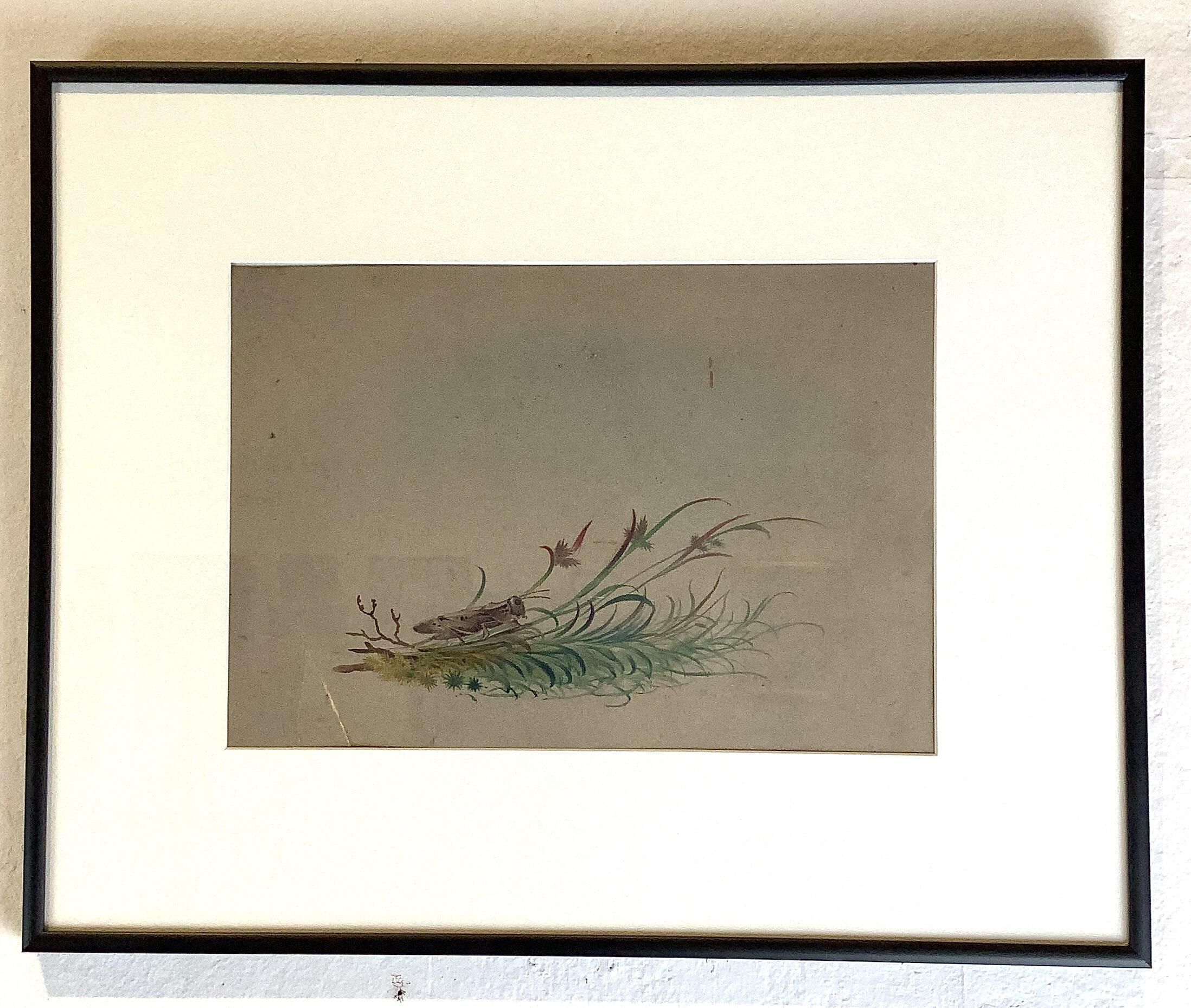 Gouache on board titled "Spring." A grasshopper sits perched on frontds of grass. Written in ink on the reverse: "Spring. / GEB / 74" (the last in pencil).Made/Created