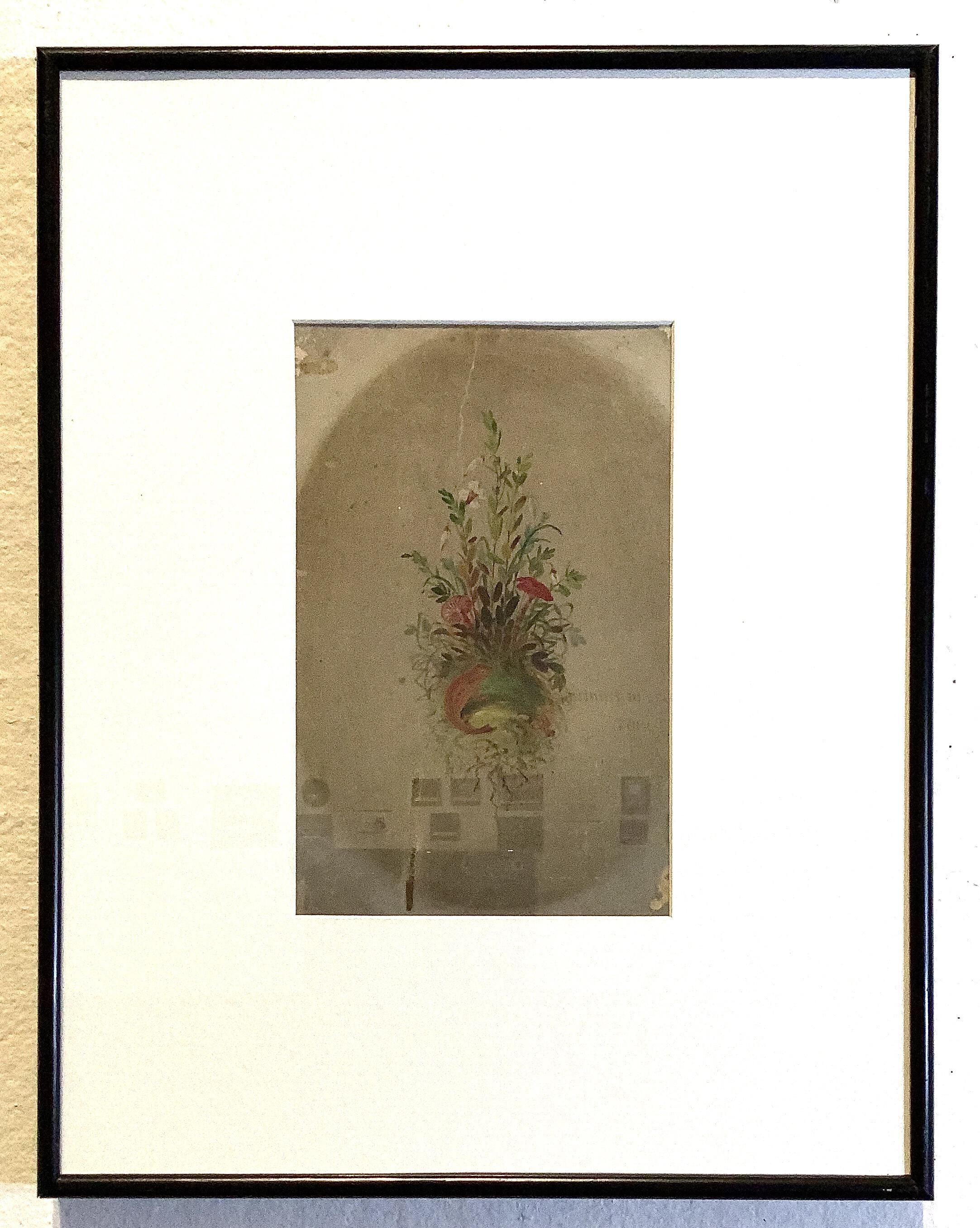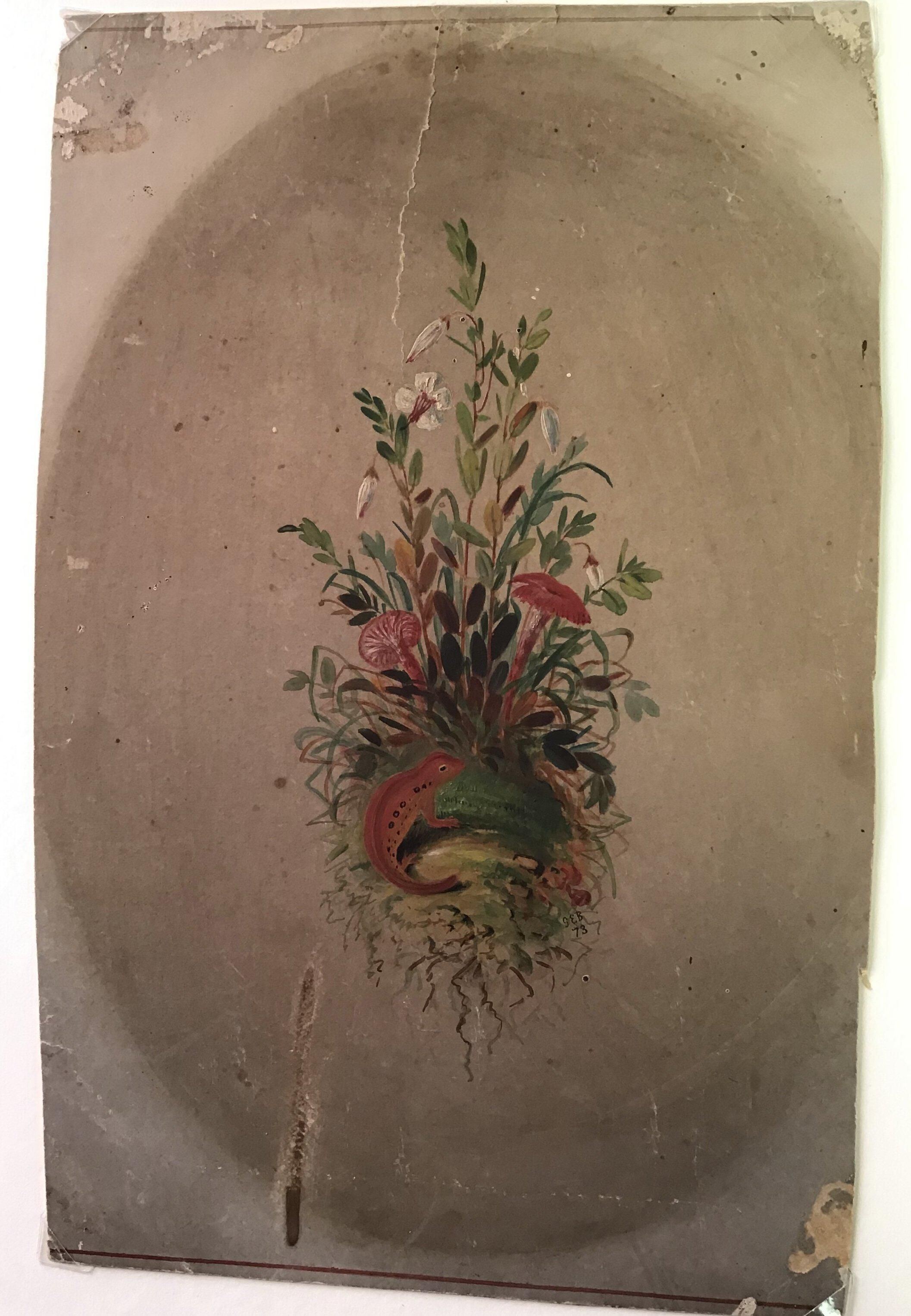 Gouache on board painting of a wildflower grouping with a small red salamander at the bottom left. Originally framed in an oval frame.Made/Created