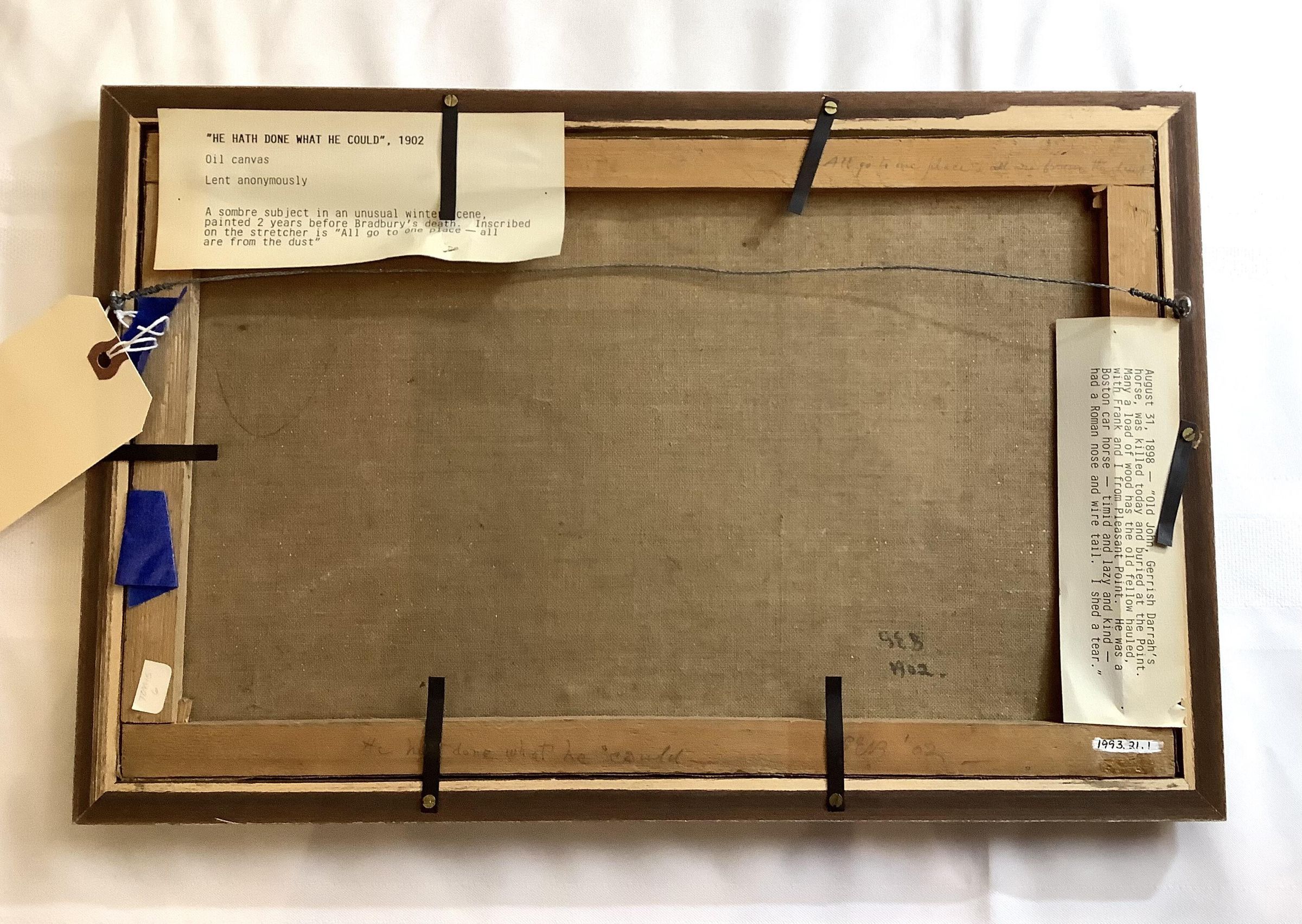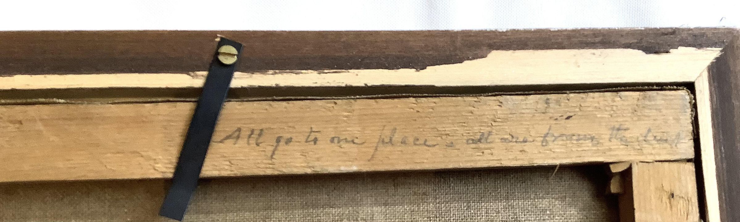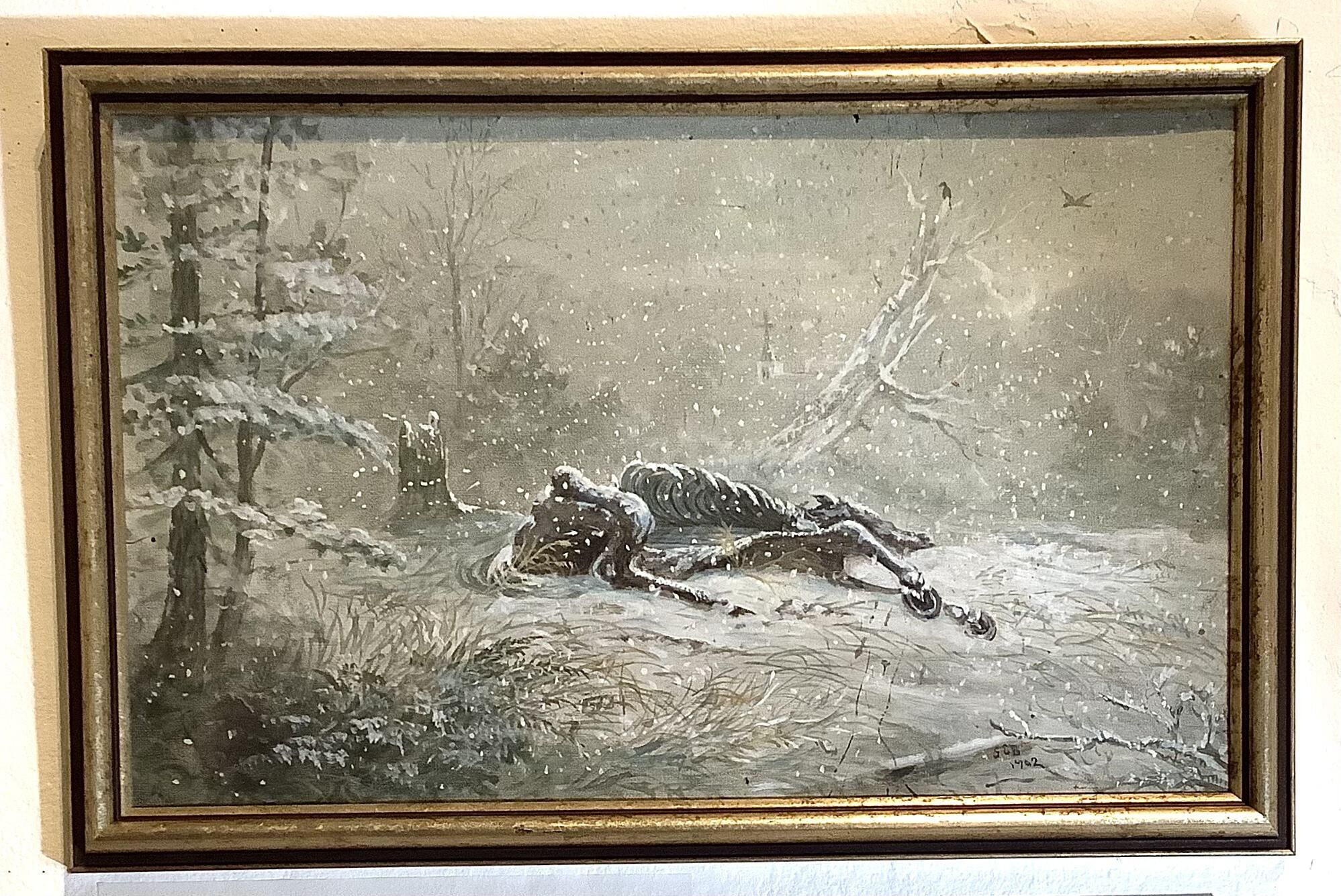 Oil on canvas somber winter scene painted mostly in greenish grays and white. The carcass of a horse lies on its side in the snowy woods. A soft snow is falling and the steeple of a church can be seen in the center distance. Inscribed in pencil on the stretchers are "All go to one place / all are from the dust."Made/Created
