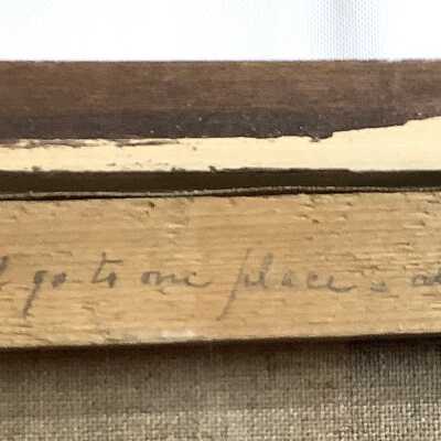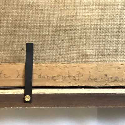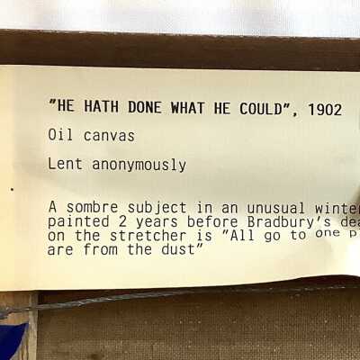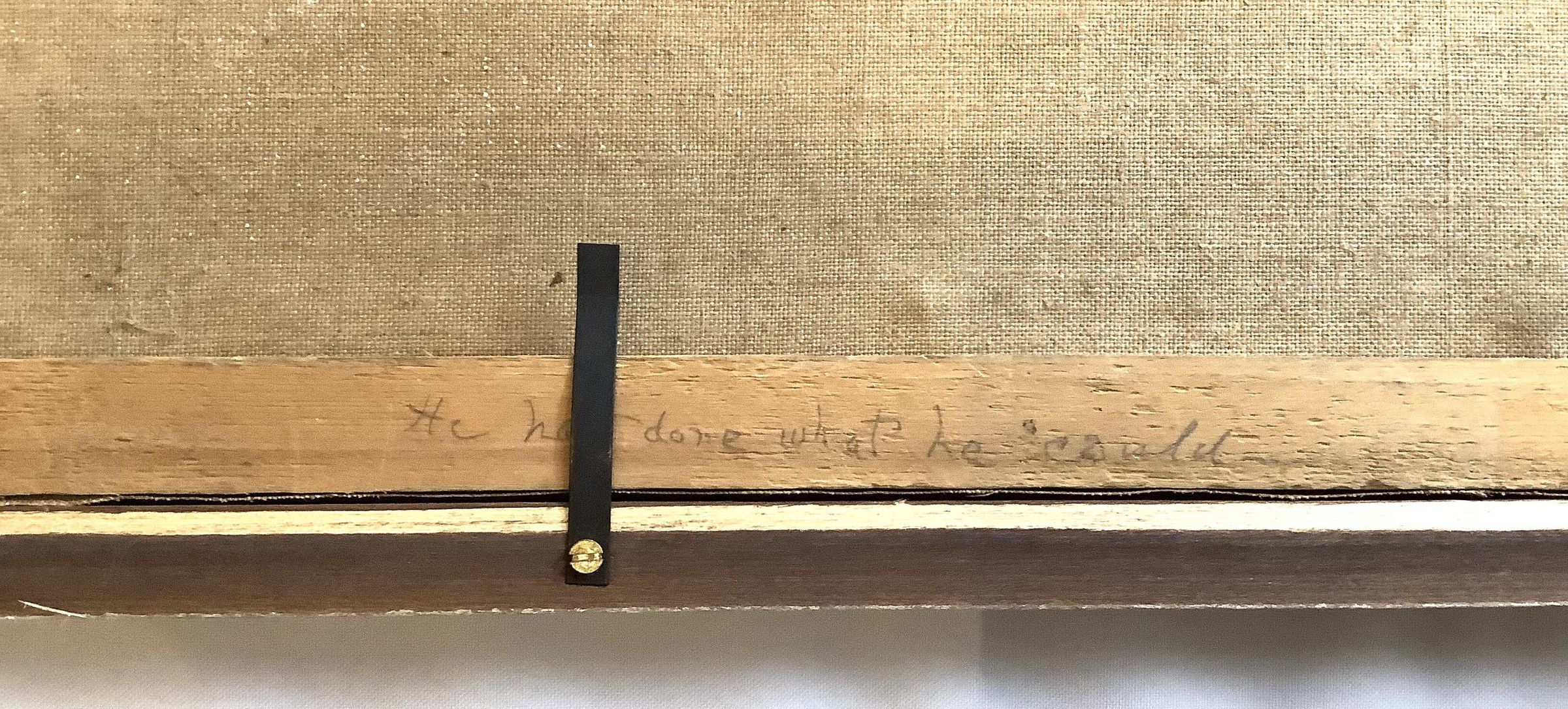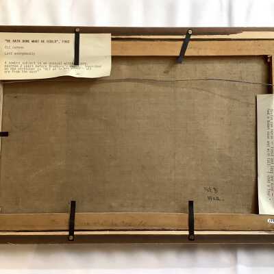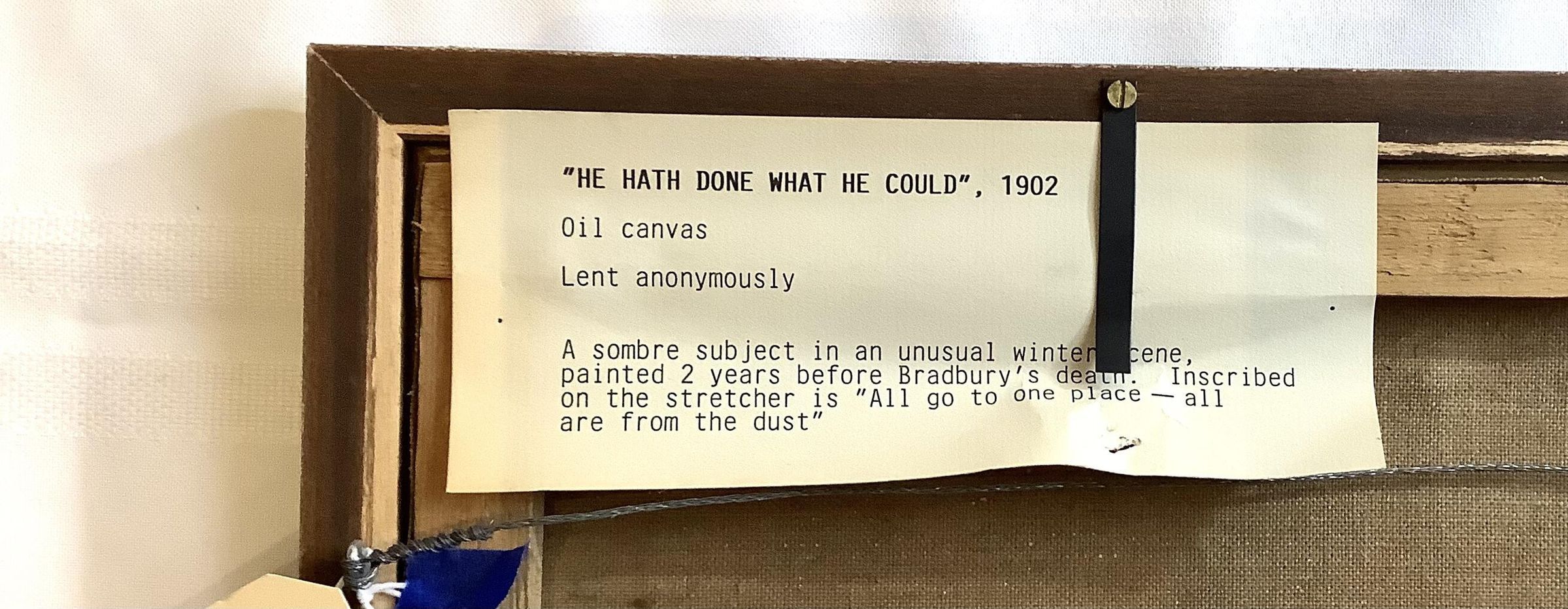 Oil on canvas somber winter scene painted mostly in greenish grays and white. The carcass of a horse lies on its side in the snowy woods. A soft snow is falling and the steeple of a church can be seen in the center distance. Inscribed in pencil on the stretchers are "All go to one place / all are from the dust."Made/Created